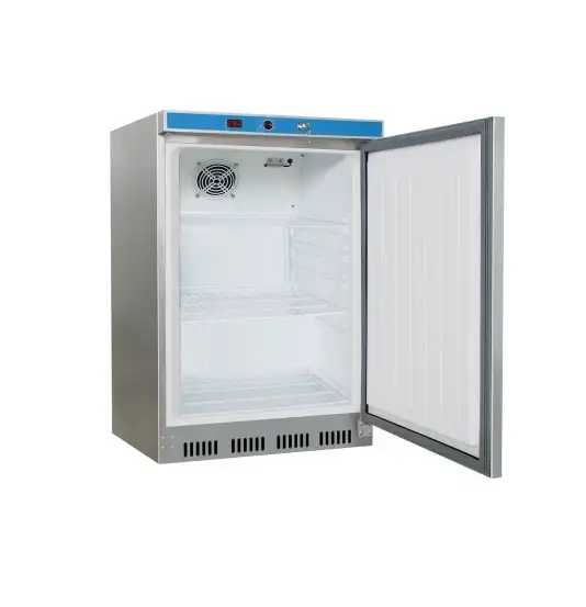 Frigider cu design modern, realizat din tablă metalică cu acoperire în pulbere albă și interior din plastic ABS. Are o capacitate de 129 litri, funcționează silențios și asigură o circulație forțată a aerului pentru temperatură uniformă. Este echipat cu 3 polițe rezistente și control electronic cu afișaj digital al temperaturii.