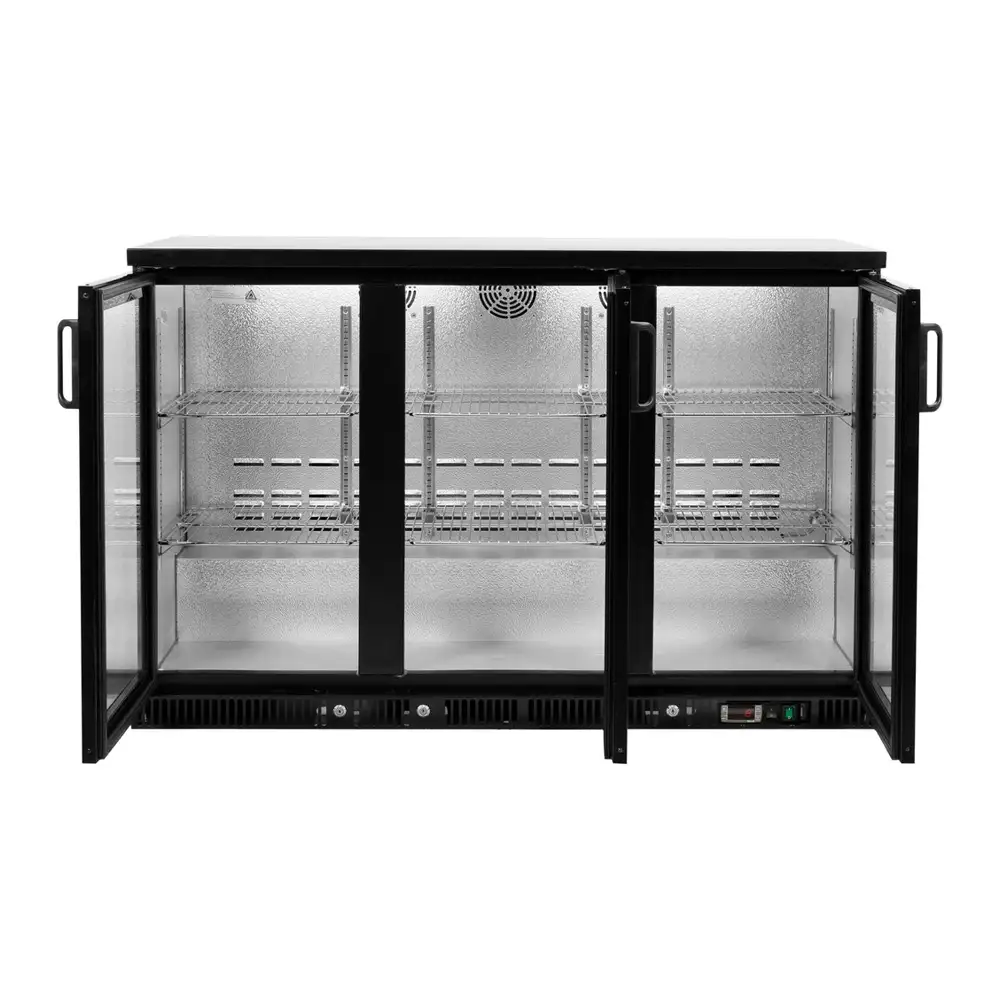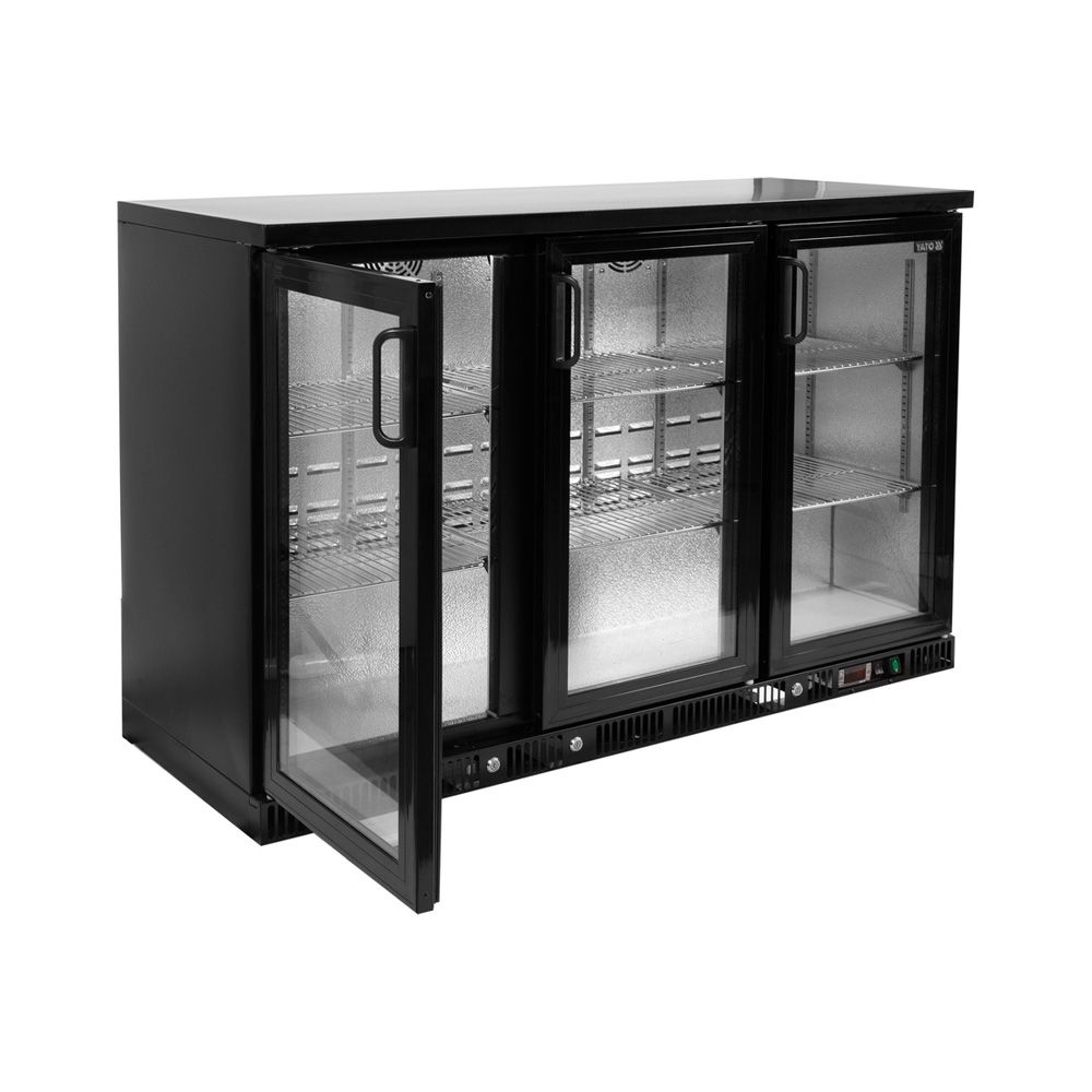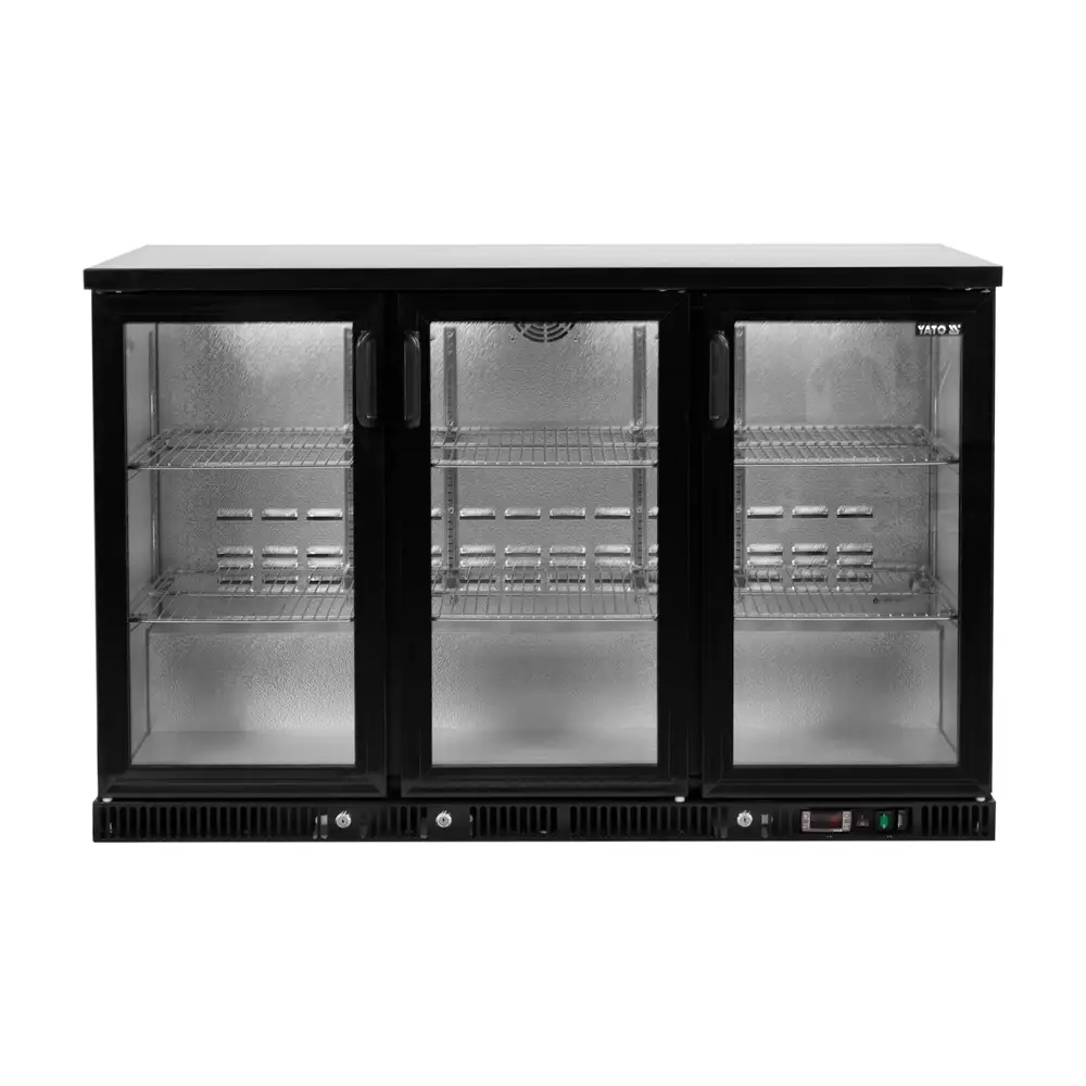 Dulap frigorific/vitrină pentru sticle YATO, cu 2 uși culisante din sticlă călită, capacitate 227 L, dimensiuni 920x515x905 mm și greutate 102 kg. Funcționează la 230 V / 200 W, cu interval de temperatură +2...+8 °C. Echipat cu 4 rafturi cromate (835x350 mm), iluminare LED 8 W și control electronic Dixell cu afișaj digital.