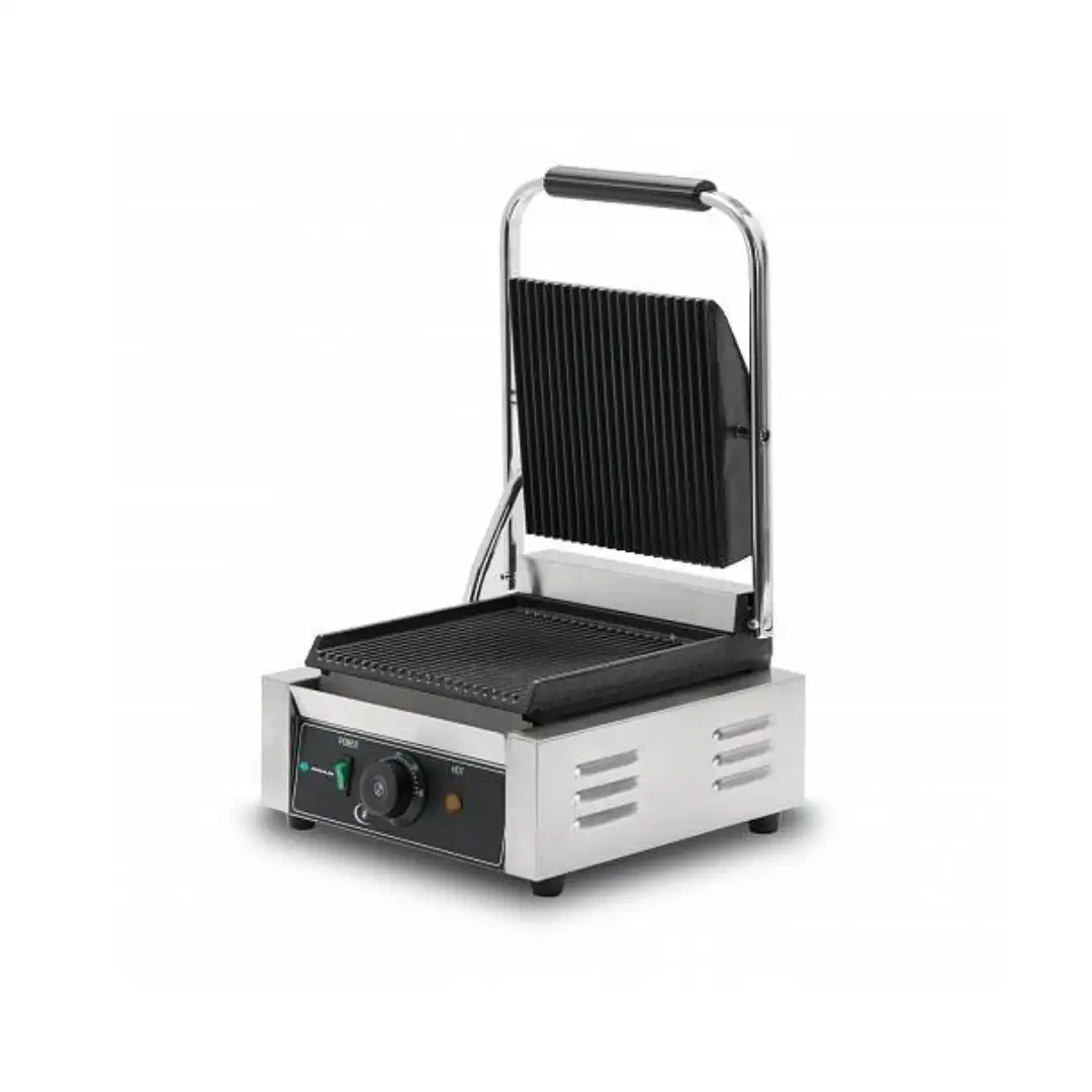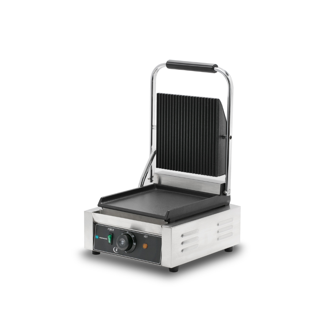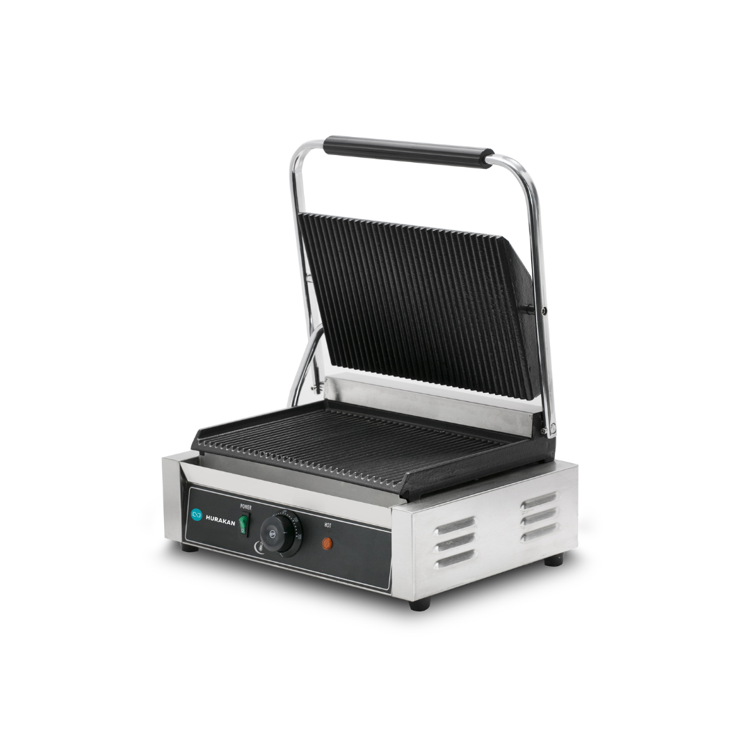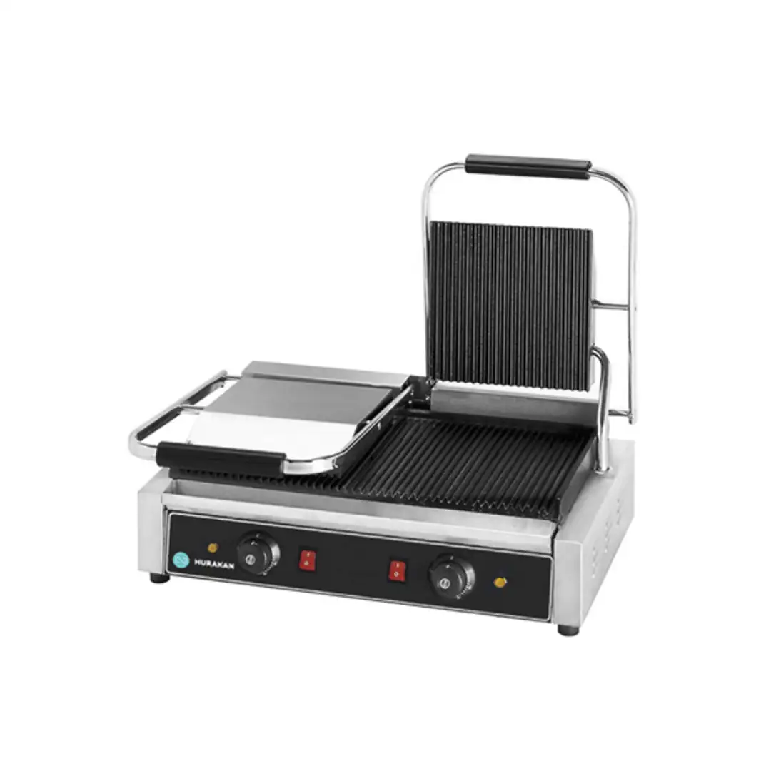Grătarul de contact Hurakan HKN-PE22L (art. H159876) este un grătar profesional de masă, echipat cu plăci de gătire din fontă emailată: placă inferioară fixă de 220×230 mm și placă superioară mobilă de 215×215 mm. Funcționează la 230 V și are un interval de temperatură 50–300 °C.