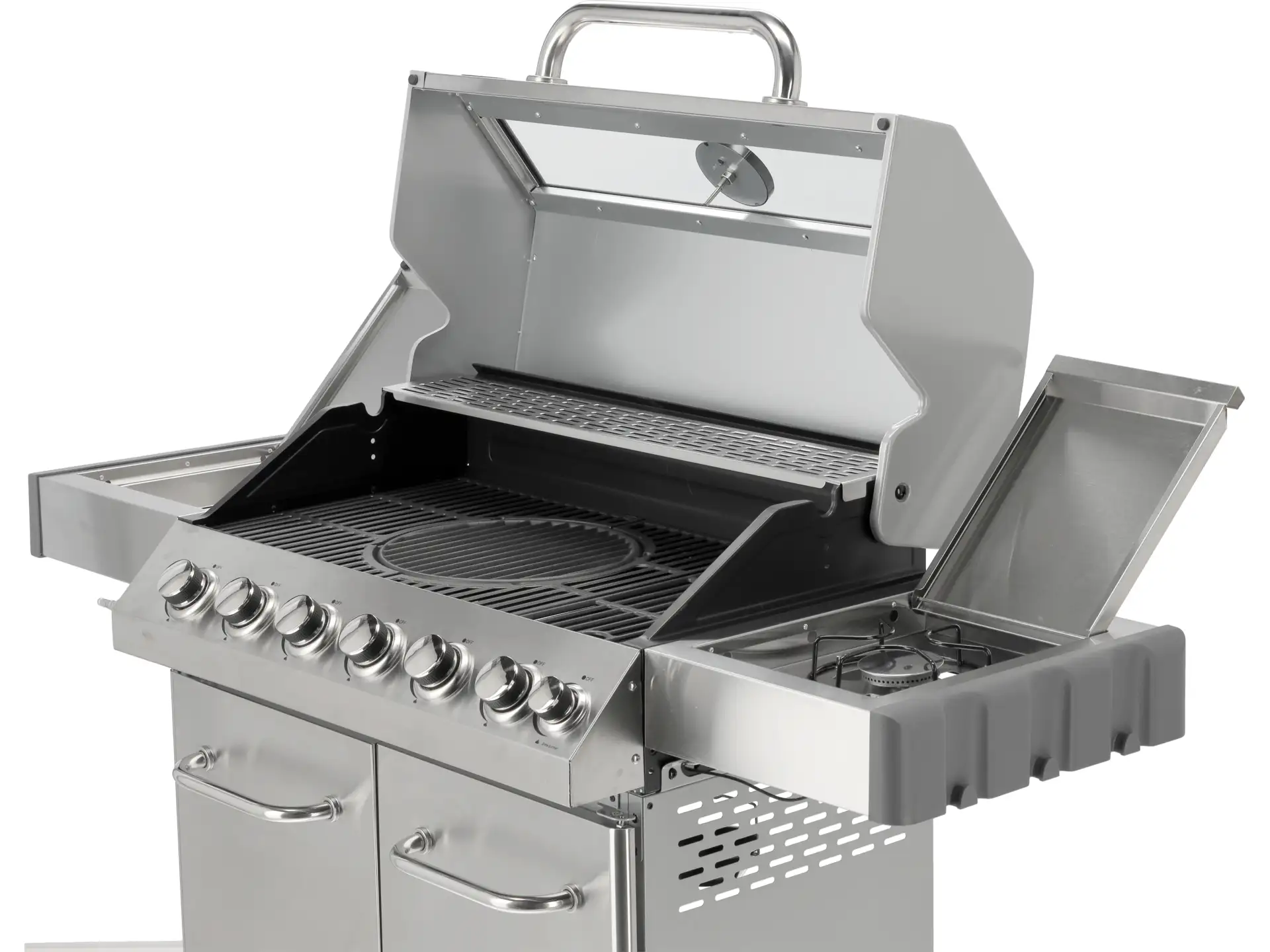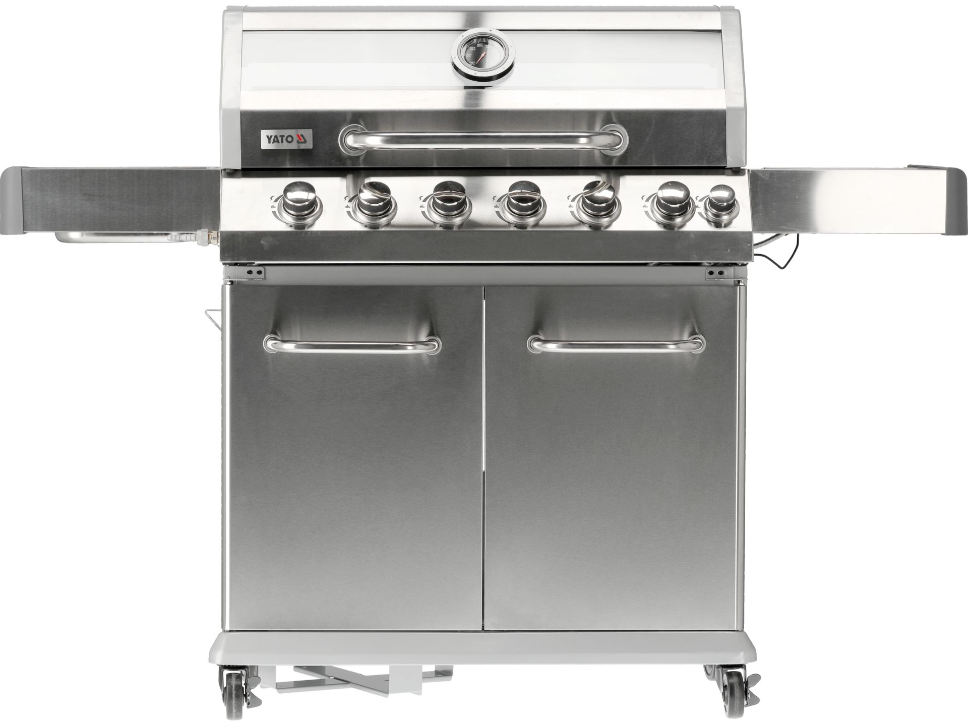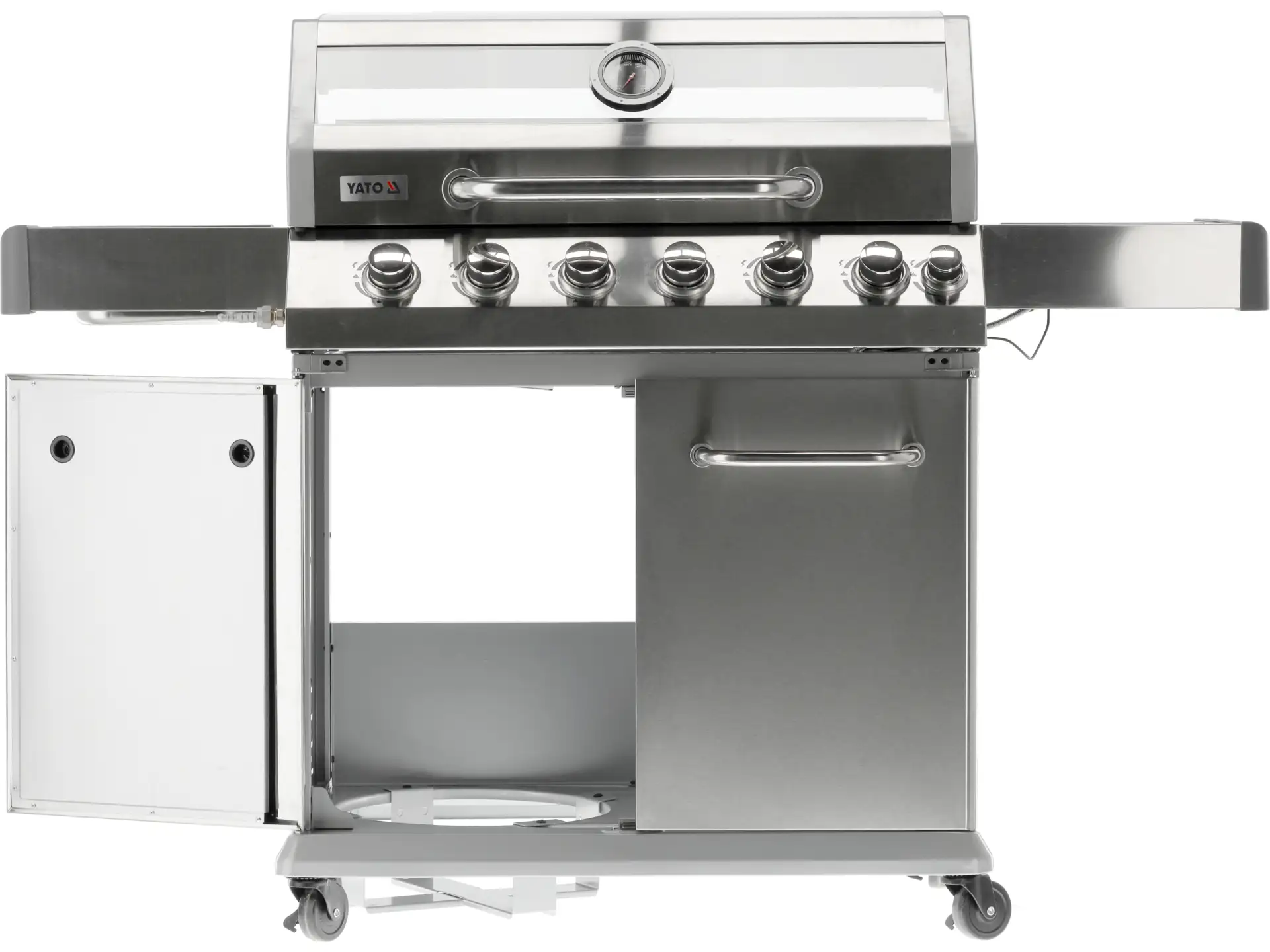 Grătarul pe gaz YATO ZUSHI 6+1, cu o putere totală de 20,2 kW, este un echipament de gătit portabil, ideal pentru utilizare în aer liber. Construit din oțel inoxidabil 430 și oțel acoperit cu pulbere, acesta oferă durabilitate și rezistență la coroziune. Dimensiunile grătarului sunt 1440x570x1120 mm, având o greutate de 39,5 kg. Echipat cu șapte arzătoare (șase principale și unul suplimentar), fiecare cu un diametru al duzei de 0,8 mm pentru arzătoarele principale și 0,7 mm pentru cel suplimentar, grătarul asigură o distribuție uniformă a căldurii. Suprafața de gătit este formată din trei grătare mari din fontă, cu dimensiunile totale de 780x420 mm. Grătarul dispune de patru roți cu frână pentru o mobilitate ușoară și stabilitate în timpul utilizării. Alte caracteristici includ un raft integrat, un termometru pentru monitorizarea temperaturii interne, o grilă de încălzire și o tavă detașabilă pentru colectarea grăsimii. Grătarul funcționează cu butan G30 sau propan G31, având un consum de gaz de 1468 g/h și o presiune a gazului de 37 mbar. Este important de menționat că grătarul nu dispune de mâner lateral, cenușar, obloane de control al circulației aerului, afumătoare sau aprindere în buton. Dimensiunile dulapului integrat sunt de 820x440x550/560 mm, oferind spațiu suplimentar pentru depozitare.