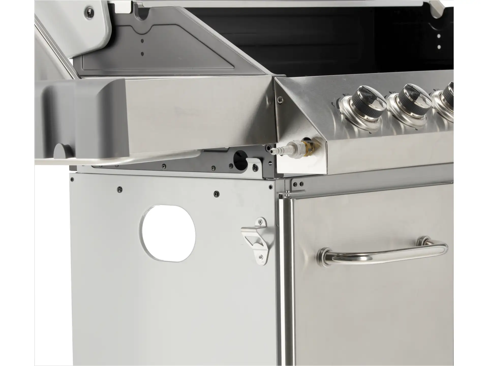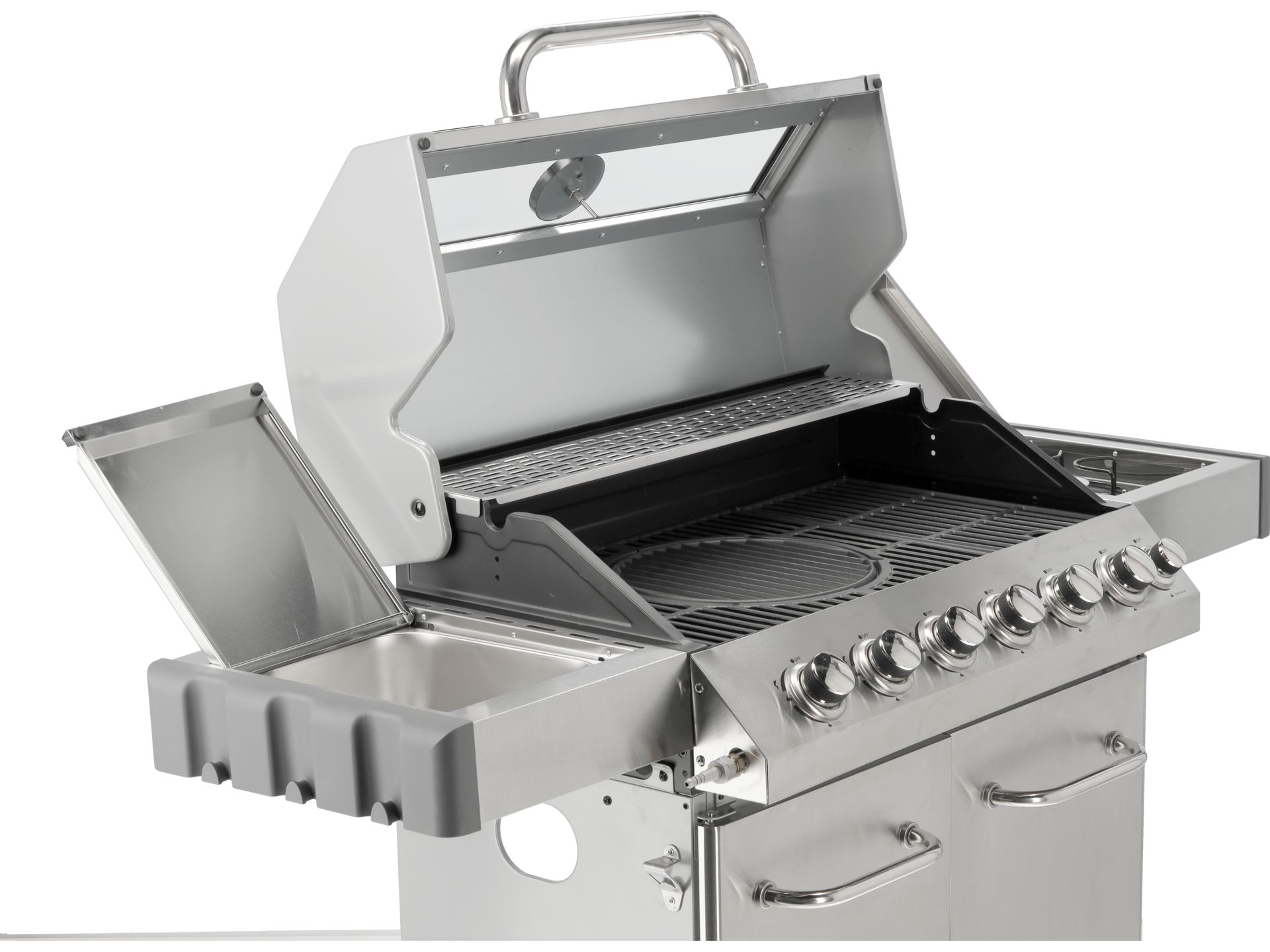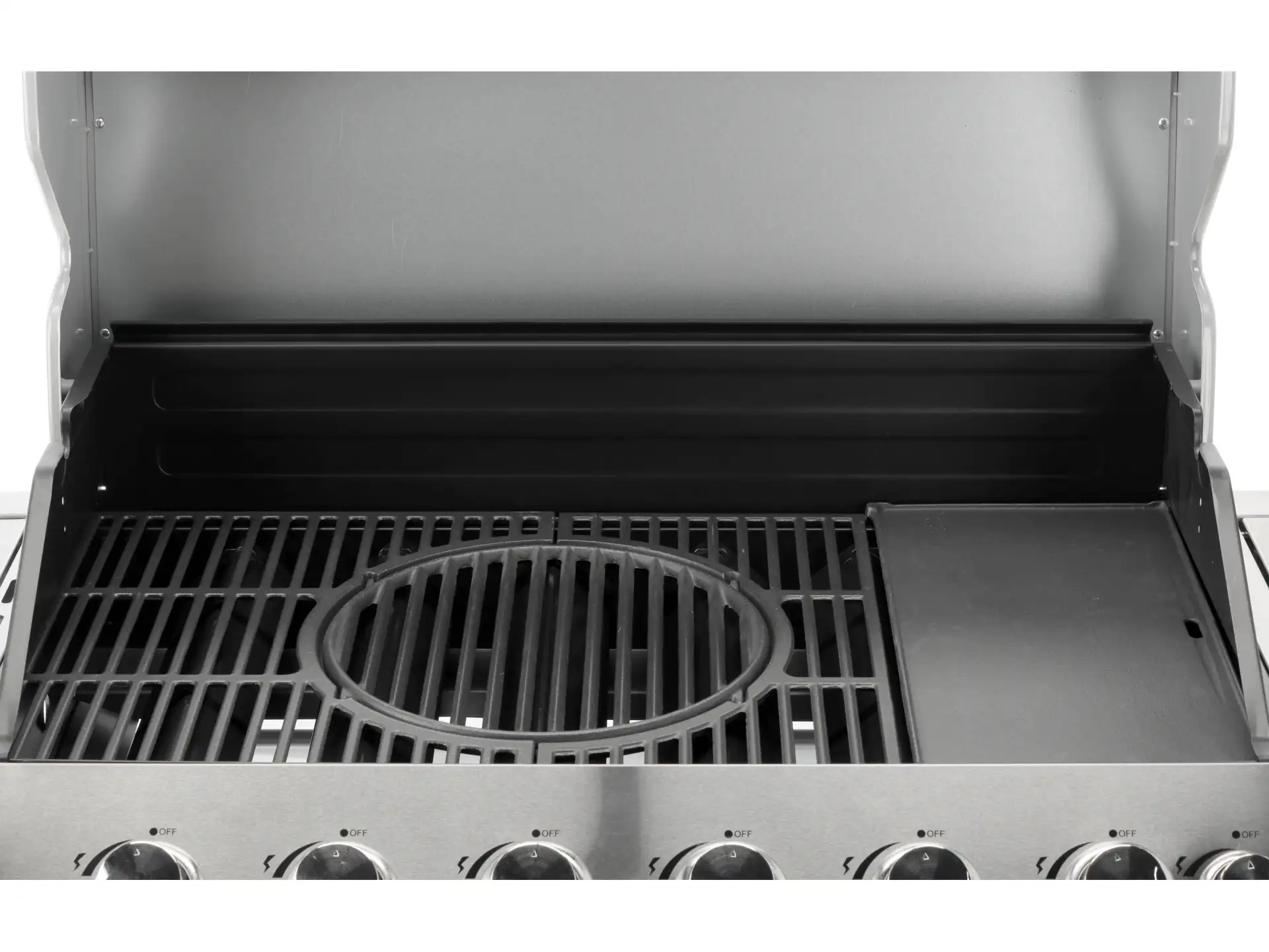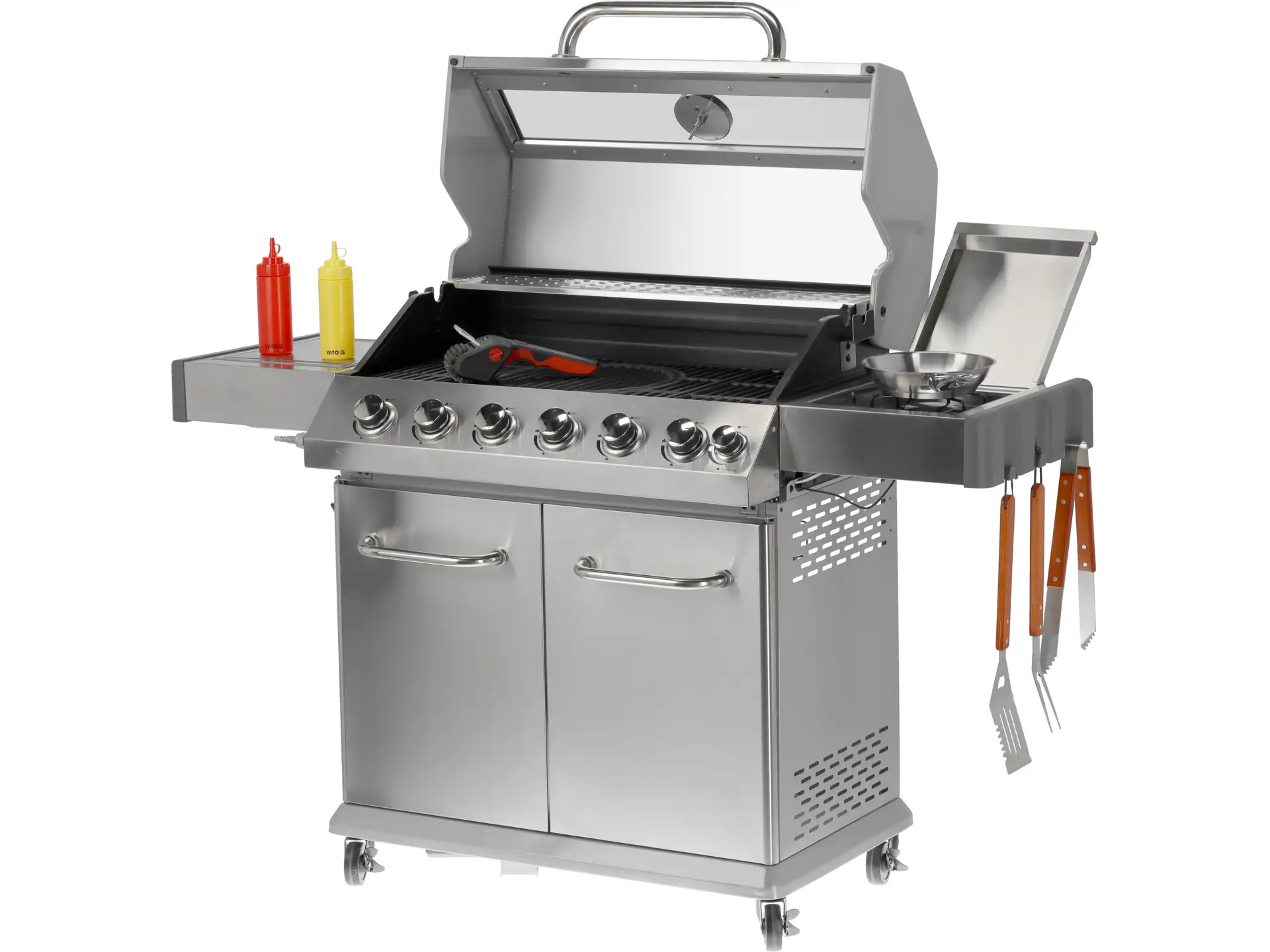 Grătarul pe gaz YATO ZUSHI 6+1, cu o putere totală de 20,2 kW, este un echipament de gătit portabil, ideal pentru utilizare în aer liber. Construit din oțel inoxidabil 430 și oțel acoperit cu pulbere, acesta oferă durabilitate și rezistență la coroziune. Dimensiunile grătarului sunt 1440x570x1120 mm, având o greutate de 39,5 kg. Echipat cu șapte arzătoare (șase principale și unul suplimentar), fiecare cu un diametru al duzei de 0,8 mm pentru arzătoarele principale și 0,7 mm pentru cel suplimentar, grătarul asigură o distribuție uniformă a căldurii. Suprafața de gătit este formată din trei grătare mari din fontă, cu dimensiunile totale de 780x420 mm. Grătarul dispune de patru roți cu frână pentru o mobilitate ușoară și stabilitate în timpul utilizării. Alte caracteristici includ un raft integrat, un termometru pentru monitorizarea temperaturii interne, o grilă de încălzire și o tavă detașabilă pentru colectarea grăsimii. Grătarul funcționează cu butan G30 sau propan G31, având un consum de gaz de 1468 g/h și o presiune a gazului de 37 mbar. Este important de menționat că grătarul nu dispune de mâner lateral, cenușar, obloane de control al circulației aerului, afumătoare sau aprindere în buton. Dimensiunile dulapului integrat sunt de 820x440x550/560 mm, oferind spațiu suplimentar pentru depozitare.