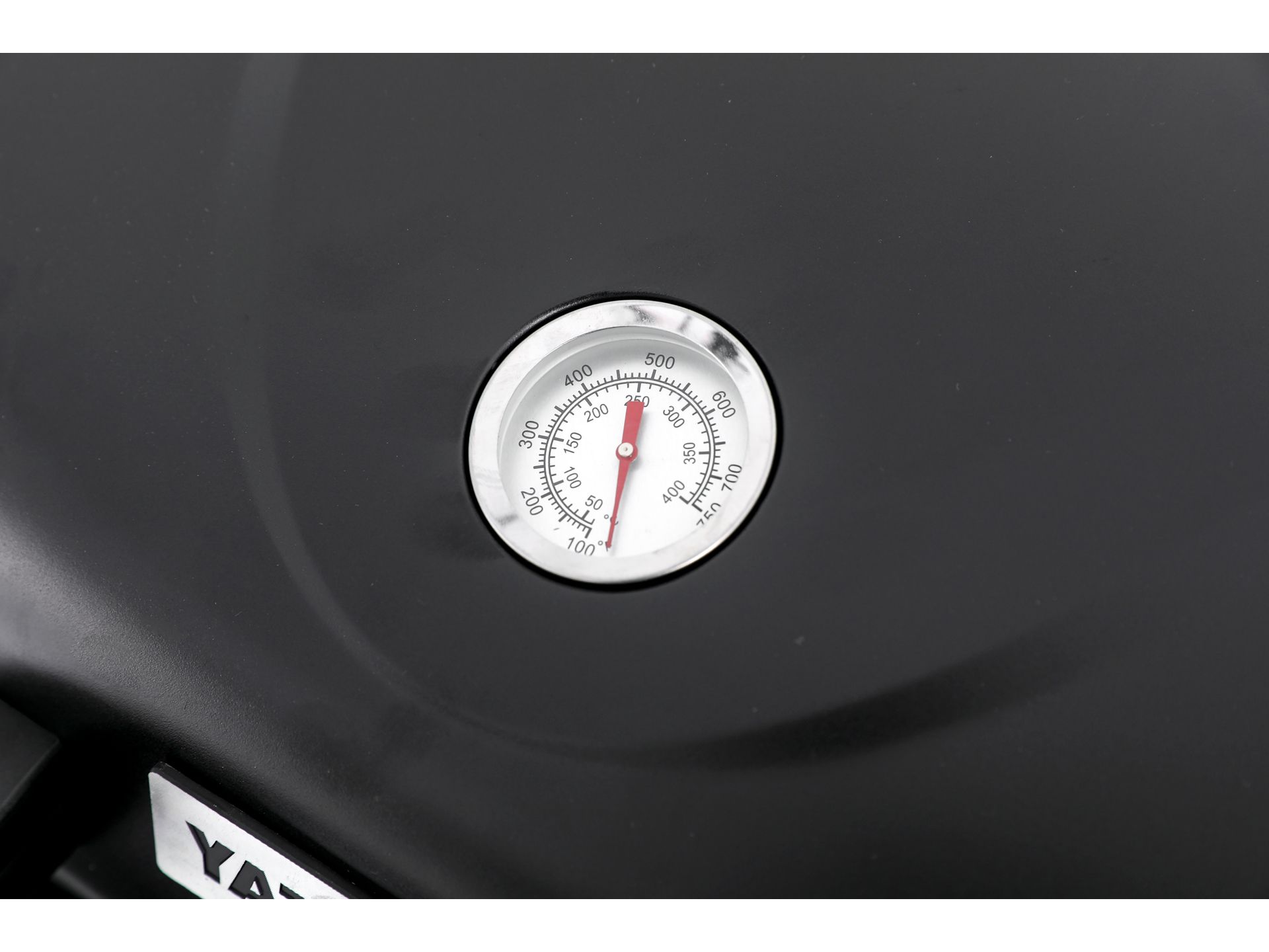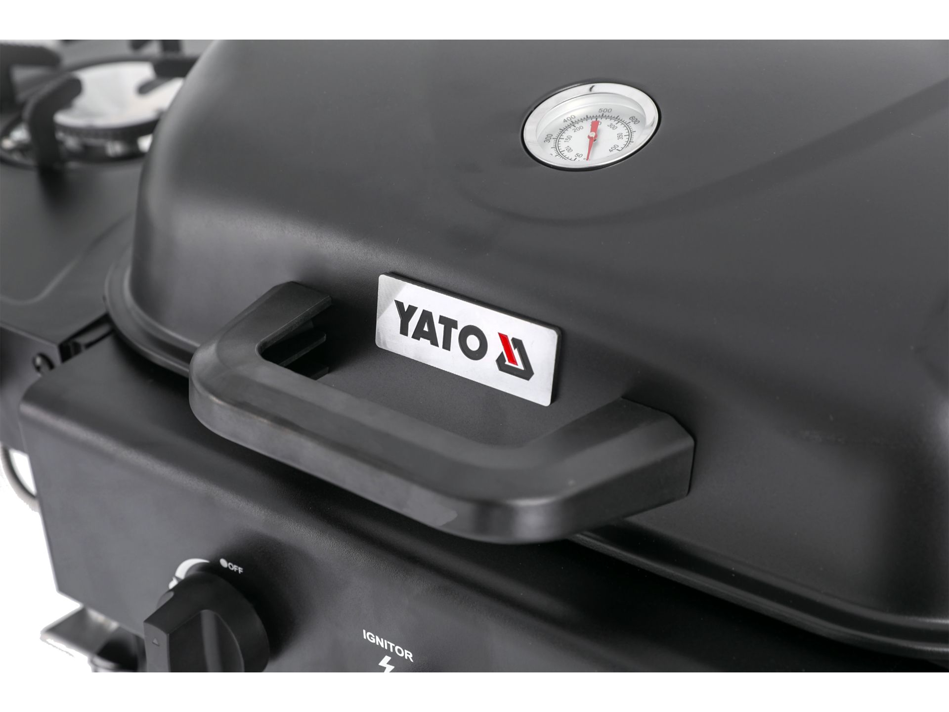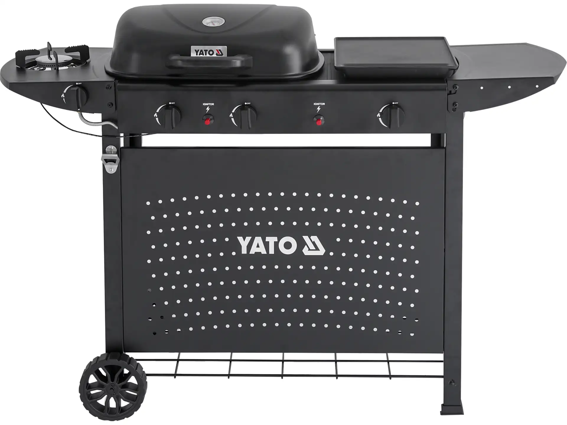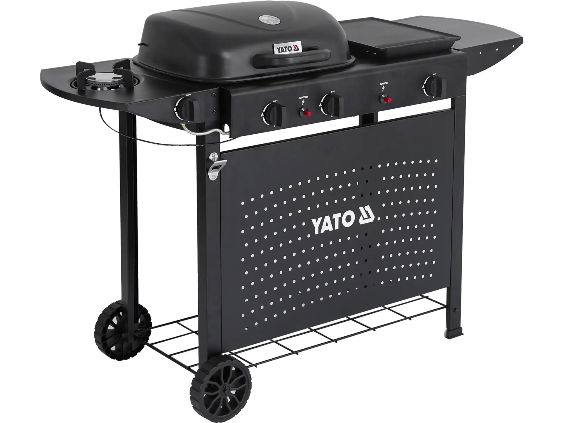 Grătarul pe gaz Asahi 3în1 de la YATO este un grătar portabil, ideal pentru gătitul în aer liber, având dimensiunile de 1285x500x928 mm și o greutate de 21,3 kg. Construcția sa este realizată din oțel acoperit cu pulbere, oferind durabilitate și rezistență. Echipat cu patru arzătoare (două principale și două suplimentare), grătarul oferă o putere totală de 11 kW, distribuită astfel: două arzătoare principale de 2,5 kW fiecare, un arzător suplimentar de 2,5 kW și un arzător lateral de 3,5 kW. Suprafața de gătit include un grătar principal de 480x370 mm, realizat din oțel emailat, o plită din fontă emailată de 270x370 mm și o grilă de încălzire de 400x130 mm. Grătarul dispune de un raft inferior de 770x370 mm și un raft lateral de 250x400 mm, echipat cu trei cârlige pentru accesorii. De asemenea, este dotat cu un termometru integrat în capac pentru monitorizarea temperaturii interne. Pentru o mobilitate sporită, grătarul este prevăzut cu două roți de 6" și un deschizător de sticle integrat. Funcționează cu gaz butan G30 sau propan G31, având un consum de aproximativ 800 g/h și o presiune a gazului de 37 mbar. Nu dispune de aprindere în buton, mâner lateral, cenușar, obloane de control al circulației aerului, afumătoare, tavă de grăsime scoasă sau buzunar pentru butelie de gaz. Grătarul are o formă dreptunghiulară și vine în culoarea neagră.