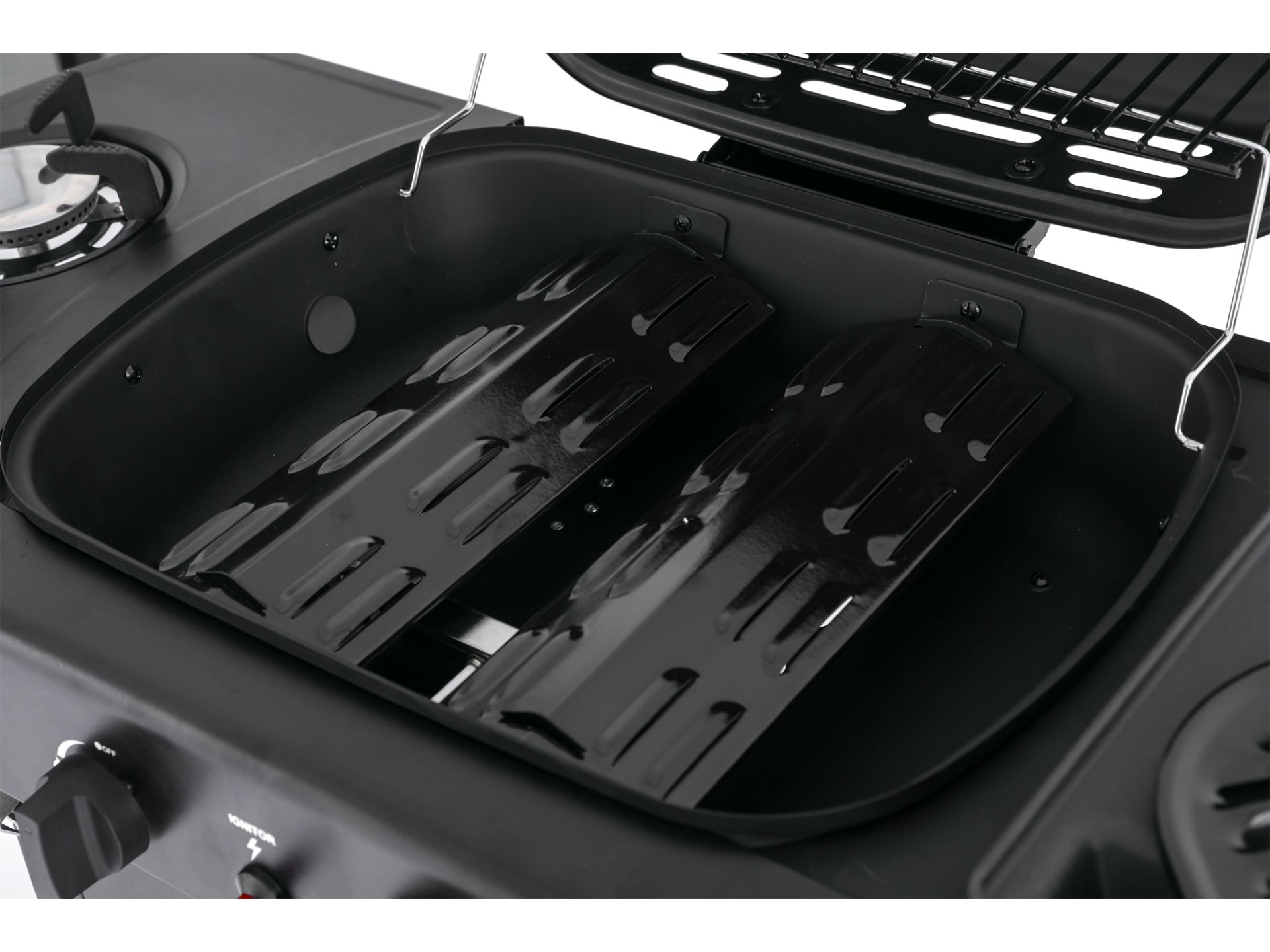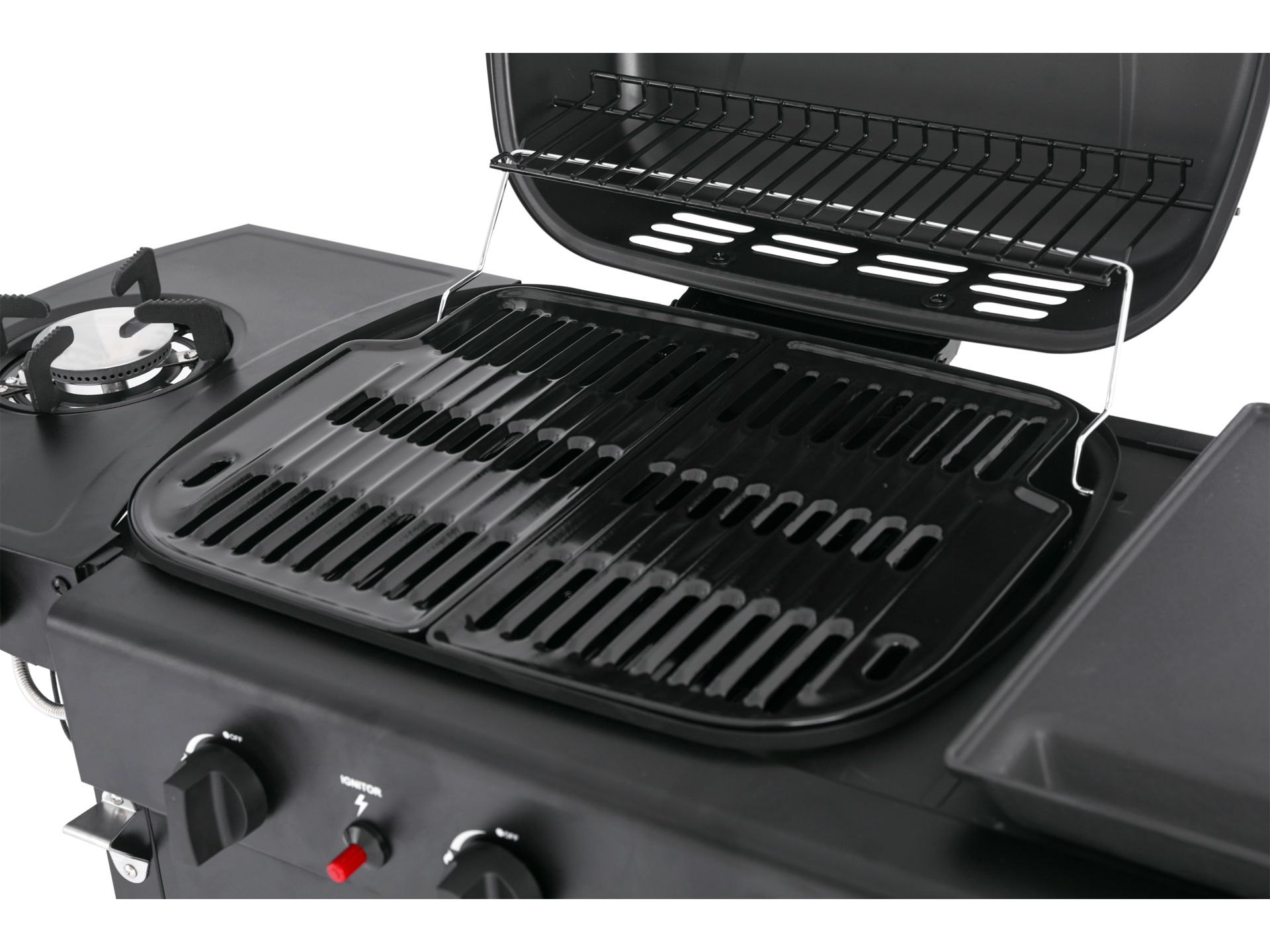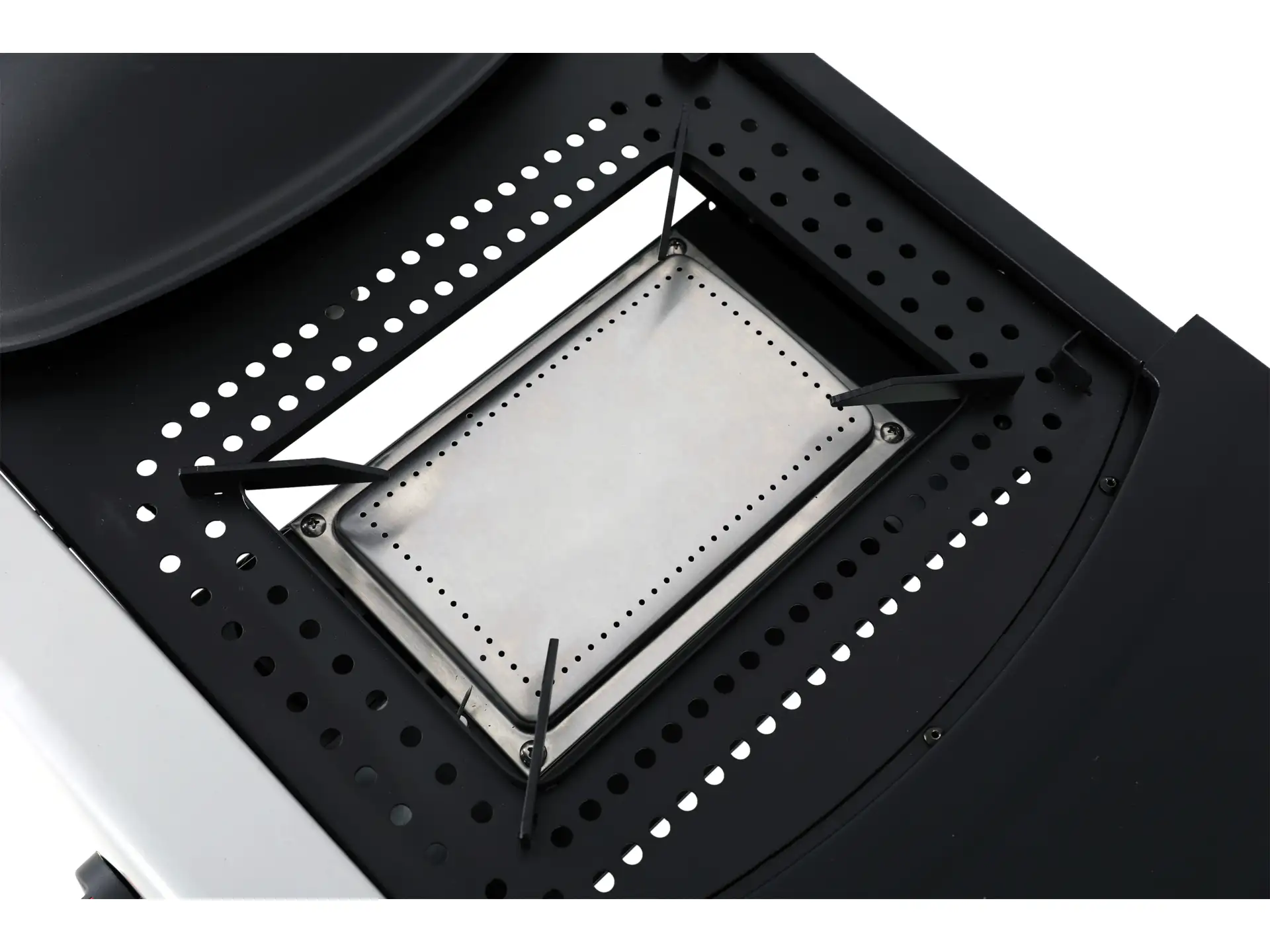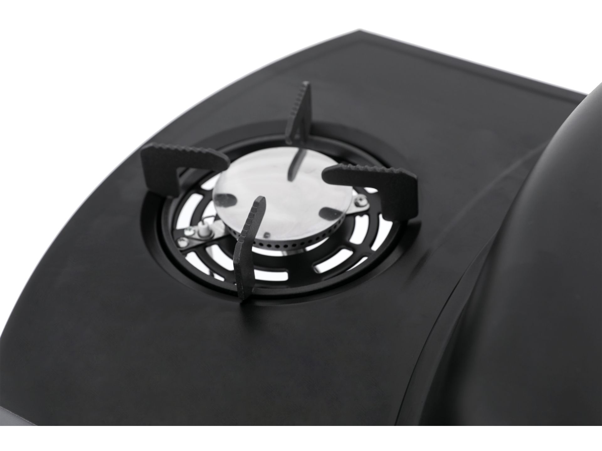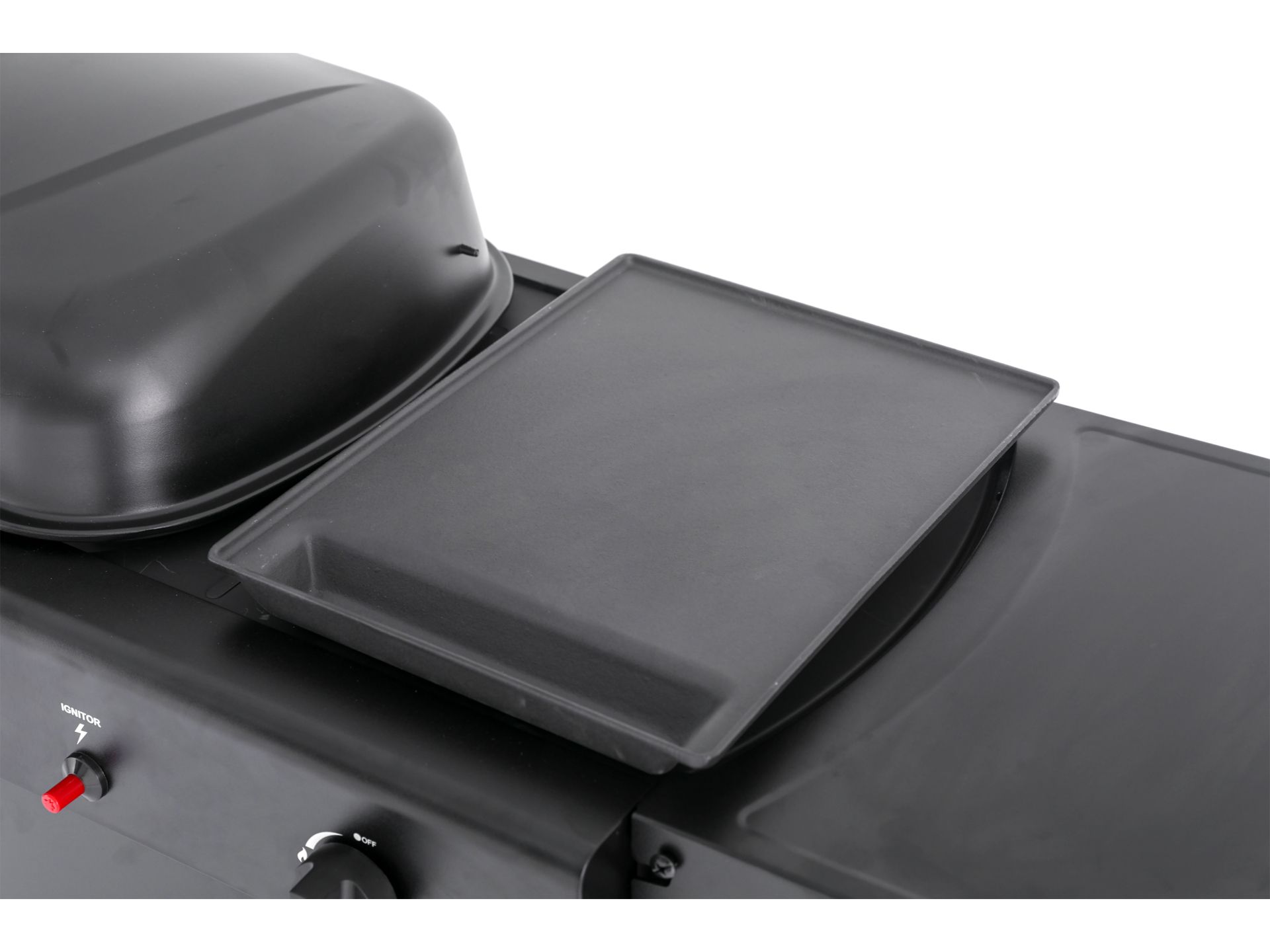 Grătarul pe gaz Asahi 3în1 de la YATO este un grătar portabil, ideal pentru gătitul în aer liber, având dimensiunile de 1285x500x928 mm și o greutate de 21,3 kg. Construcția sa este realizată din oțel acoperit cu pulbere, oferind durabilitate și rezistență. Echipat cu patru arzătoare (două principale și două suplimentare), grătarul oferă o putere totală de 11 kW, distribuită astfel: două arzătoare principale de 2,5 kW fiecare, un arzător suplimentar de 2,5 kW și un arzător lateral de 3,5 kW. Suprafața de gătit include un grătar principal de 480x370 mm, realizat din oțel emailat, o plită din fontă emailată de 270x370 mm și o grilă de încălzire de 400x130 mm. Grătarul dispune de un raft inferior de 770x370 mm și un raft lateral de 250x400 mm, echipat cu trei cârlige pentru accesorii. De asemenea, este dotat cu un termometru integrat în capac pentru monitorizarea temperaturii interne. Pentru o mobilitate sporită, grătarul este prevăzut cu două roți de 6" și un deschizător de sticle integrat. Funcționează cu gaz butan G30 sau propan G31, având un consum de aproximativ 800 g/h și o presiune a gazului de 37 mbar. Nu dispune de aprindere în buton, mâner lateral, cenușar, obloane de control al circulației aerului, afumătoare, tavă de grăsime scoasă sau buzunar pentru butelie de gaz. Grătarul are o formă dreptunghiulară și vine în culoarea neagră.