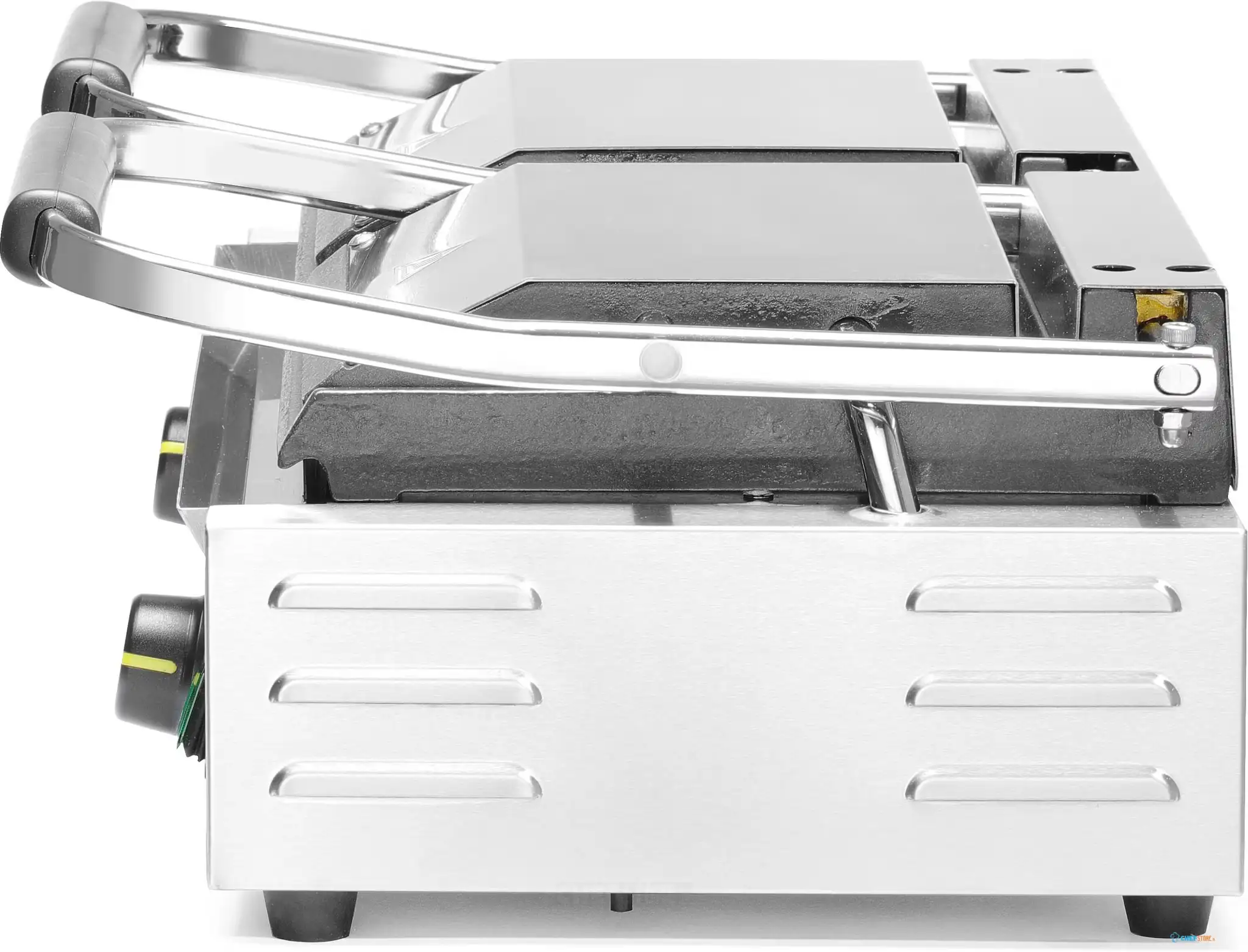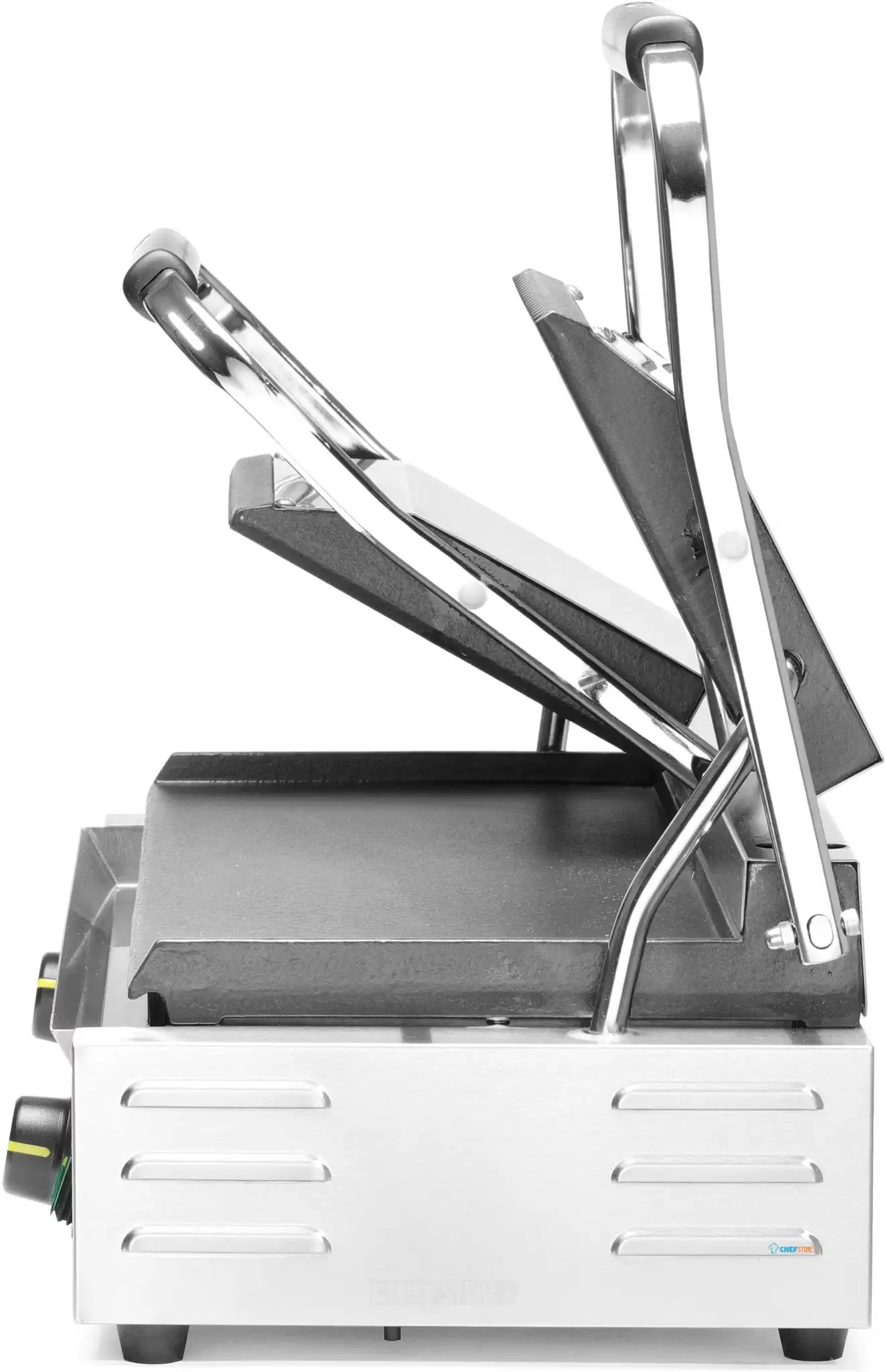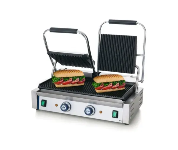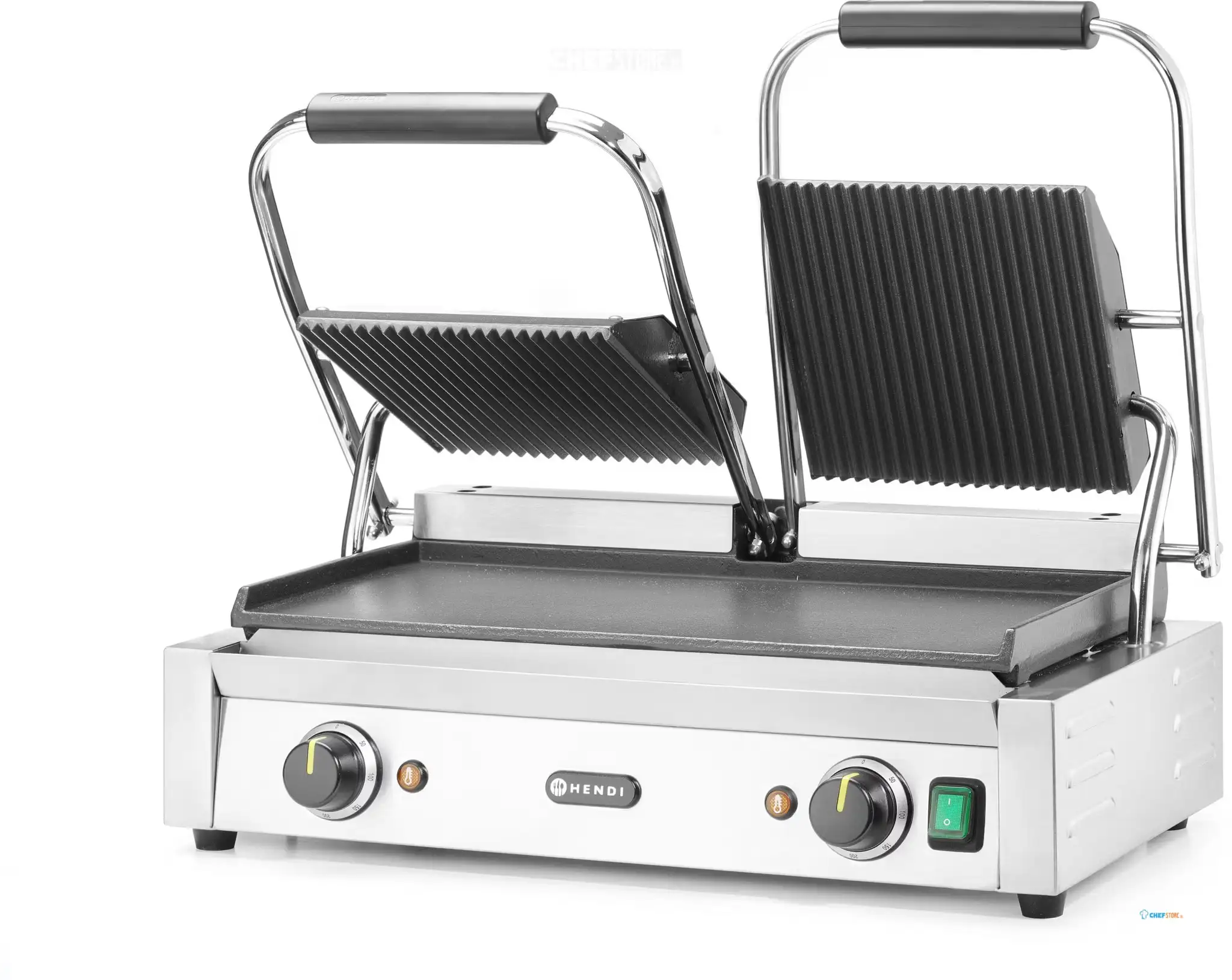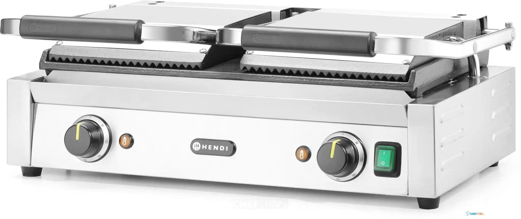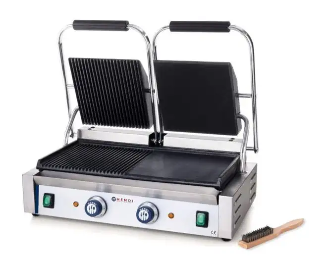 Grătarul de contact HD263808 (HENDI 263808) este un grătar profesional dublu, cu placă superioară striată și placă inferioară netedă, plăci din fontă cu acoperire ceramică, putere 3600 W și suprafață de lucru 475×230 mm. Funcționează la 230 V și are 2 termostate independente cu reglaj până la 300°C.