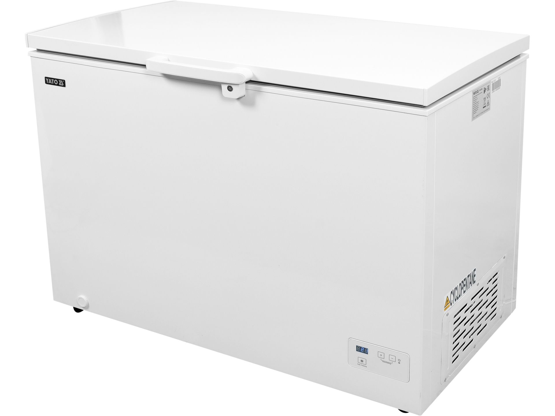Lada frigorifică YATO cu o capacitate de 282 litri are dimensiunile de 1116x644x845 mm și funcționează într-un interval de temperatură de la -24 până la +10 ˚C este echipată cu un congelator și un coș de sârmă carcasa este fabricată din oțel și are o masă de 42 kg funcționează la o tensiune de 220-240 V a.c.