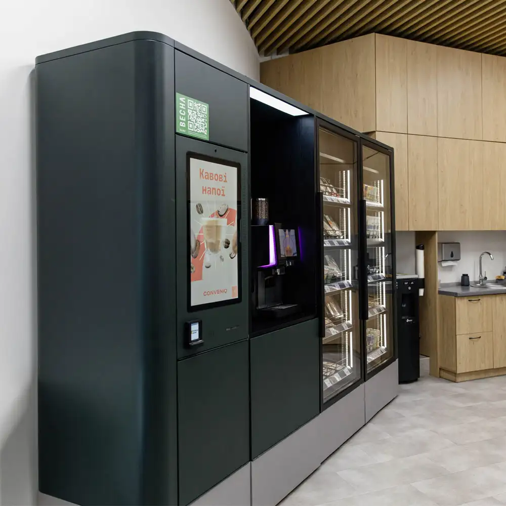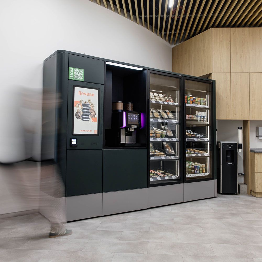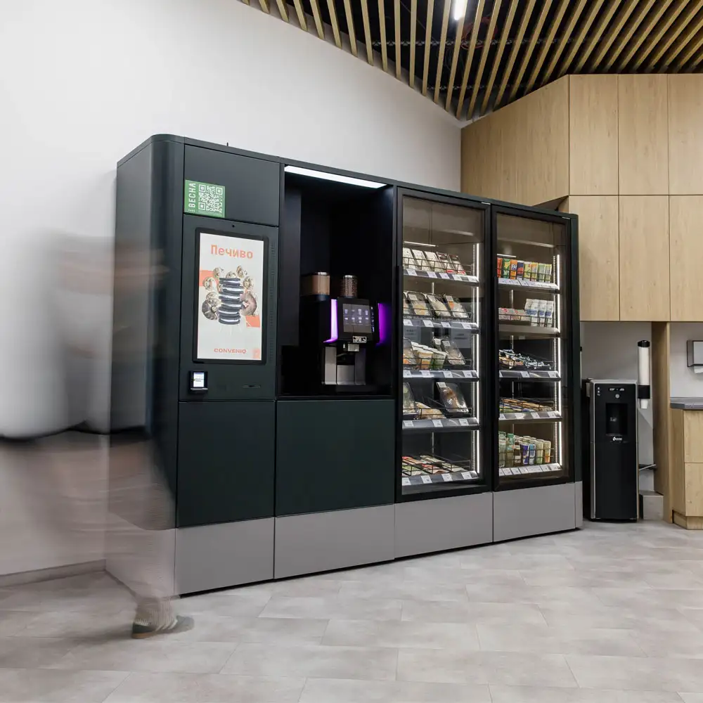 CONVENIQ combină un frigider Grab&Go, un locker de colete și un modul de cafea într-un singur dispozitiv, controlat prin software integrat.