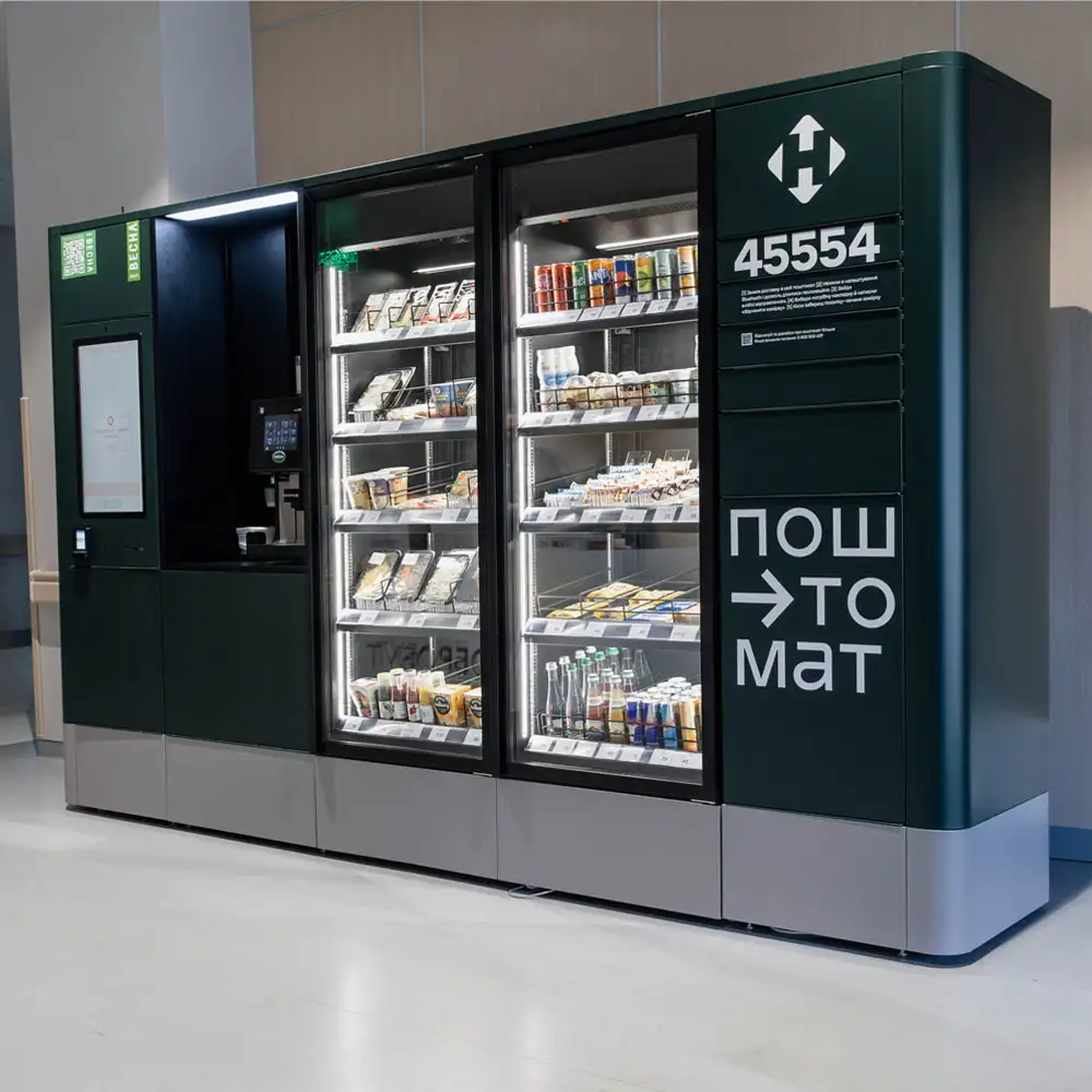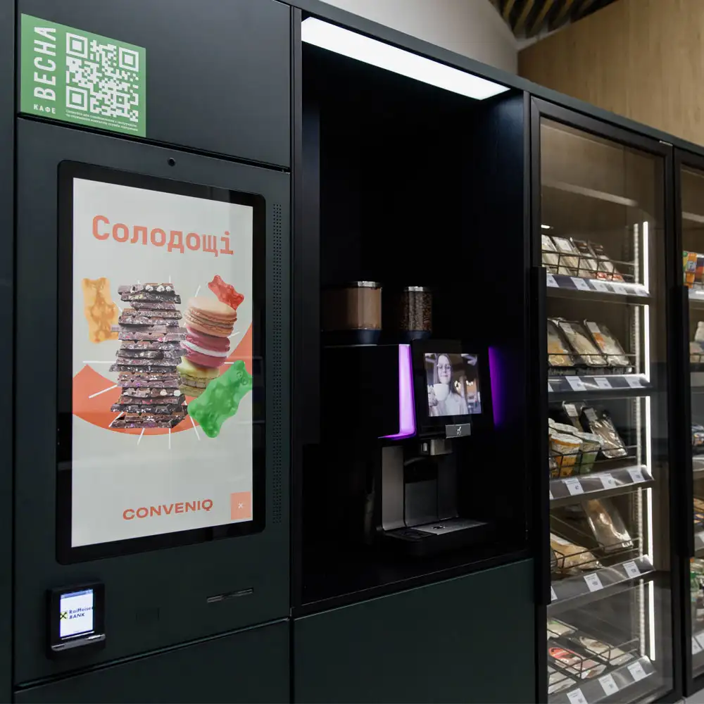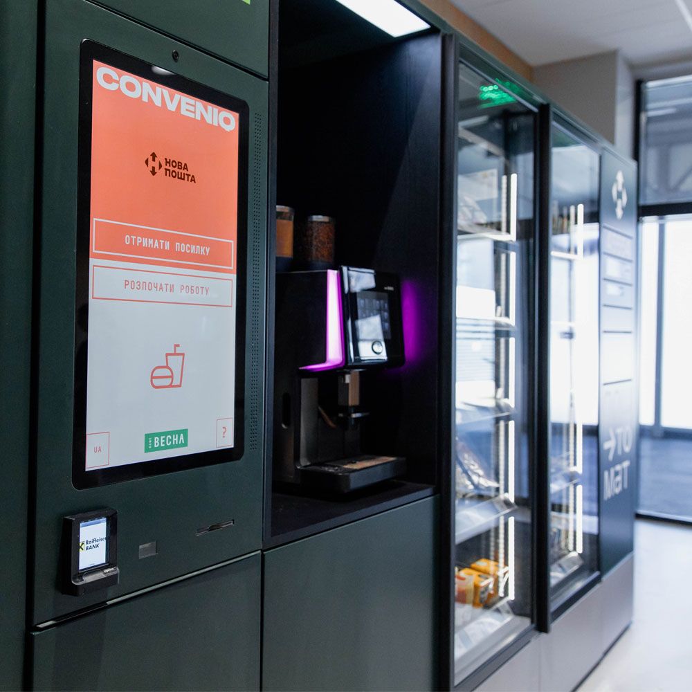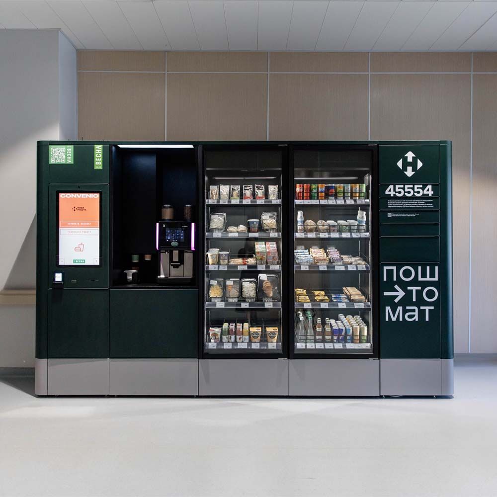CONVENIQ combină un frigider Grab&Go, un locker de colete și un modul de cafea într-un singur dispozitiv, controlat prin software integrat.
