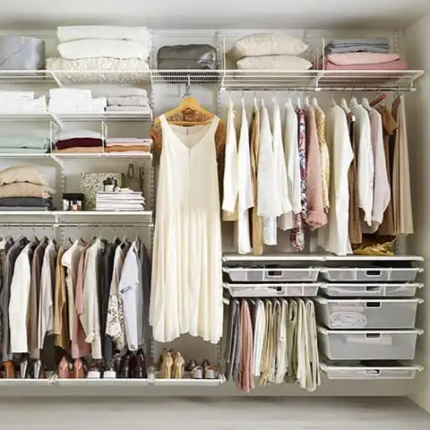Mobilier pentru dormitor cu structură deschisă, special conceput pentru organizarea impecabilă a hainelor, pantofilor și accesoriilor. Sistemul modular include sertare, rafturi, suporturi și bare pentru umerașe, oferind soluții de depozitare eficiente și adaptabile oricărui spațiu de locuit.