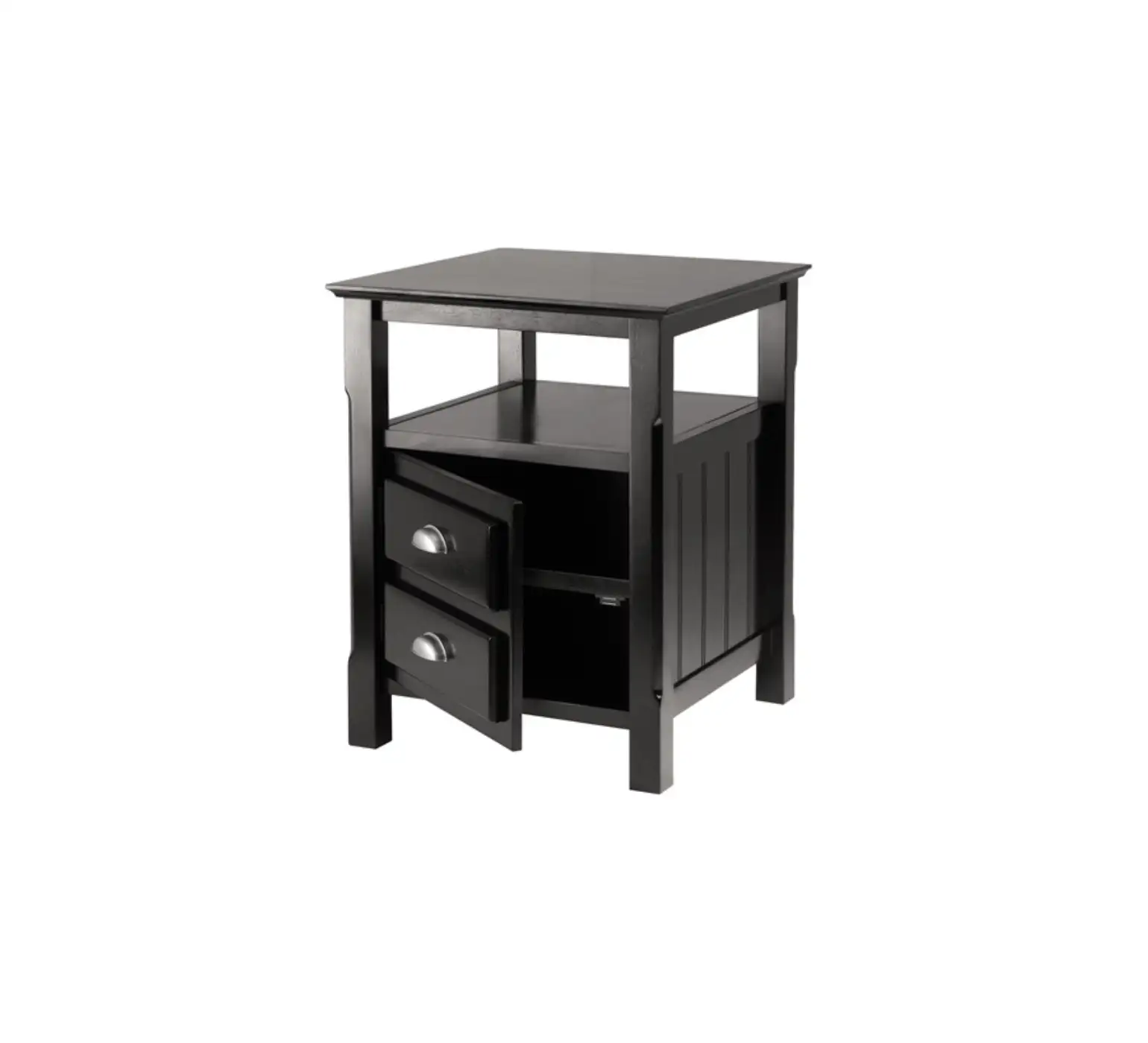 Noptieră elegantă din lemn negru, cu design clasic și finisaj rezistent. Dispune de două sertare practice cu mânere metalice și un raft deschis, ideal pentru cărți, ceasuri sau alte obiecte personale. Potrivită pentru dormitoare moderne sau tradiționale, această piesă oferă un echilibru perfect între funcționalitate și estetică.