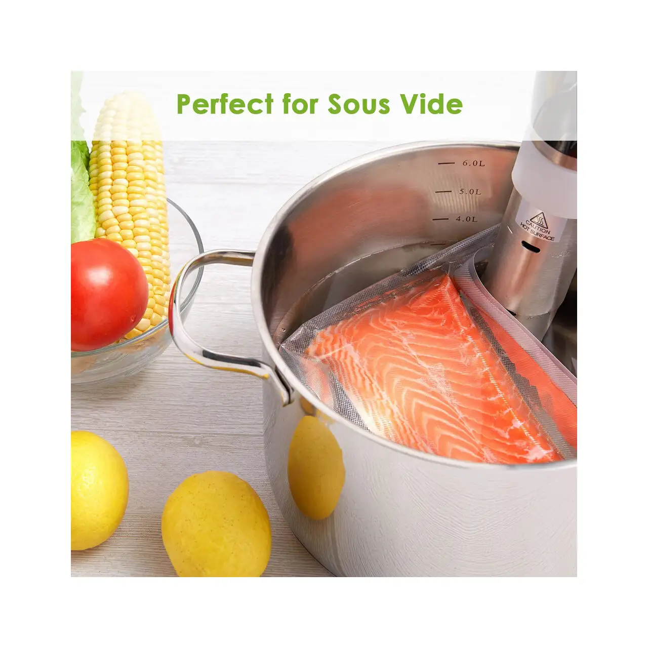 Potrivit pentru gătitul sous vide. 2 straturi, stratul interior de 60 µm poliester aprobat pentru contactul cu alimentele, stratul exterior de 15µm poliamidă (nylon). Grosimea totală este de 75 µm.