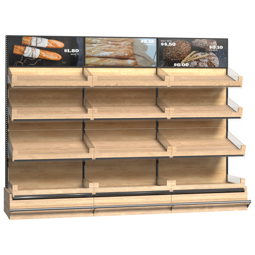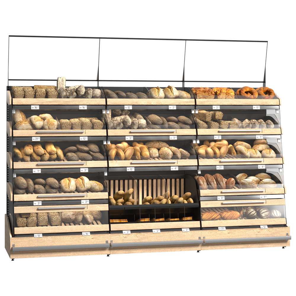 Unitate de perete pentru brutării, magazine alimentare și supermarkete, dotată cu rafturi din lemn pe bază metalică și reglabile pe înălțime, cu separatoare, panou decorativ din PAL și coș din lemn pentru pâine. Vitrina este o soluție ideală pentru expunerea elegantă a pâinii proaspete, produse de patiserie și panificație artizanală.