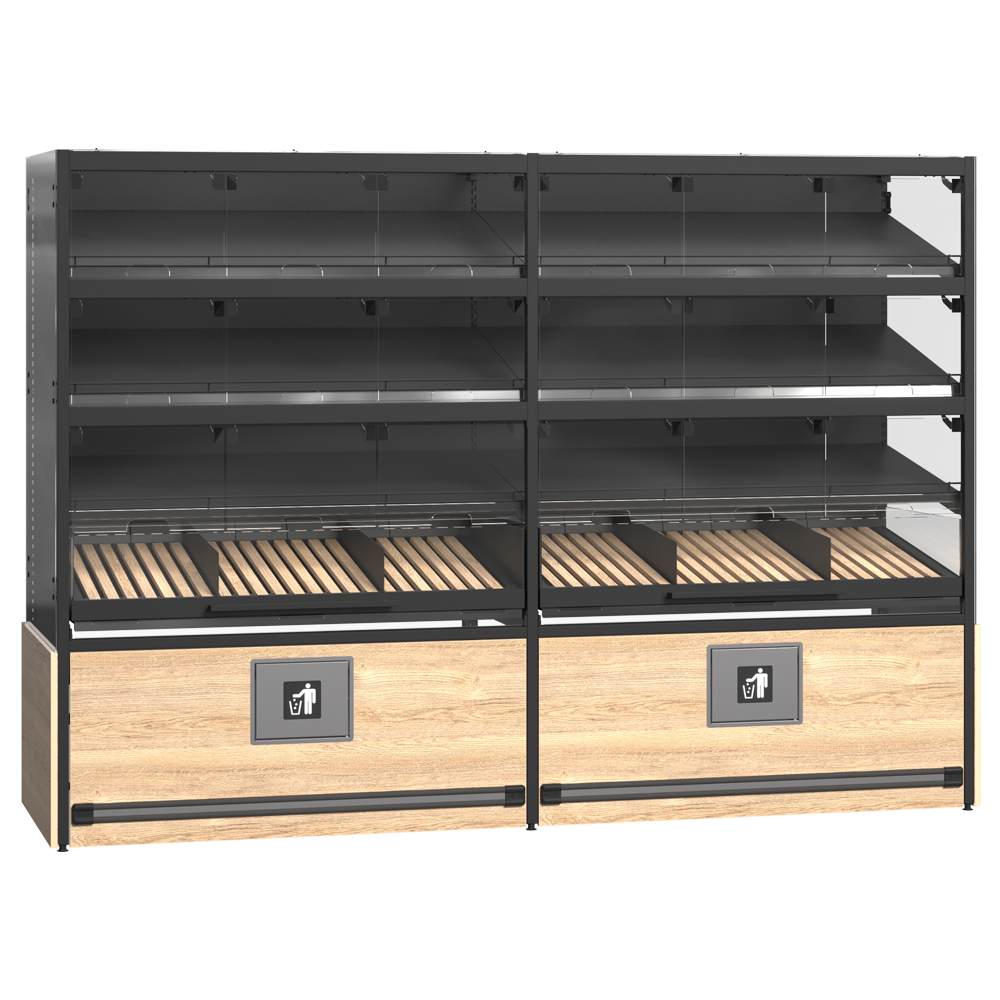 Raftul modular este soluția ideală pentru expunerea produselor în brutării, cafenele și magazine moderne. Sistemul de rafturi oferă expoziție multi-nivel și umplere din față sau din spate, pentru acces rapid și organizare eficientă. Poate fi folosit ca unitate de perete sau gondolă, fiind mobil sau staționar. Ușile din sticlă rabatabile protejează produsele și le fac ușor accesibile. Designul modular și panourile transparente permit vizibilitate completă și fac produsele mai atractive pentru clienți, în timp ce cadrul metalic asigură durabilitate și stabilitate.