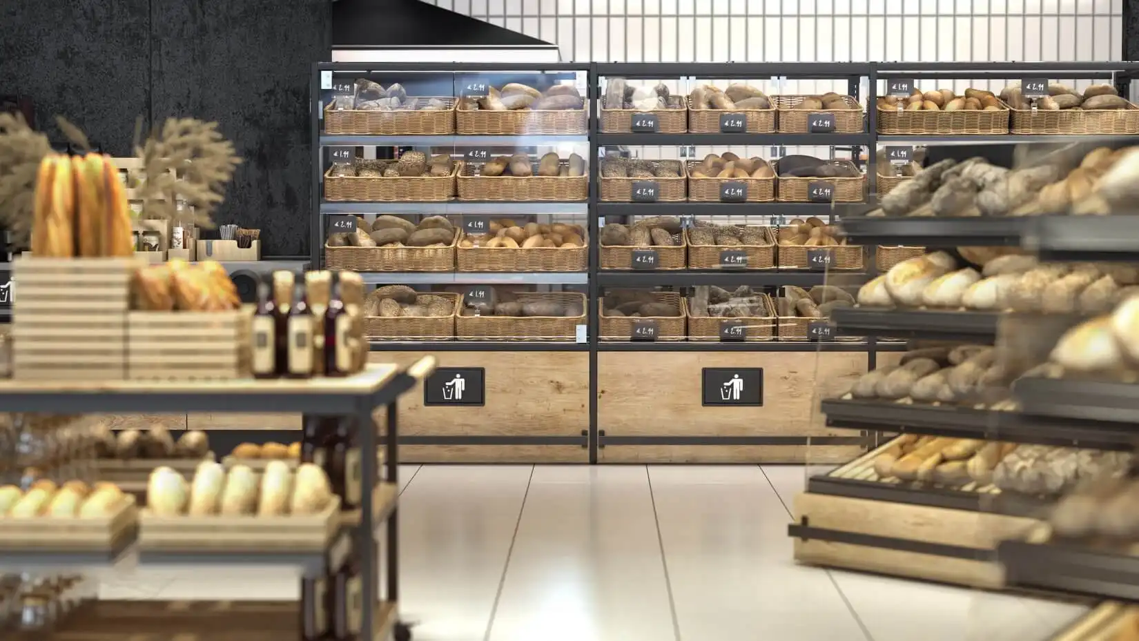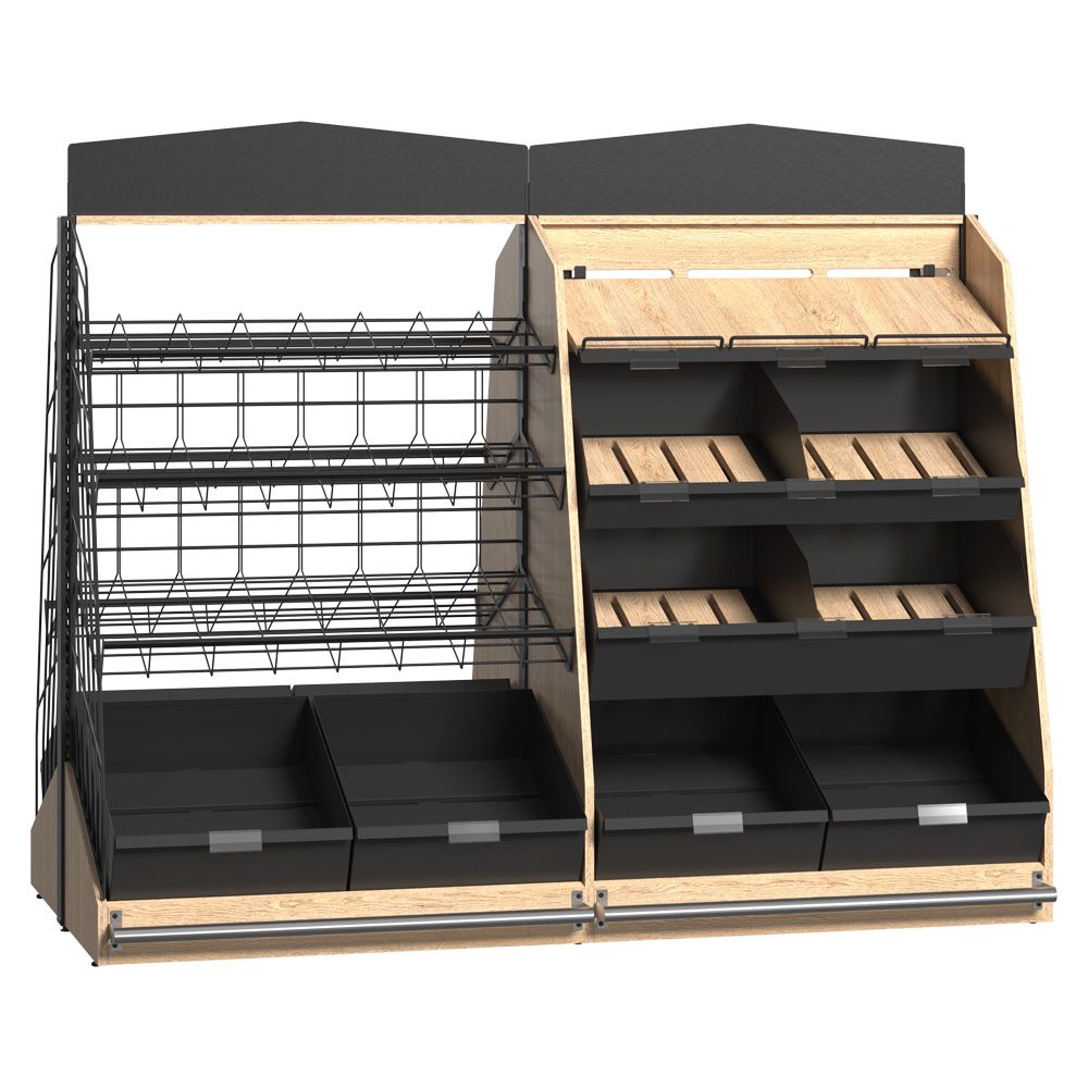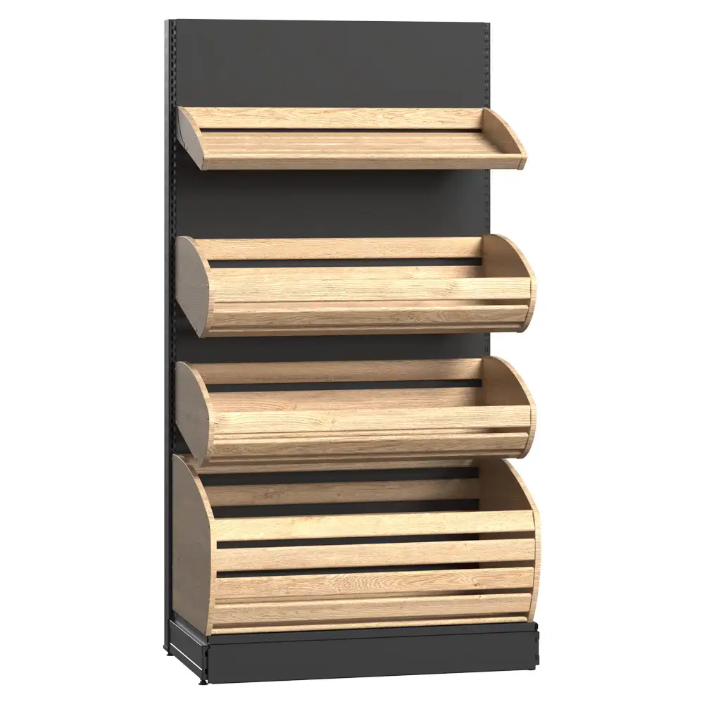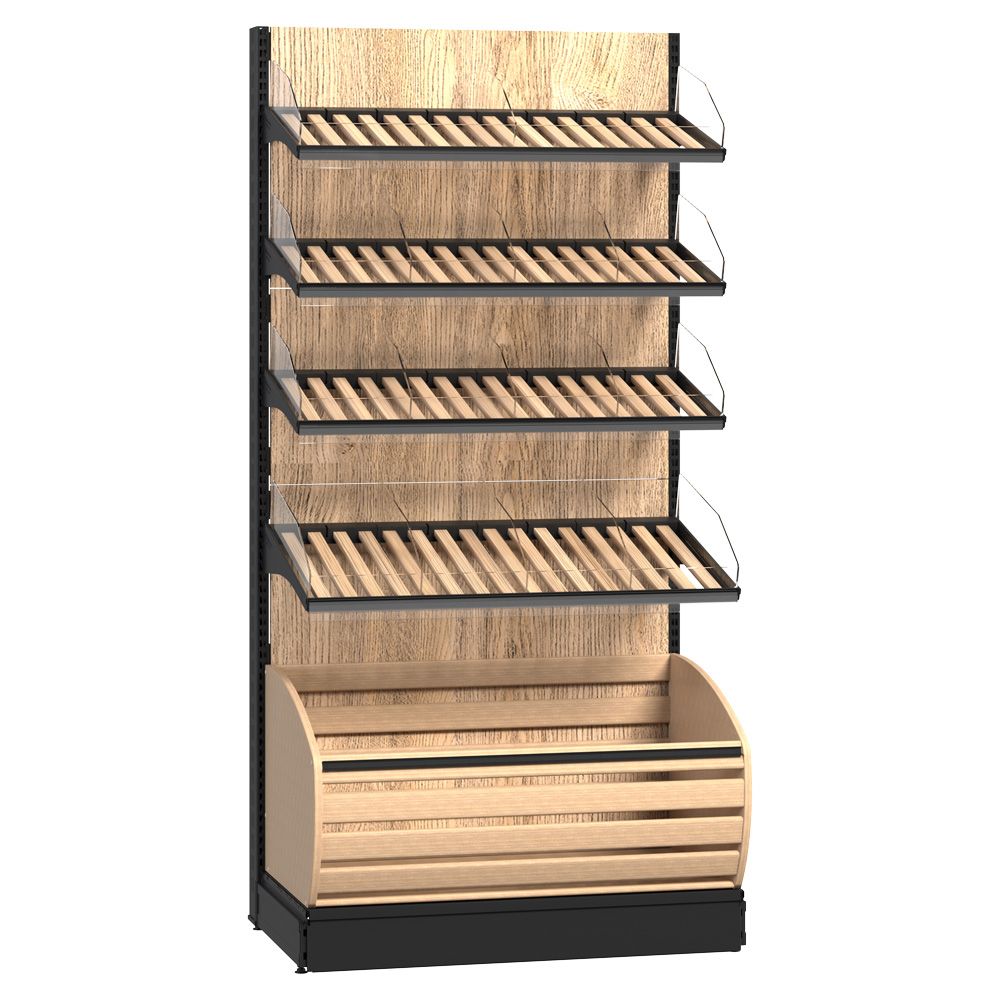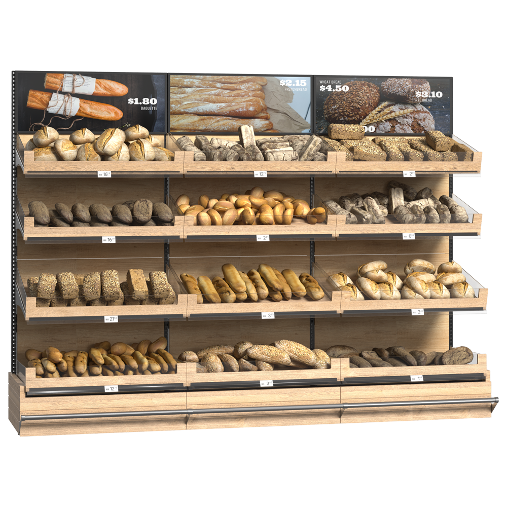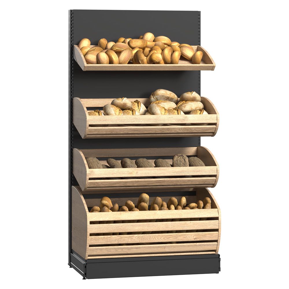 Unitate de perete pentru zona de brutărie reprezintă soluția ideală pentru expunerea organizată a pâinii proaspete, baghetelor și a altor produse de panificație. Vitrina este construită pe o structură solidă din metal, cu un panou metalic pe partea din spate și coșuri din lemn de diferite dimensiuni (mic, mediu și mare). Acest sistem de rafturi optimizează spațiul de expunere și pune în valoare prospețimea și calitatea produselor, fiecare coș permițând aranjarea clară și accesibilă a produselor, ceea ce oferă o experiență de cumpărare plăcută pentru clienți. Designul modern și natural se integrează armonios în orice tip de spațiu comercial, fie că este vorba despre brutării, magazine alimentare, supermarketuri sau alte locații specializate.