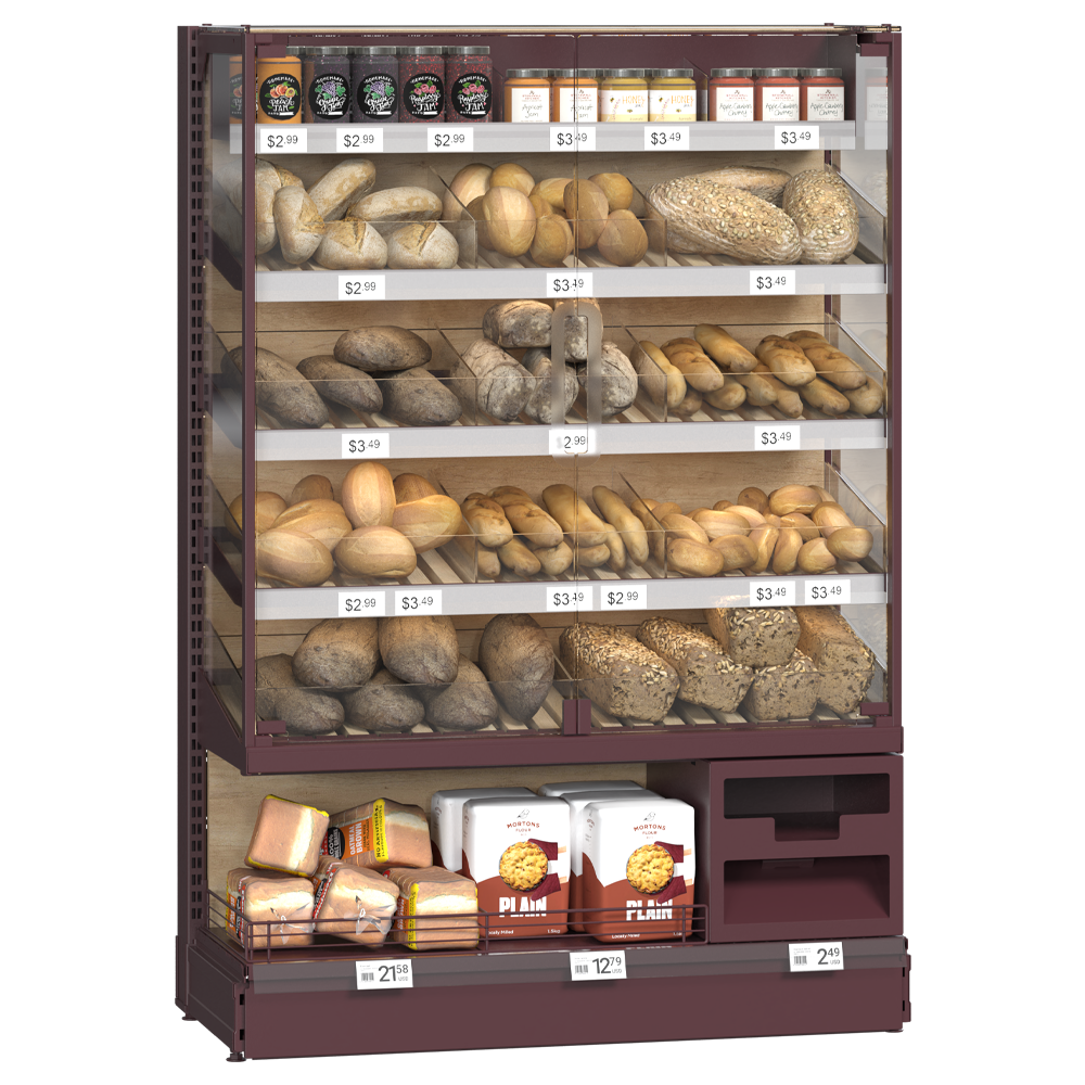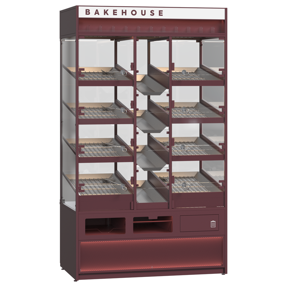 Sistemul de rafturi pentru zona brutărie este soluția ideală pentru expunerea și comercializarea pâinii proaspete. Are un design igienic și modern, cu panou frontal din sticlă securizată și uși din sticlă pe spate, oferind protecție completă și vizibilitate maximă a produselor. Construcția robustă, cu rafturi din oțel inoxidabil, asigură rezistență și curățare facilă în utilizarea zilnică. Este dotată cu raft pentru firimituri, modul pentru pungi, suport pentru mănuși și un raft dedicat vânzărilor încrucișate, pentru expunerea produselor complementare. Vitrina este compatibilă cu sistemele Coffice și Cooles SlimDeck, integrându-se perfect în orice spațiu comercial.