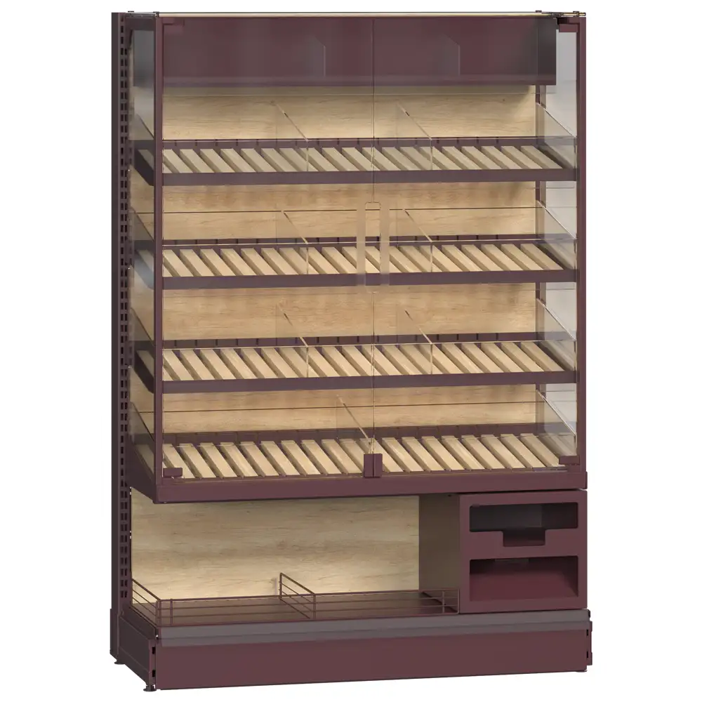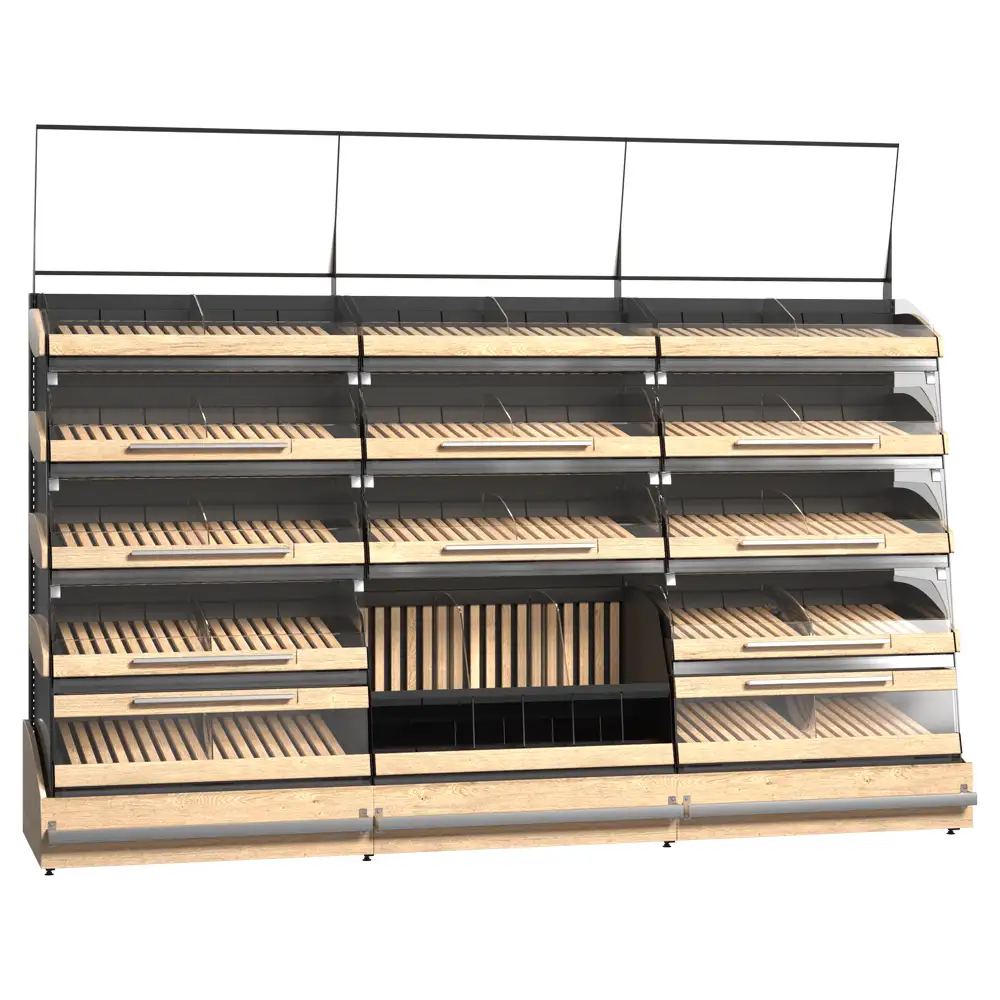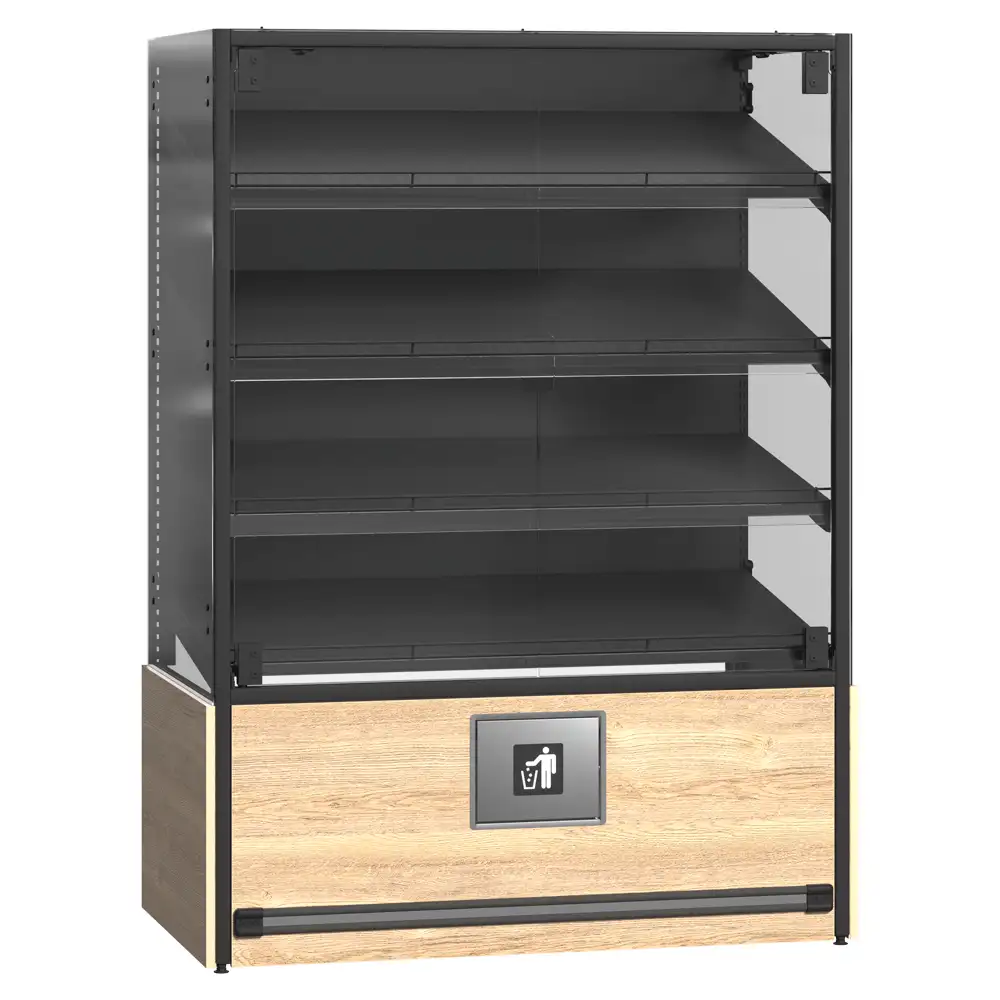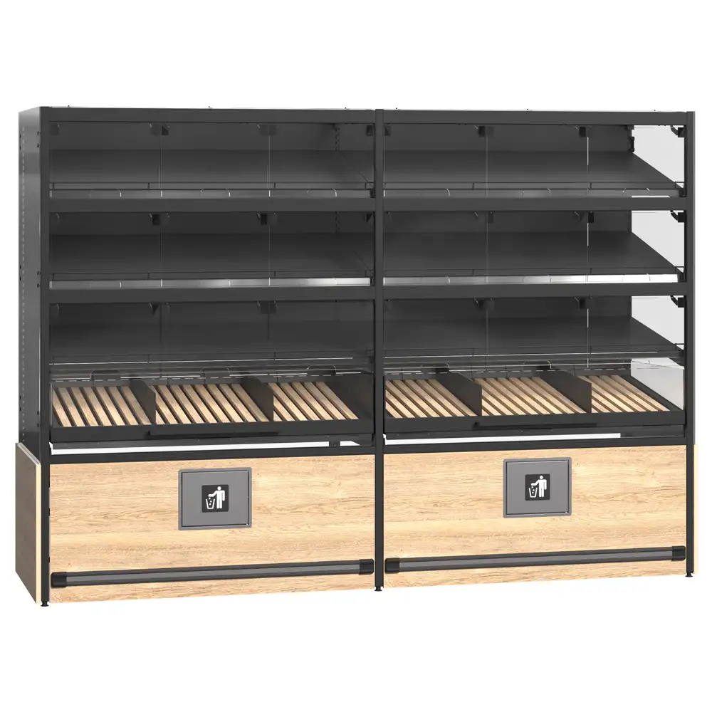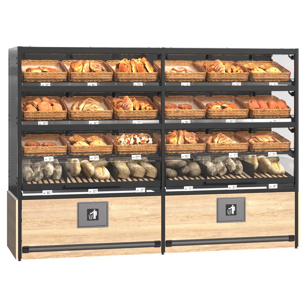 Sistemul de rafturi pentru produse de panificație dispune de uși din sticlă montate pe balamale pentru protecție și vizibilitate, rafturi din lemn cu separatori acrilici pentru o organizare eficientă, precum și un raft ascuns special pentru colectarea firimiturilor. Modulul pentru pungi și suportul pentru mănuși sporesc igiena și confortul utilizării, iar raftul dedicat vânzărilor încrucișate stimulează promovarea altor produse complementare. Designul modern și funcțional integrează perfect toate elementele necesare pentru o prezentare profesională. Acest sistem optimizează spațiul și sprijină vânzarea eficientă a produselor de panificație.