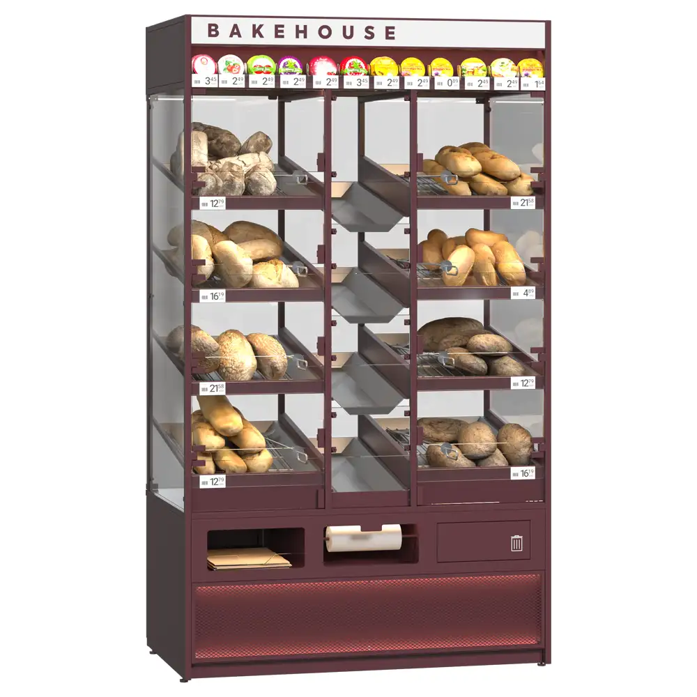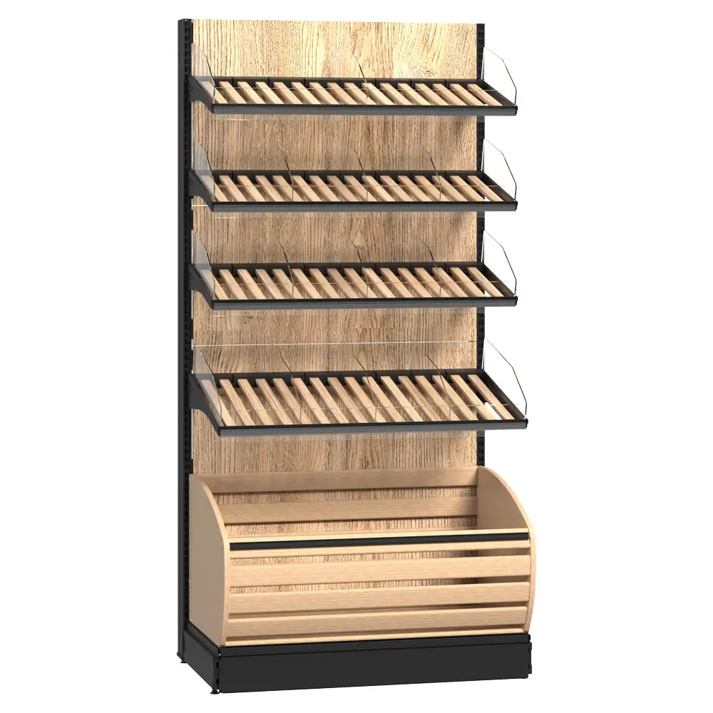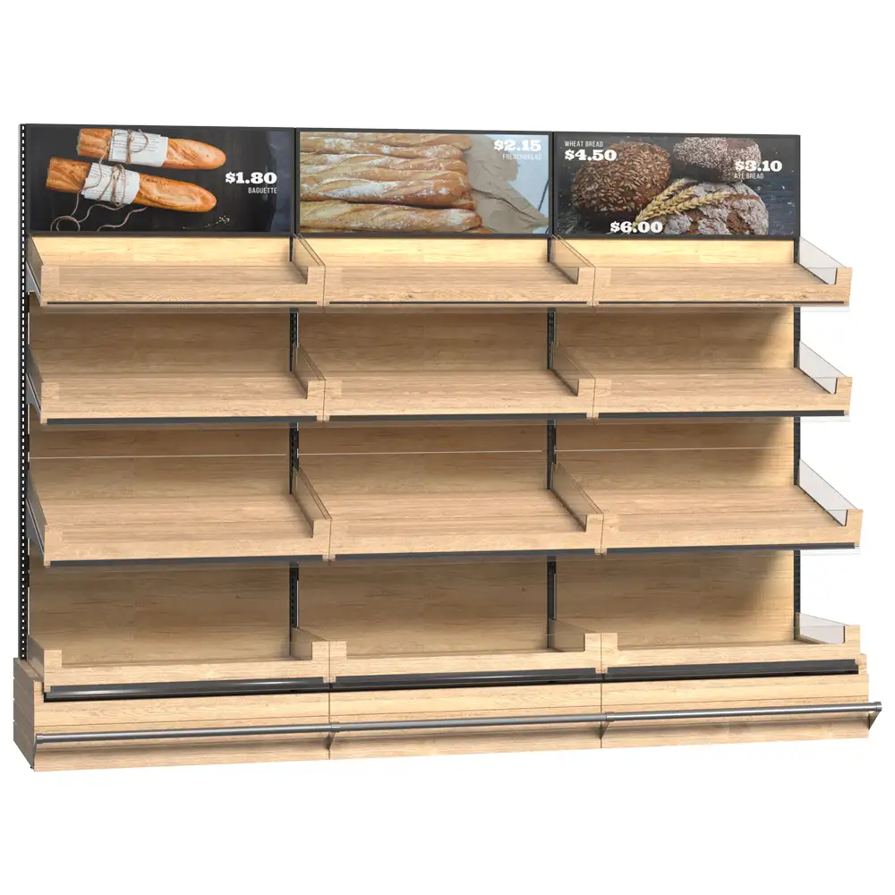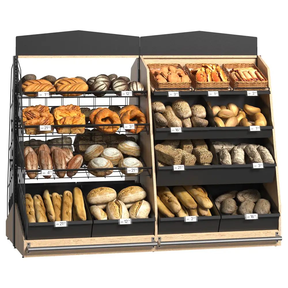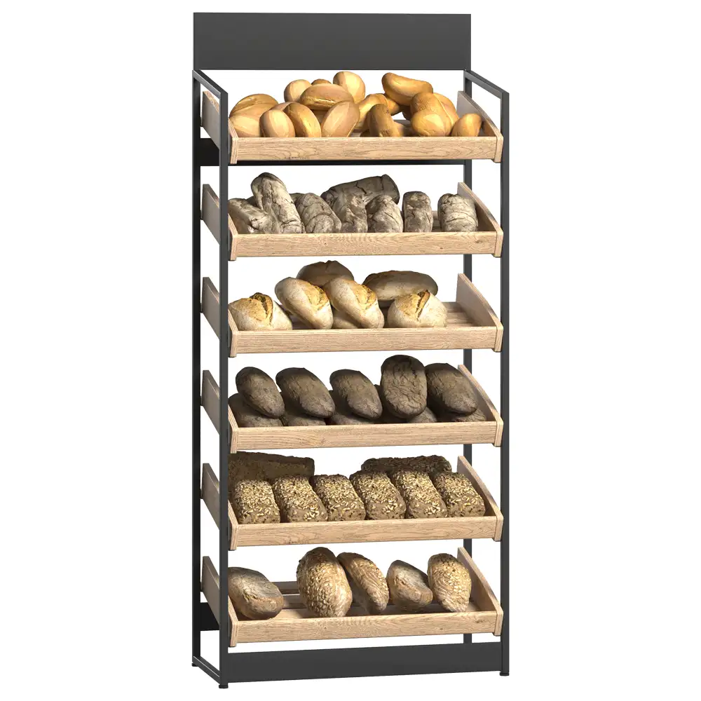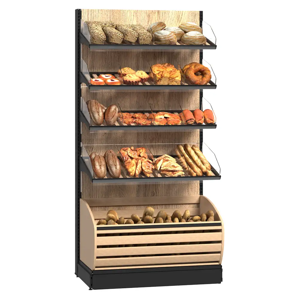 Sistemul de rafturi pentru produse de panificație dispune de uși din sticlă montate pe balamale pentru protecție și vizibilitate, rafturi din lemn cu separatori acrilici pentru o organizare eficientă, precum și un raft ascuns special pentru colectarea firimiturilor. Modulul pentru pungi și suportul pentru mănuși sporesc igiena și confortul utilizării, iar raftul dedicat vânzărilor încrucișate stimulează promovarea altor produse complementare. Designul modern și funcțional integrează perfect toate elementele necesare pentru o prezentare profesională. Acest sistem optimizează spațiul și sprijină vânzarea eficientă a produselor de panificație.