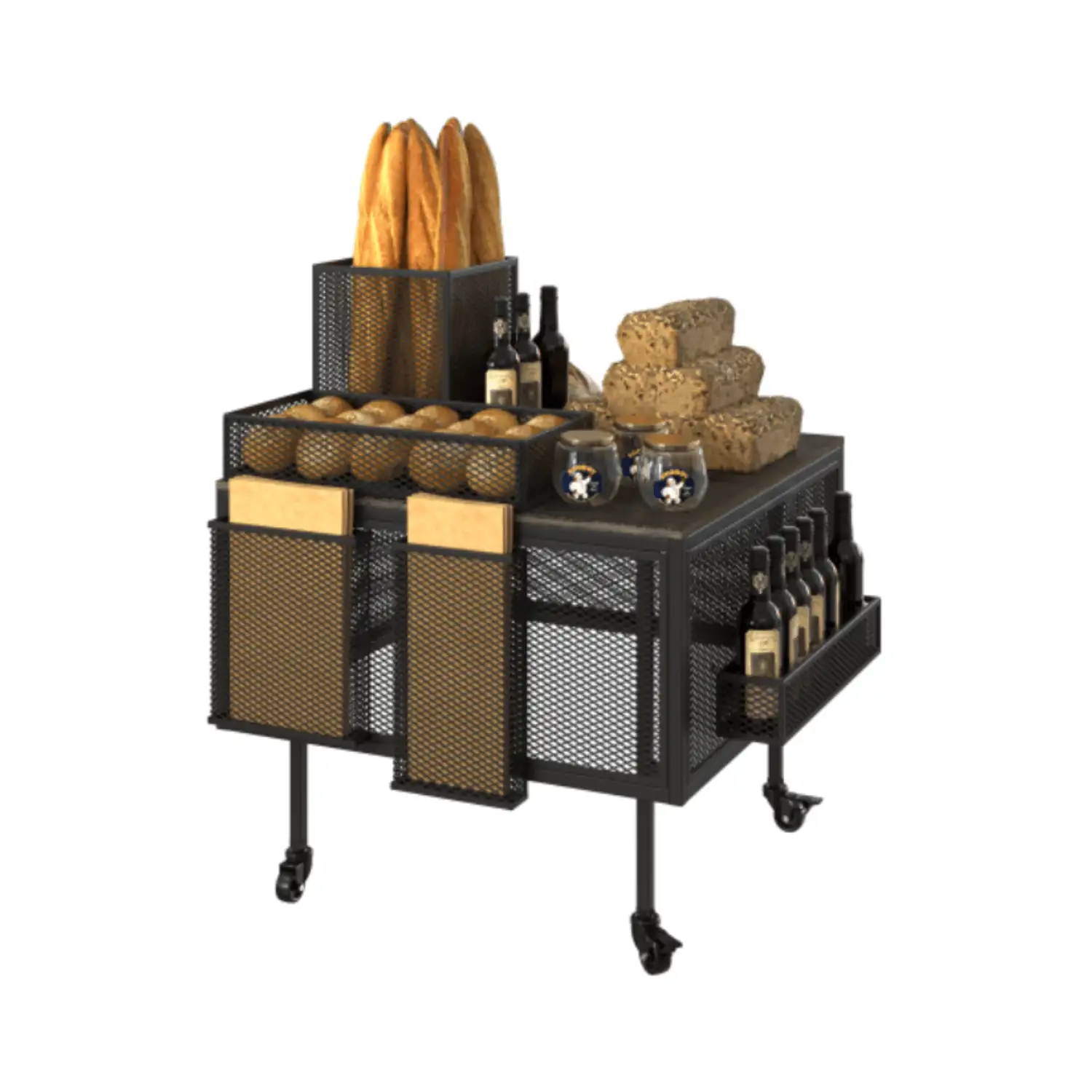 Masa modulară mobilă este ideală pentru expunerea produselor în brutării, cafenele sau magazine. Dispune de niveluri multiple pentru pâine, produse de patiserie, borcane sau sticle de vin, coșuri metalice și panouri frontale pentru etichete. Roțile pivotante permit mutarea ușoară și fixarea stabilă, iar designul compact și durabil combină funcționalitatea cu atractivitatea vizuală, maximizând expunerea și accesul rapid la produse.