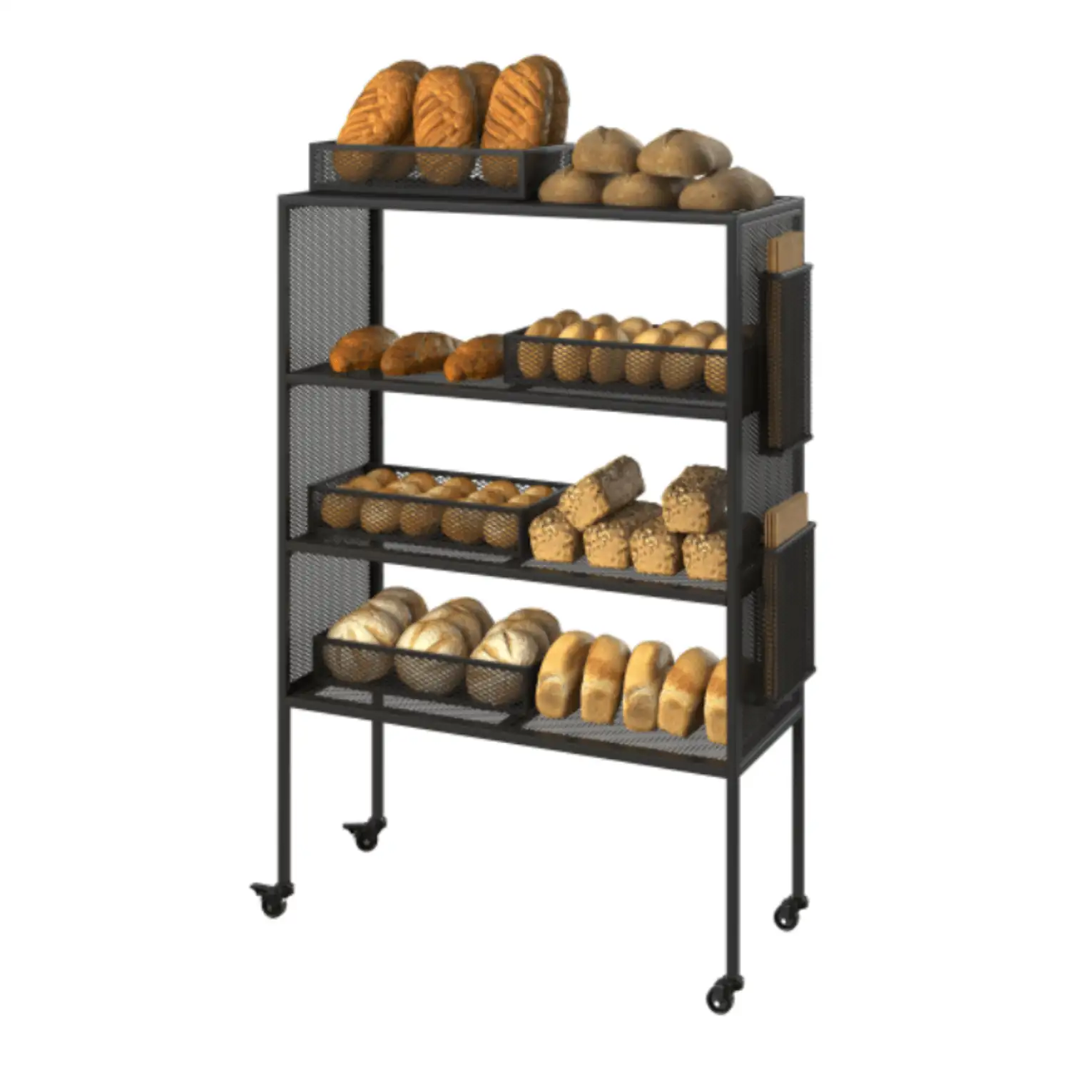 Raftul modular mobil este perfect pentru expunerea pâinii și produselor de brutărie în magazine, cafenele sau brutării. Dispune de rafturi multi-nivel și coșuri metalice perforate pentru vizibilitate maximă, iar roțile pivotante permit mutarea ușoară și fixarea stabilă. Panourile laterale pentru etichete facilitează organizarea produselor, iar cadrul metalic robust garantează durabilitate. Designul modern combină funcționalitatea cu atractivitatea vizuală, optimizând experiența de cumpărare și prezentarea produselor.