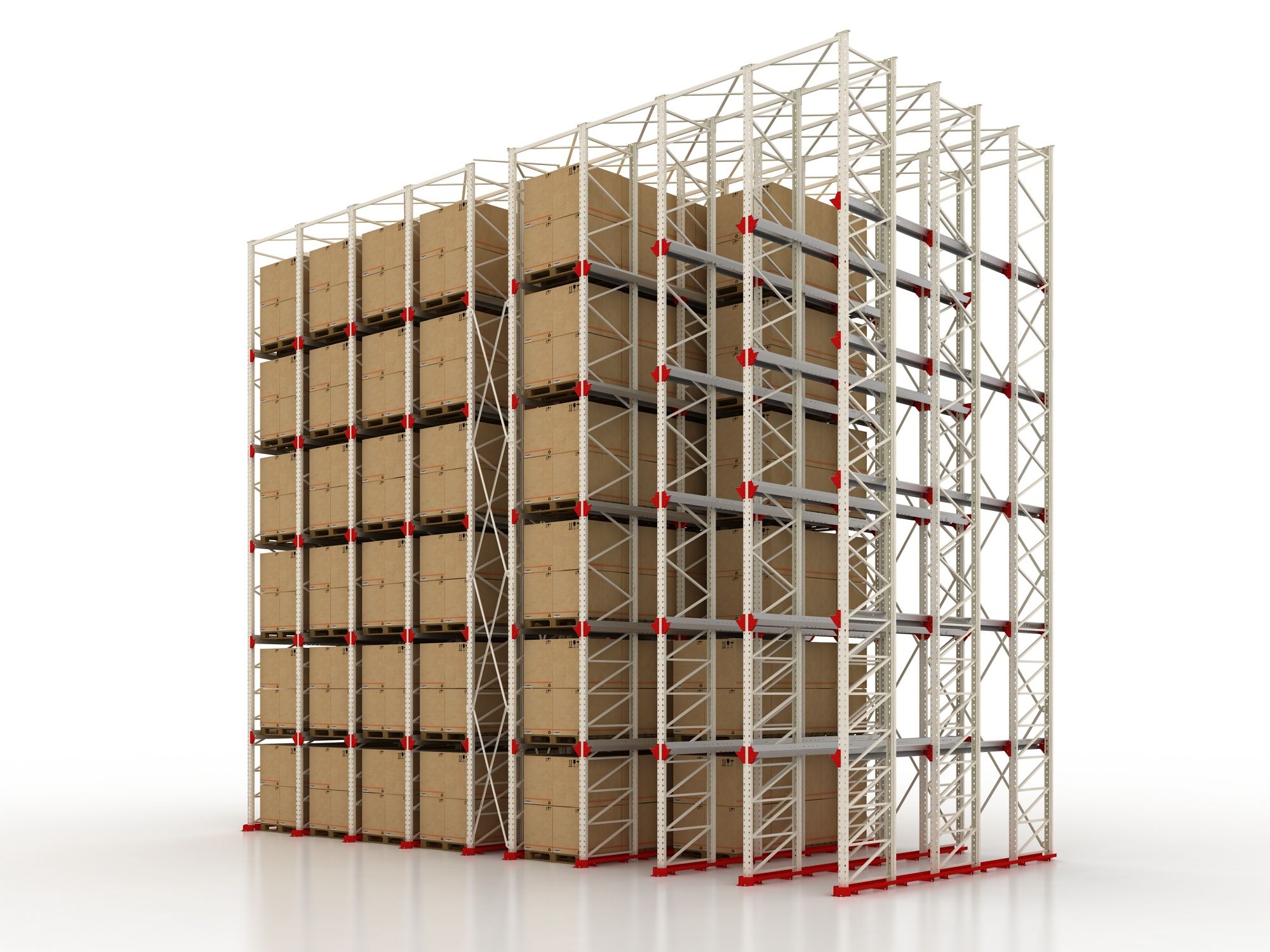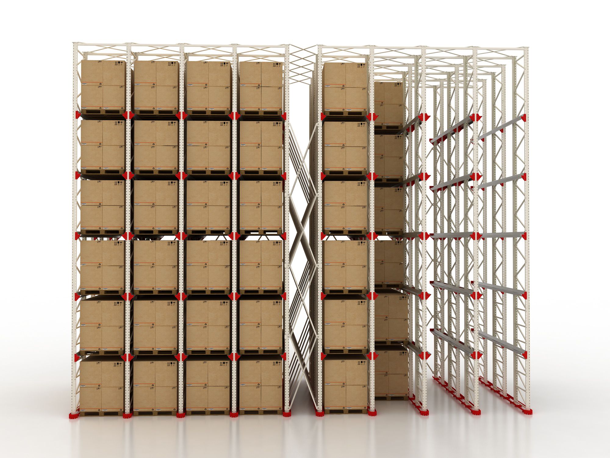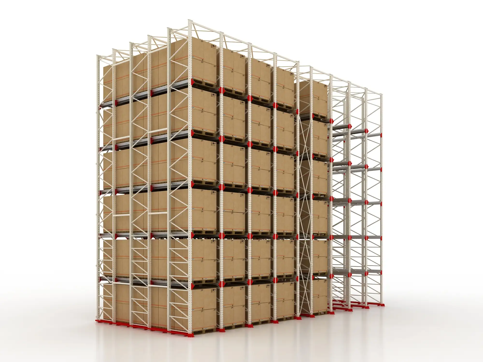 Rafturile Drive-in sunt concepute pentru depozitarea mărfurilor pe paleți compacți cu același tip de produse, cu un raport de rotație scăzut și o durată lungă de păstrare.