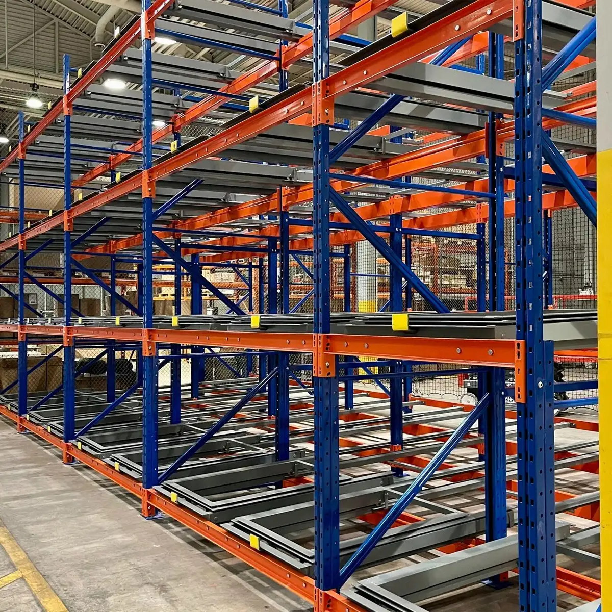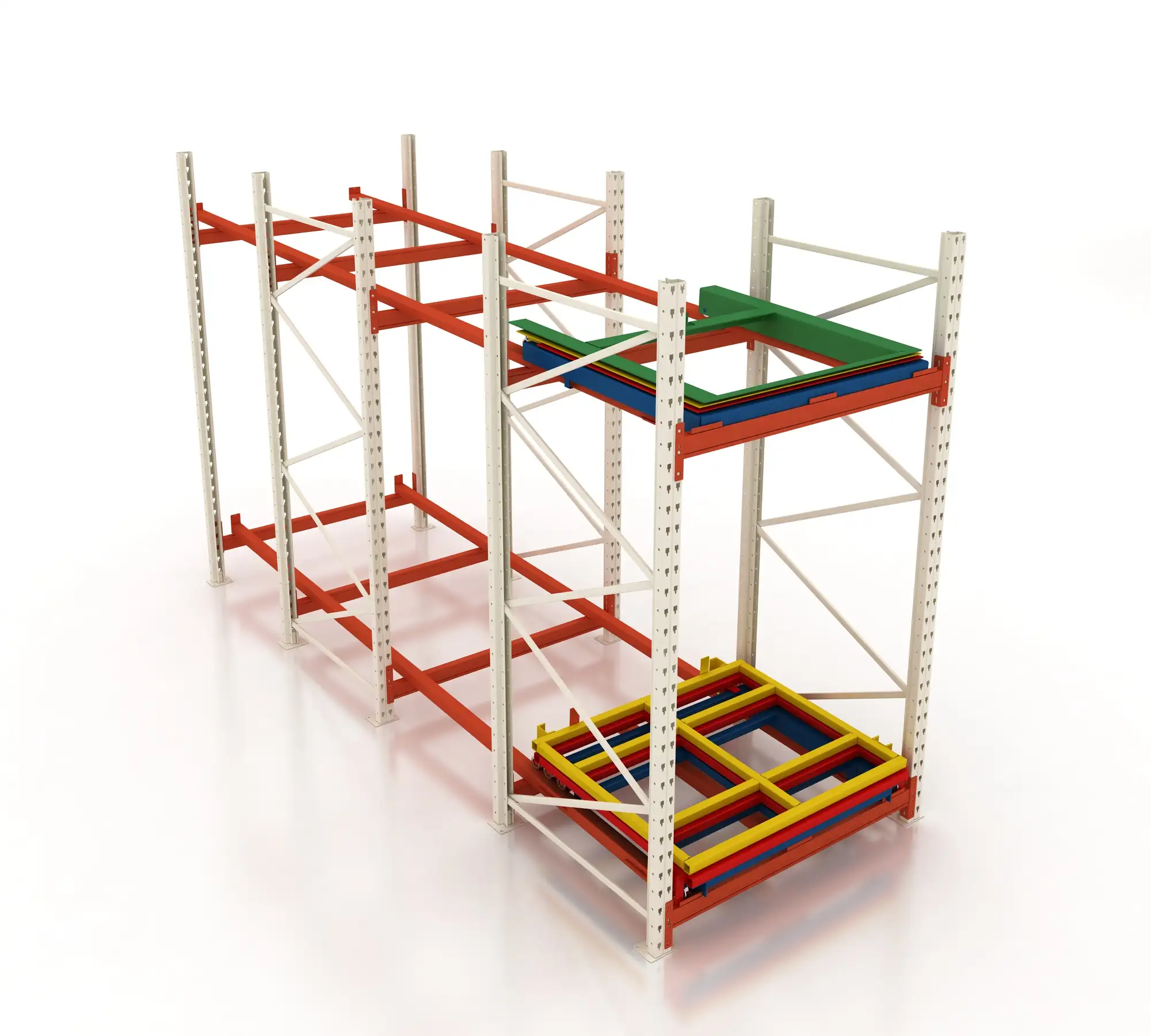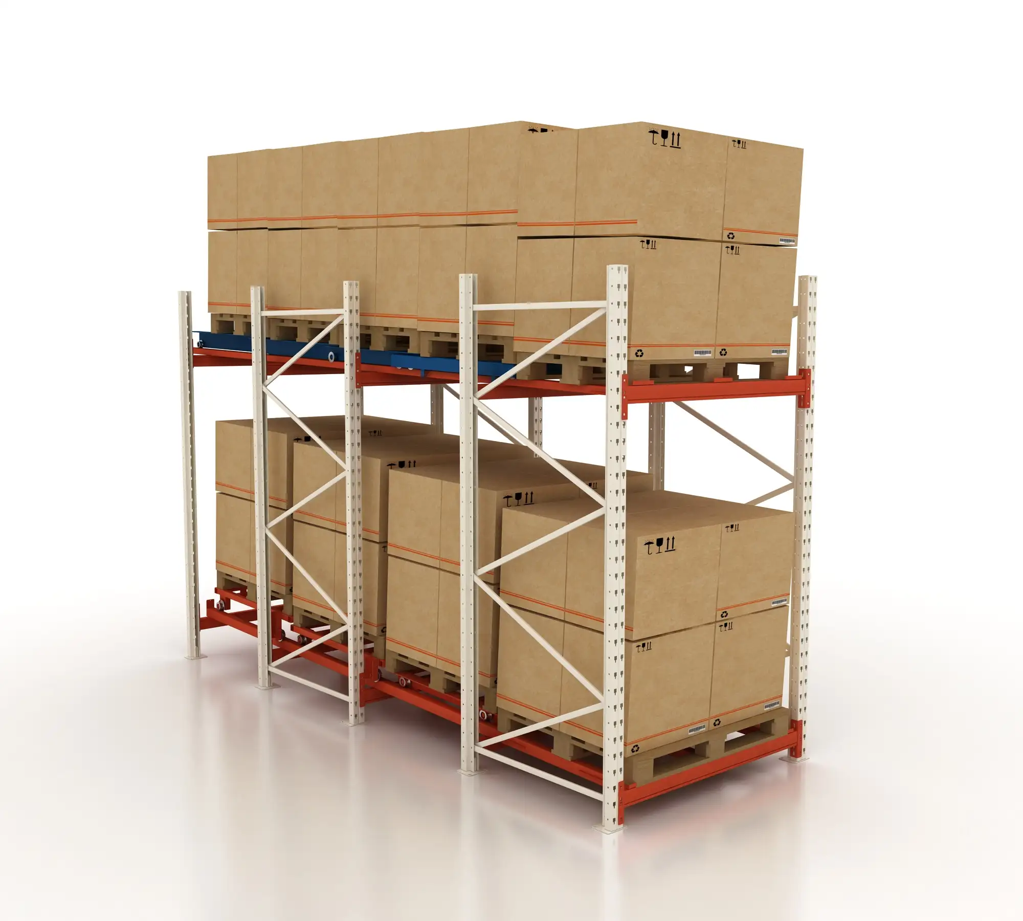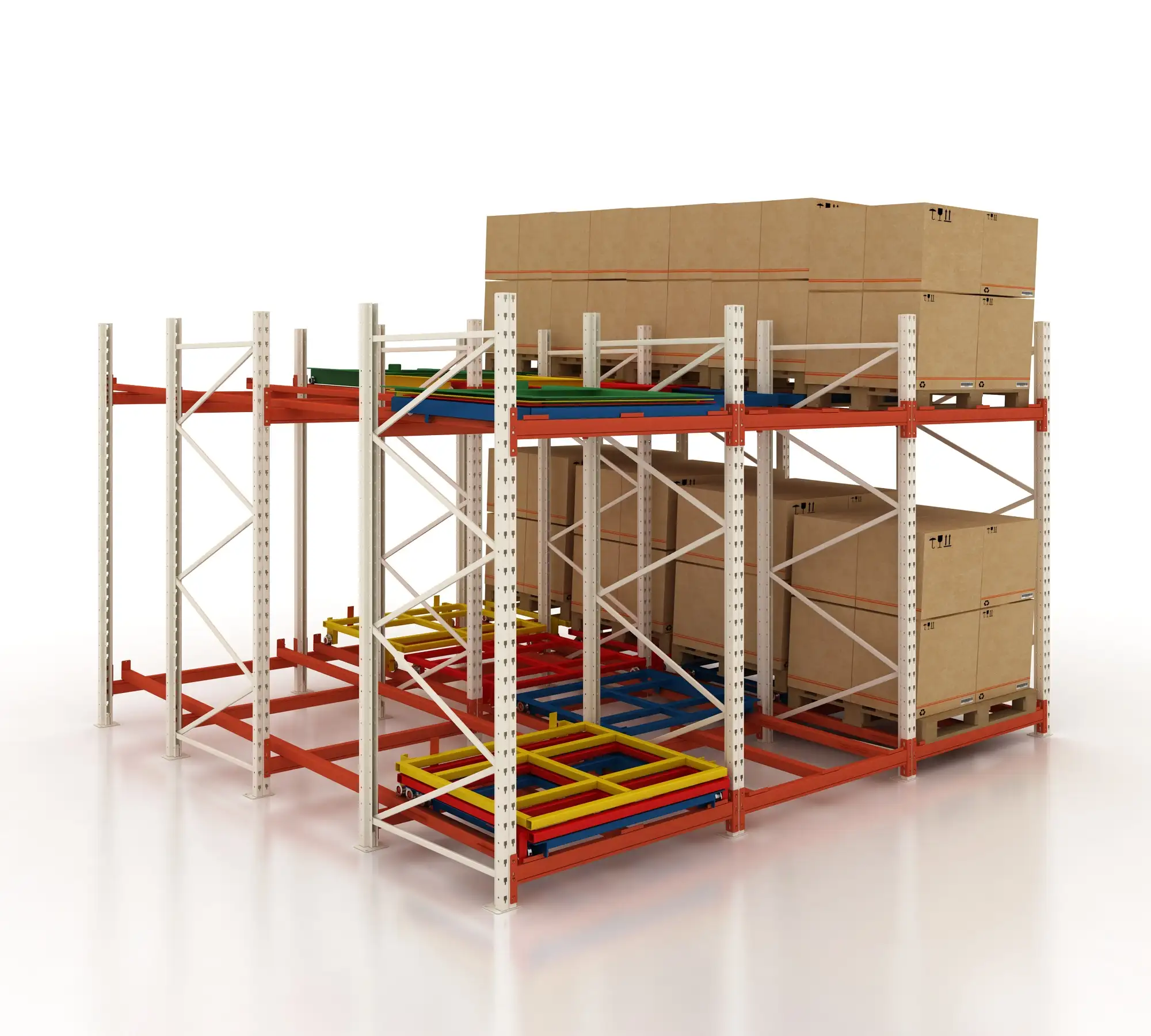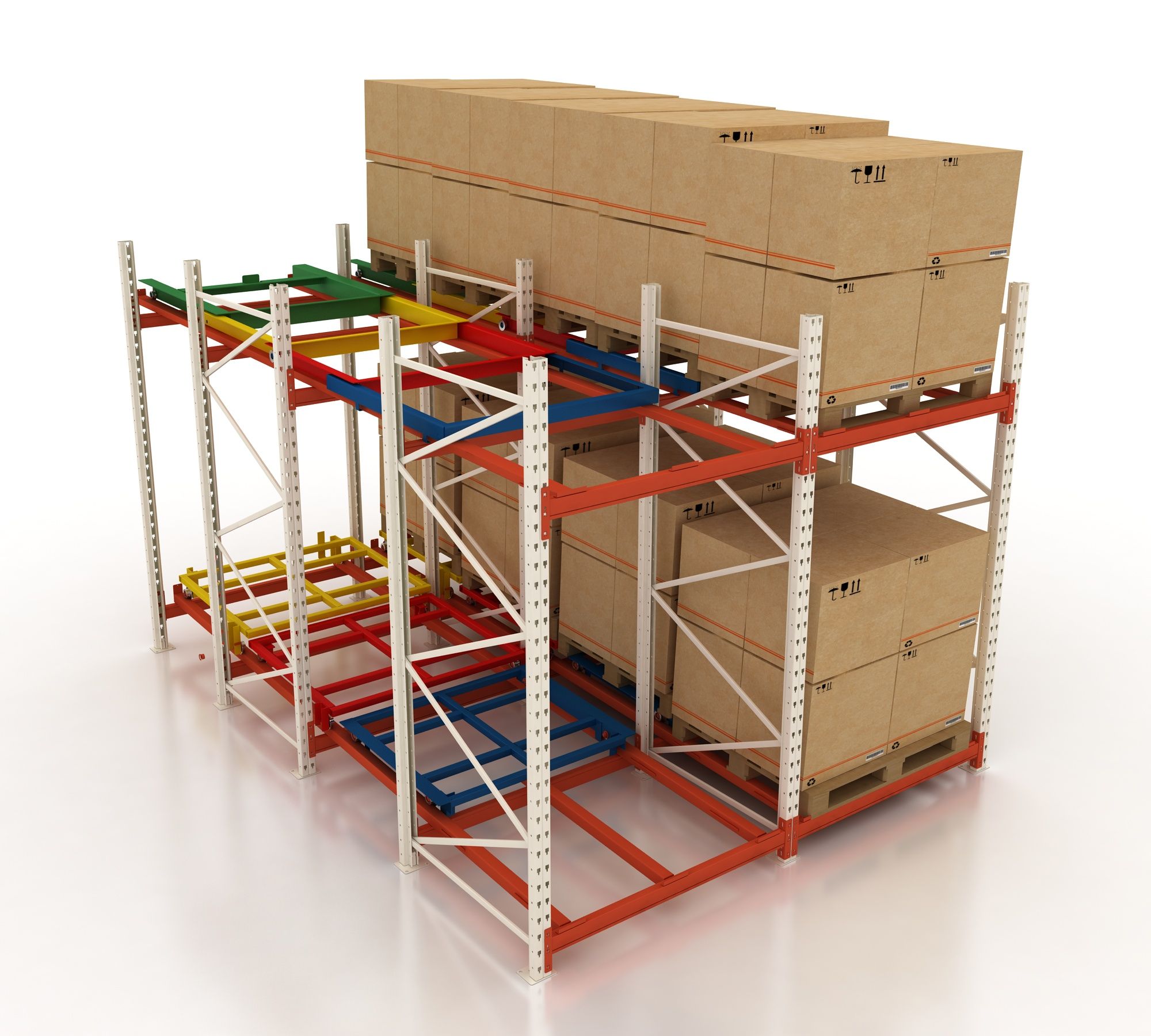 Pentru companii de producție, sistemele Push-Back combină caracteristicile gravitației, drive-in și rafturile frontale. Ajută la optimizarea spațiului de depozitare, deoarece diferite tipuri de mărfuri pot fi stocate pe fiecare nivel.