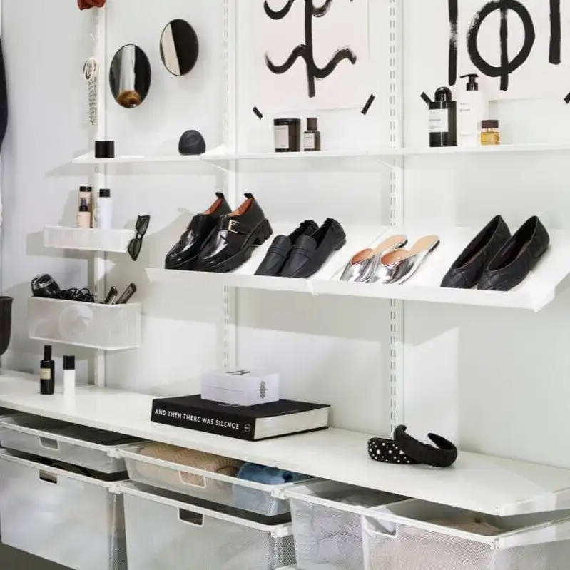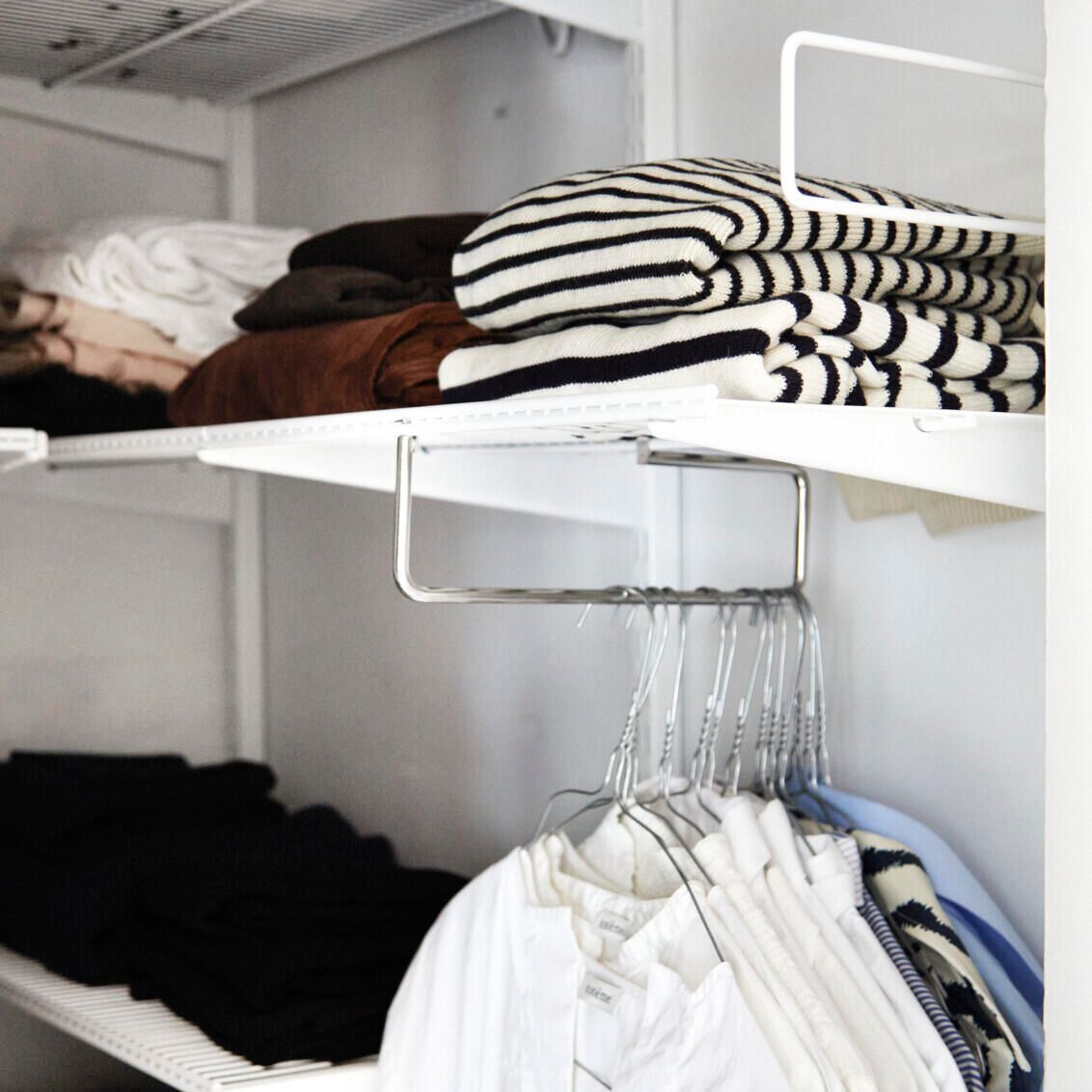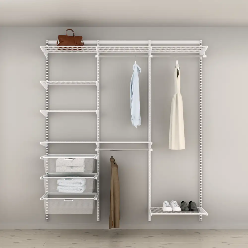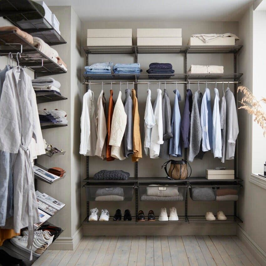 Soluție compactă și inteligentă de organizare pentru garderobe minimaliste care valorifică perfect spațiul vertical printr-un sistem de rafturi din sârmă cu adâncimi personalizabile și elemente modulare ce creează un aspect aerisit și ordonat. Accentul este pus pe depozitarea pe raftur ceea ce face această amenajare ideală pentru garderobe cu spațiu limitat. Rafturile din plasă permit o bună vizibilitate de jos, oferind o imagine clară asupra conținutului. Separatoarele mențin totul la locul lui, iar șina pentru umerașe montată dedesubt adaugă funcționalitate suplimentară. Un coș din plasă fixat pe ușă și secțiunea de rafturi îngustă transformă fiecare centimetru într-un spațiu valoros, perfect adaptat nevoilor tale.