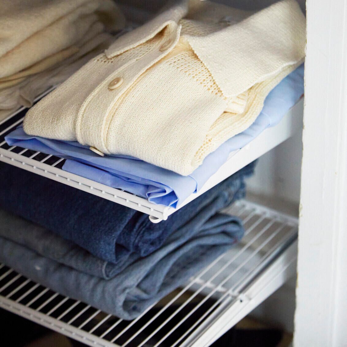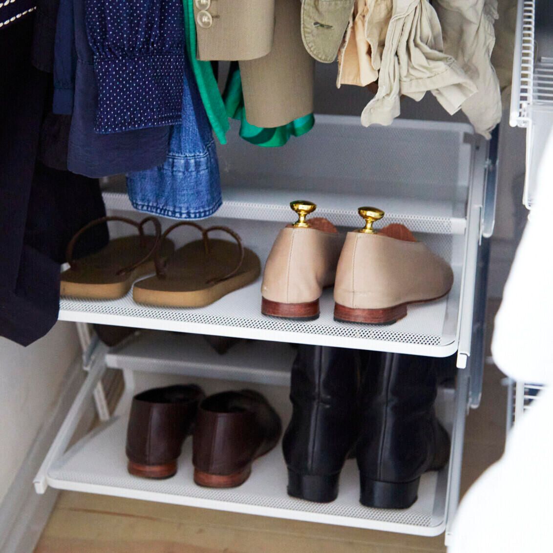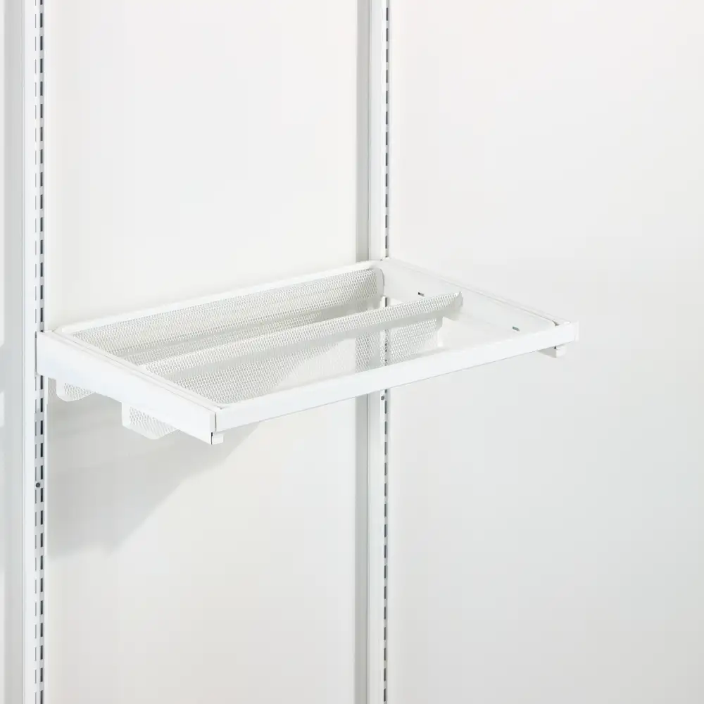 Soluție compactă și inteligentă de organizare pentru garderobe minimaliste care valorifică perfect spațiul vertical printr-un sistem de rafturi din sârmă cu adâncimi personalizabile și elemente modulare ce creează un aspect aerisit și ordonat. Accentul este pus pe depozitarea pe raftur ceea ce face această amenajare ideală pentru garderobe cu spațiu limitat. Rafturile din plasă permit o bună vizibilitate de jos, oferind o imagine clară asupra conținutului. Separatoarele mențin totul la locul lui, iar șina pentru umerașe montată dedesubt adaugă funcționalitate suplimentară. Un coș din plasă fixat pe ușă și secțiunea de rafturi îngustă transformă fiecare centimetru într-un spațiu valoros, perfect adaptat nevoilor tale.
