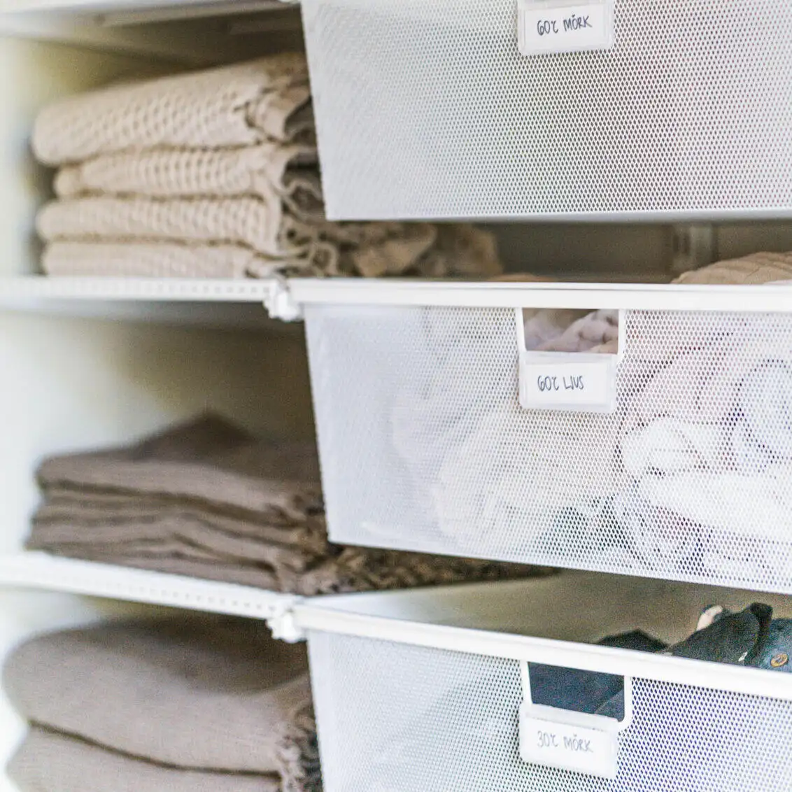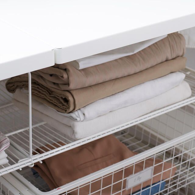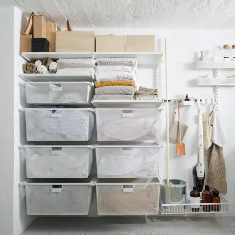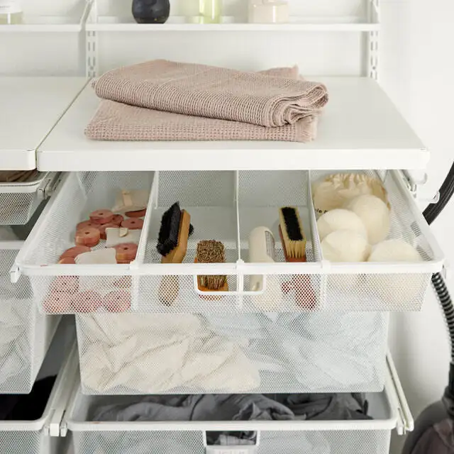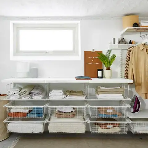 Soluție pentru organizarea camerei de spălătorie sau pivniță cu sistemul modular de la Elfa, care include sertare aerisite pentru haine, organizatoare pentru accesorii și detergenți, precum și o masă practică pentru împăturit rufele. Rafturile reglabile și componentele versatile permit personalizarea în funcție de nevoile tale. Ideală pentru spații mici sau dedicate, această stație de depozitare îți oferă tot ce ai nevoie pentru o rutină de spălare bine organizată, într-un design curat și funcțional.