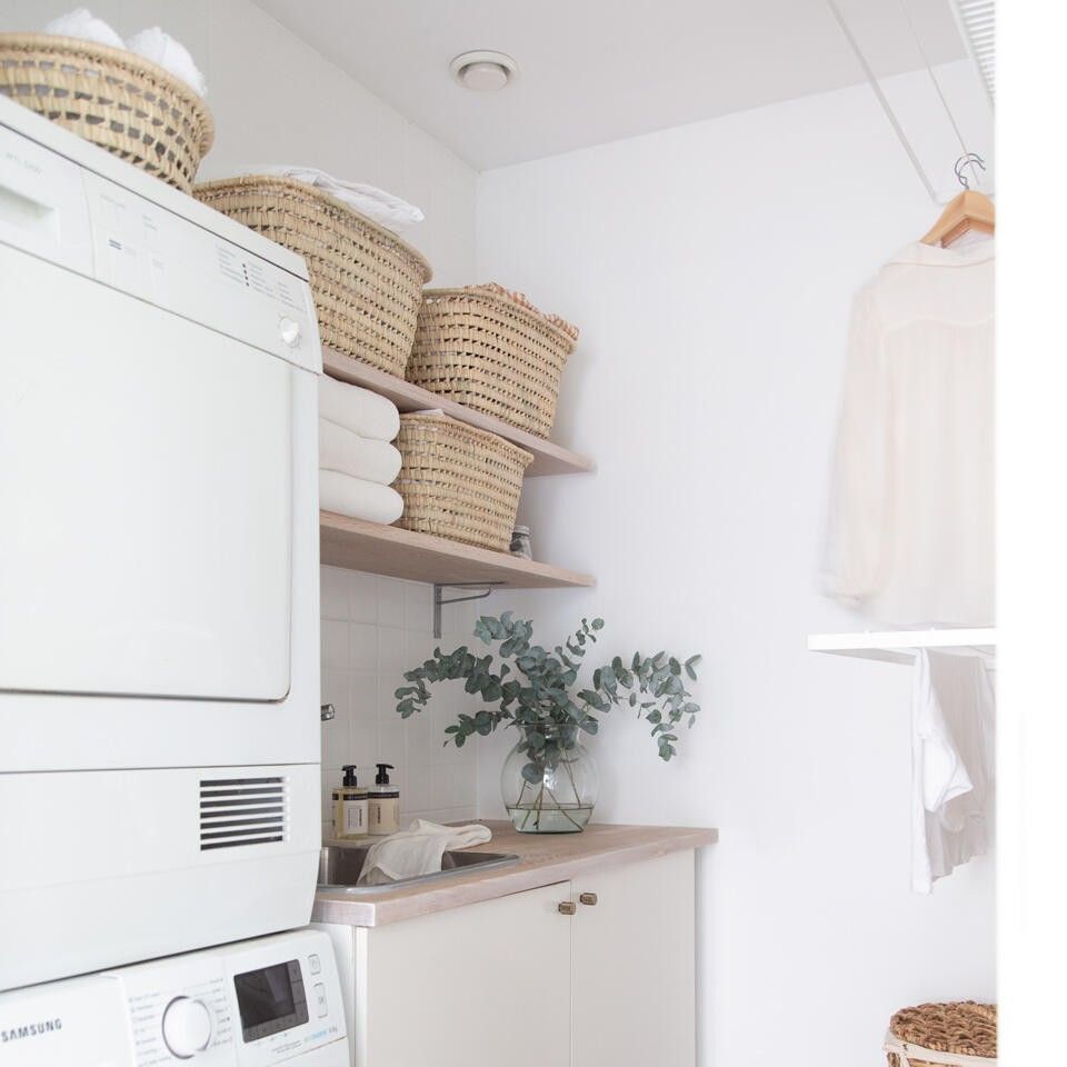 Într-o spălătorie inteligentă, este important să adaptați spațiul de depozitare la condițiile unice ale camerei. Plasați rafturi sau un suport de uscare deasupra mașinii de spălat pentru a maximiza spațiul și folosiți rafturi metalice mai puțin adânci pentru a trece cu ușurință peste țevile vizibile. Aveți o fereastră de luat în considerare? Optați pentru soluții de depozitare joase, care oferă spațiu de depozitare practic fără a bloca lumina.