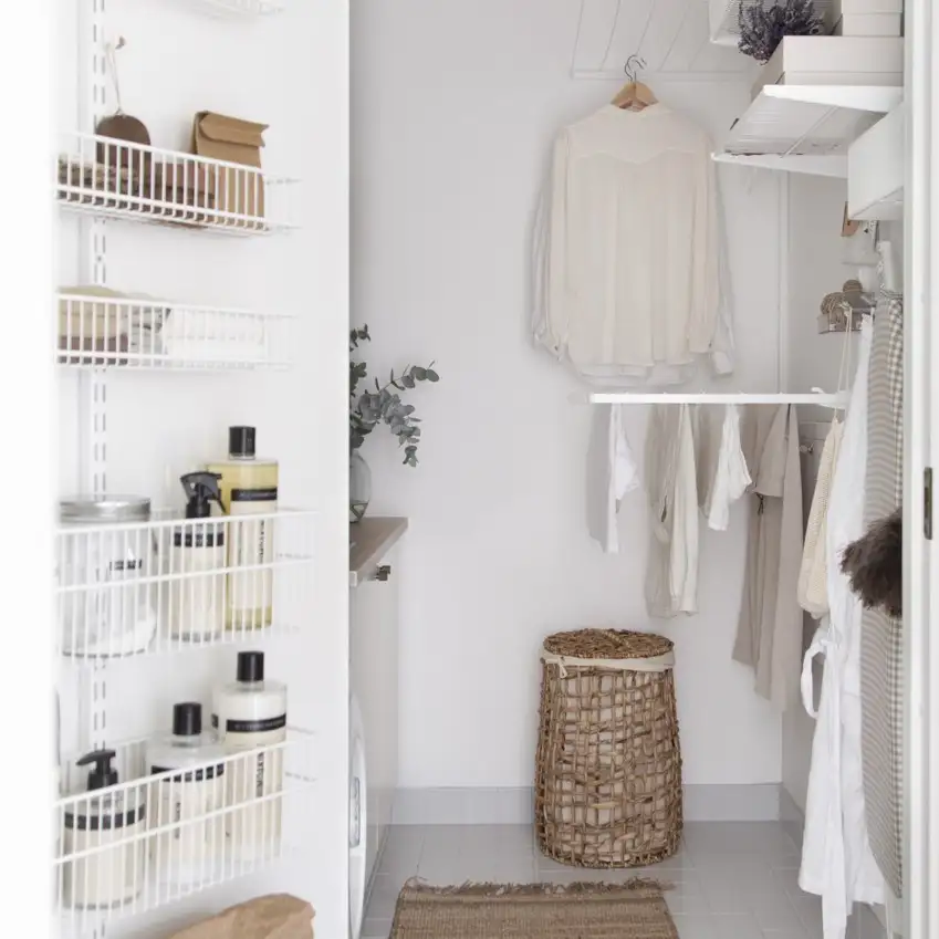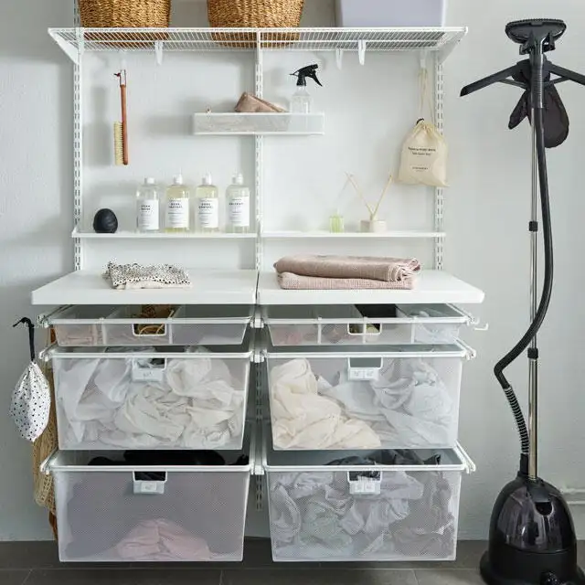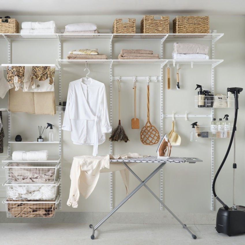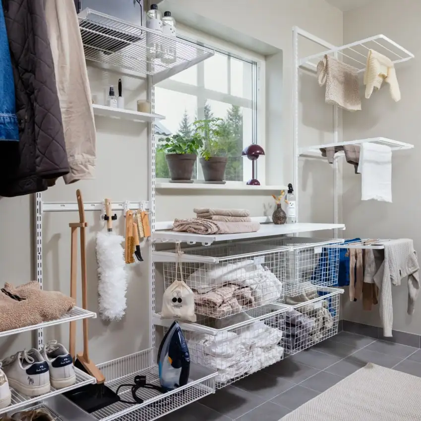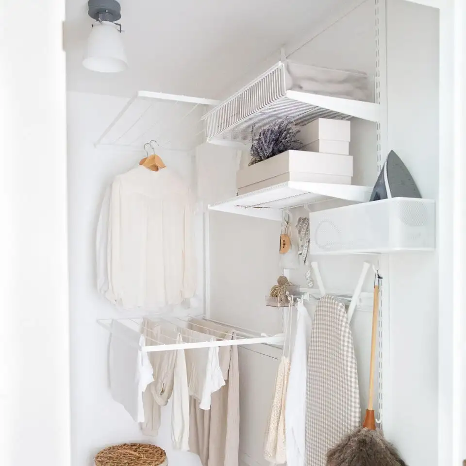 Această soluție de depozitare atractivă și funcțională de la Elfa este concepută pentru a valorifica la maximum fiecare colț al spațiului disponibil. Cu rafturi reglabile, coșuri metalice ventilate, bare pentru umerașe și suporturi pentru uscarea hainelor, sistemul modular oferă flexibilitate totală și o organizare clară. Ideal pentru spălătorii, dressinguri sau camere tehnice, designul aerisit menține totul la vedere și ușor de accesat. Cutii textile sau din răchită completează armonios zona de depozitare, păstrând un aspect elegant și ordonat în orice încăpere.