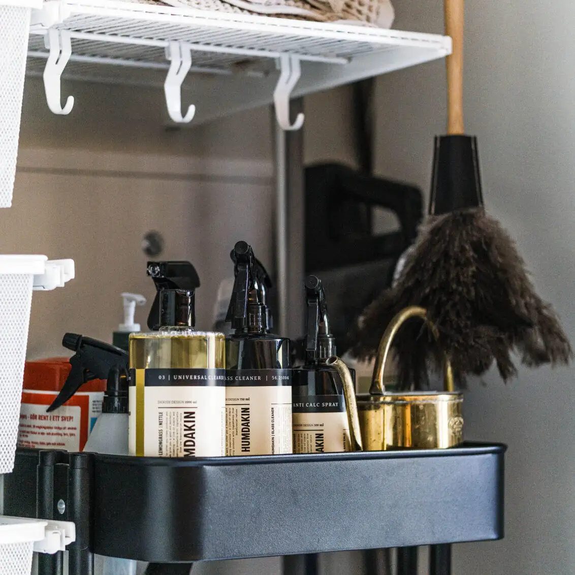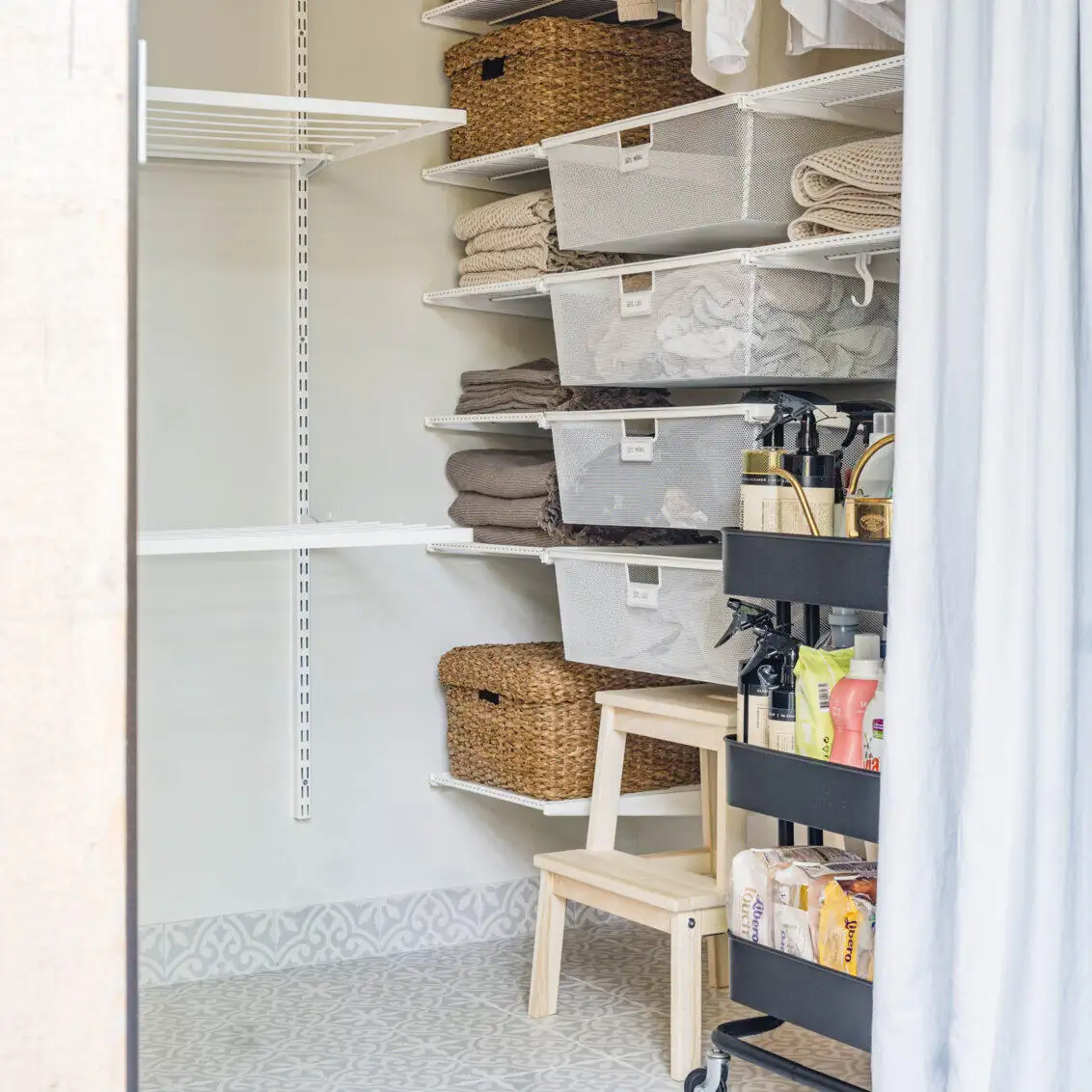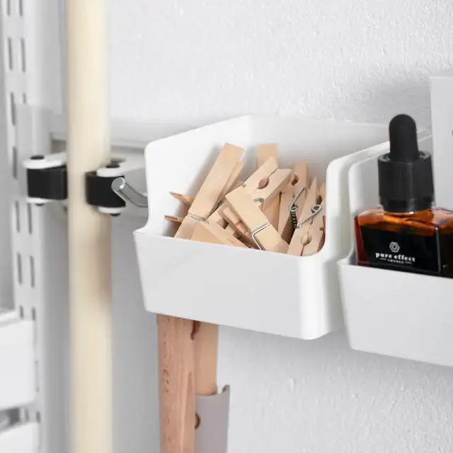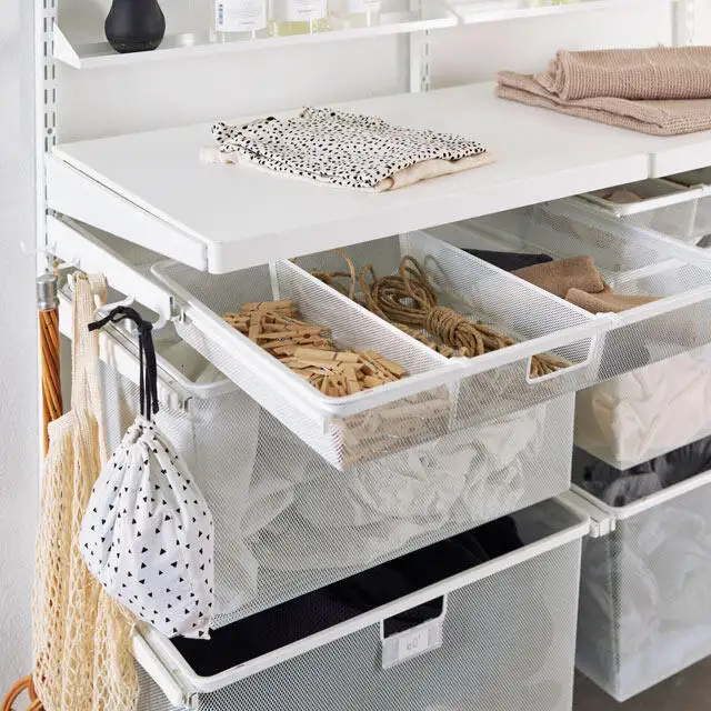 Această soluție de depozitare atractivă și funcțională de la Elfa este concepută pentru a valorifica la maximum fiecare colț al spațiului disponibil. Cu rafturi reglabile, coșuri metalice ventilate, bare pentru umerașe și suporturi pentru uscarea hainelor, sistemul modular oferă flexibilitate totală și o organizare clară. Ideal pentru spălătorii, dressinguri sau camere tehnice, designul aerisit menține totul la vedere și ușor de accesat. Cutii textile sau din răchită completează armonios zona de depozitare, păstrând un aspect elegant și ordonat în orice încăpere.