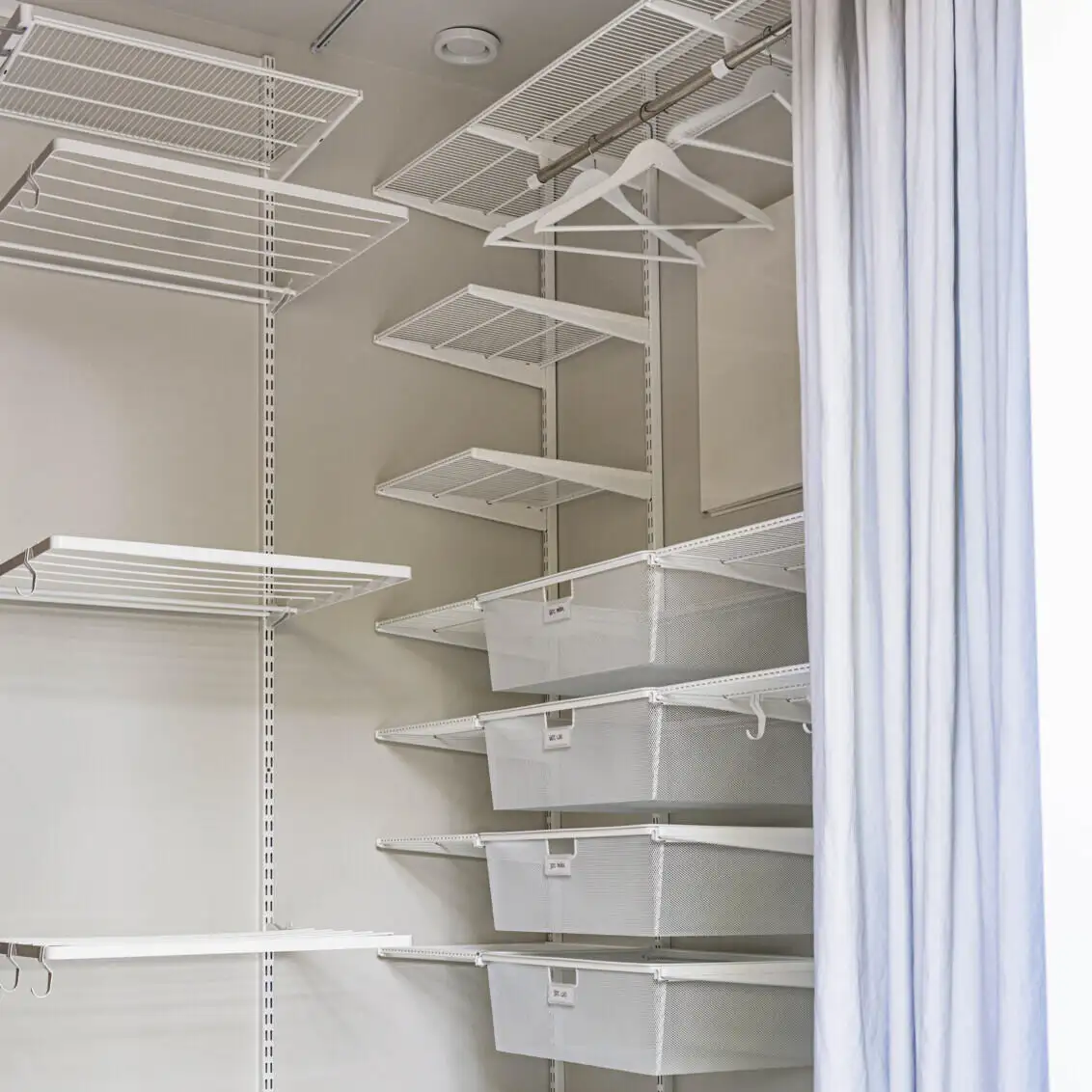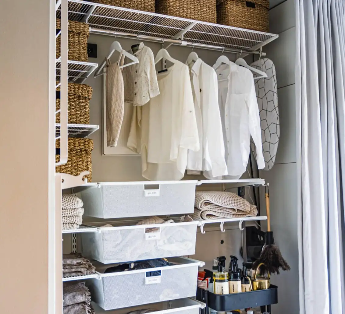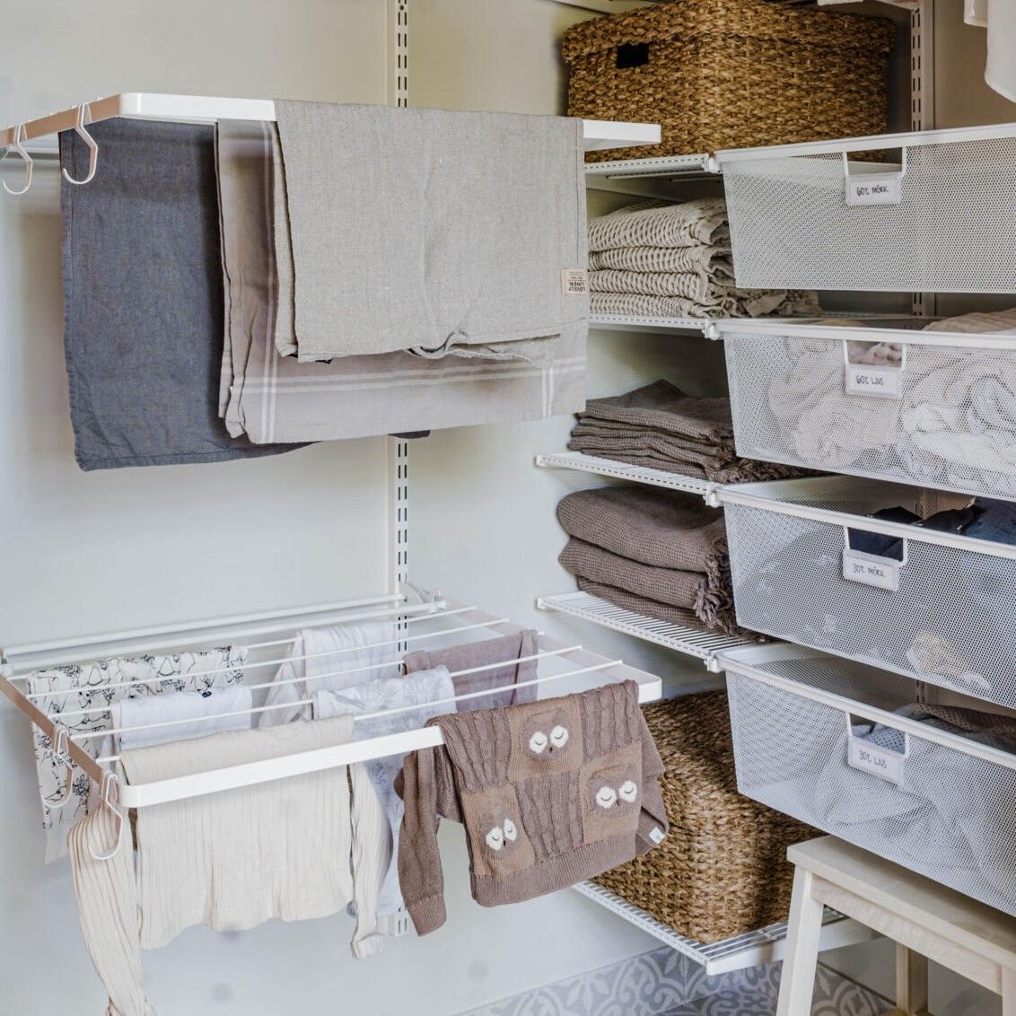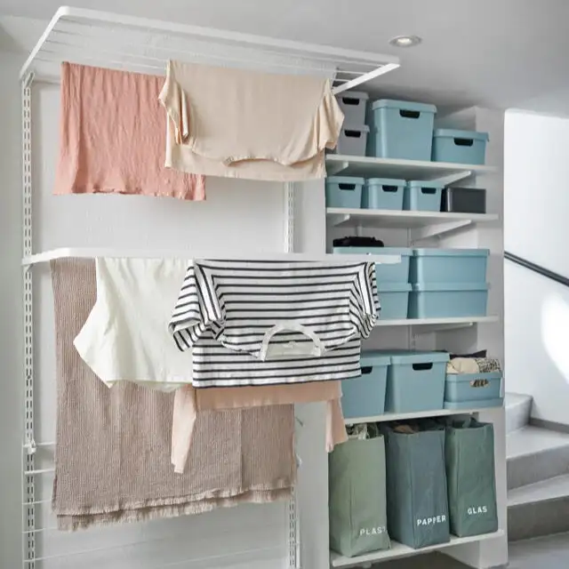 Soluție inteligentă de uscare a hainelor de la Elfa este ideală pentru orice cameră de spălătorie, pivniță sau spațiu tehnic. Sistemul vertical cu suporturi rabatabile oferă multiple niveluri pentru uscarea rufelor, economisind spațiu și asigurând o bună circulație a aerului. Structura modulară permite ajustarea în funcție de nevoi, iar integrarea cu rafturi și cutii de depozitare adaugă un plus de organizare. Perfectă pentru familii active sau locuințe compacte, această soluție te ajută să usuci hainele eficient, într-un mod practic și ordonat.