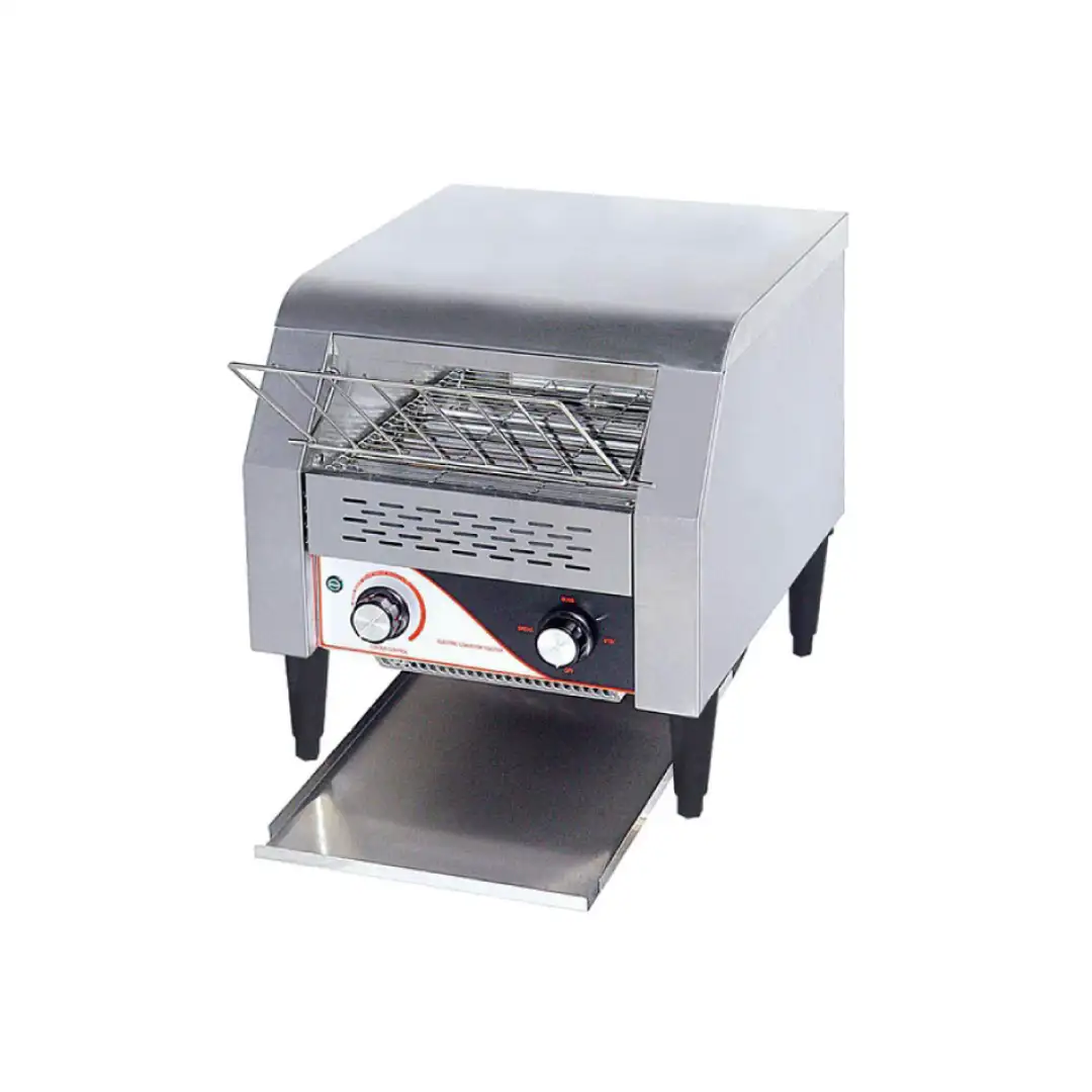 Prăjitor profesional de pâine cu bandă transportoare, pentru cafenele și bucătării comerciale, construcție din inox.