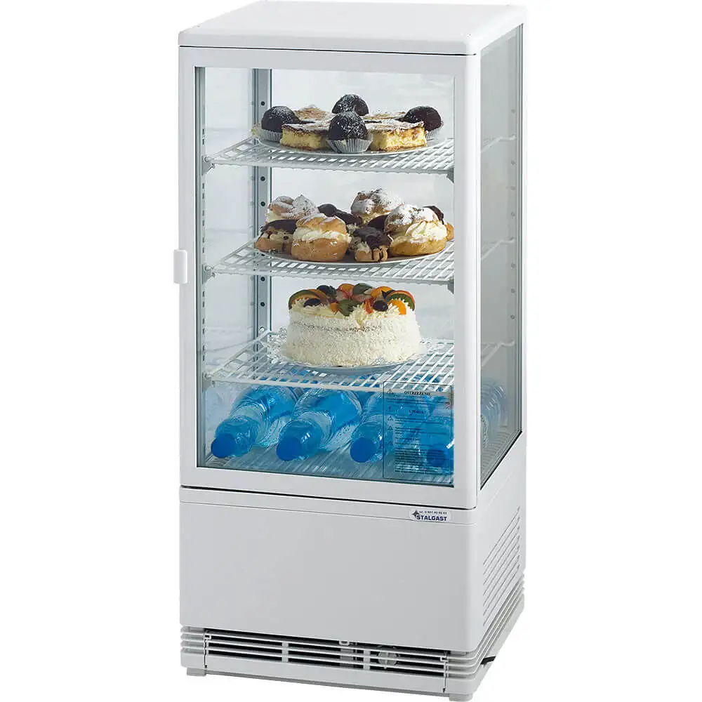 Vitrina frigorifică de 78 litri este ideală pentru expunerea elegantă și eficientă a produselor alimentare în spații comerciale. Construcția cu pereți din sticlă pe toate laturile oferă vizibilitate completă, punând în valoare produsele din orice unghi.