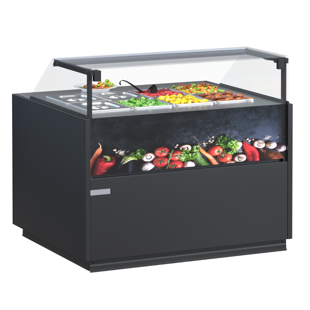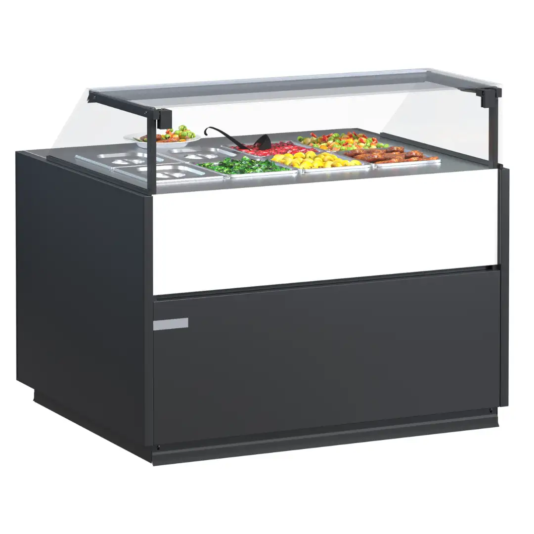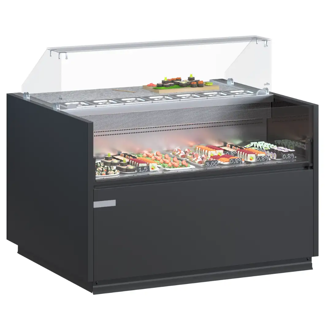 Iluminarea LED de înaltă calitate asigură luminozitate și atrage atenția asupra produselor. Blatul de lucru mărit facilitează servirea, spațiul de depozitare răcit menține prospețimea stocurilor. Acoperire cu pulbere sau oțel inoxidabil garantează durabilitatea. Ventilatoare EC integrate și supapă de expansiune oferă funcționare stabilă și eficiență energetică.