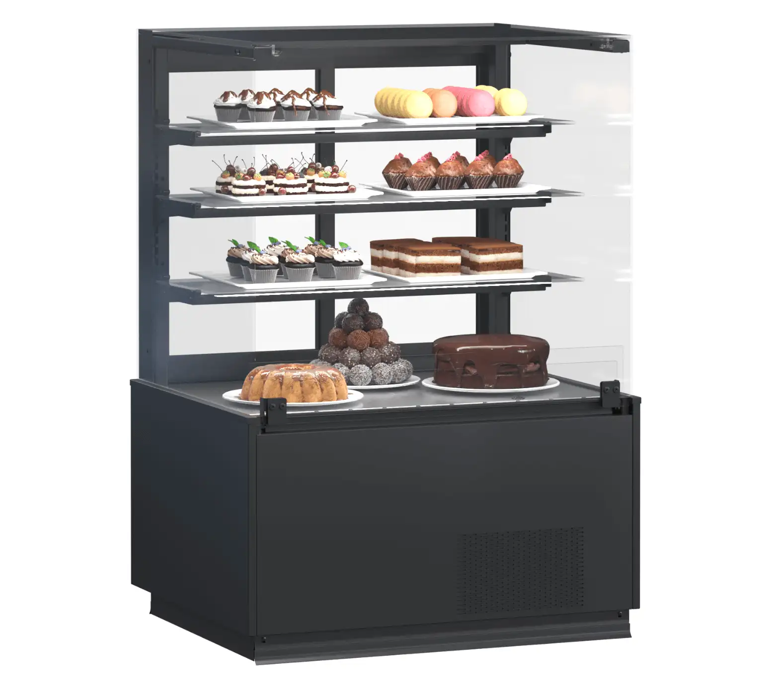 Panourile laterale și rafturile din sticlă asigură o vizibilitate clară, iar ușile glisante permit acces facil. Plăcile de afișare, realizate din oțel inoxidabil sau acoperite cu vopsea pulbere durabilă, conferă rezistență și design modern. Vitrină patiserie QuadroStream, echipament frigorific ideal pentru comercializarea confiturilor, prăjiturilor și produselor de patiserie.