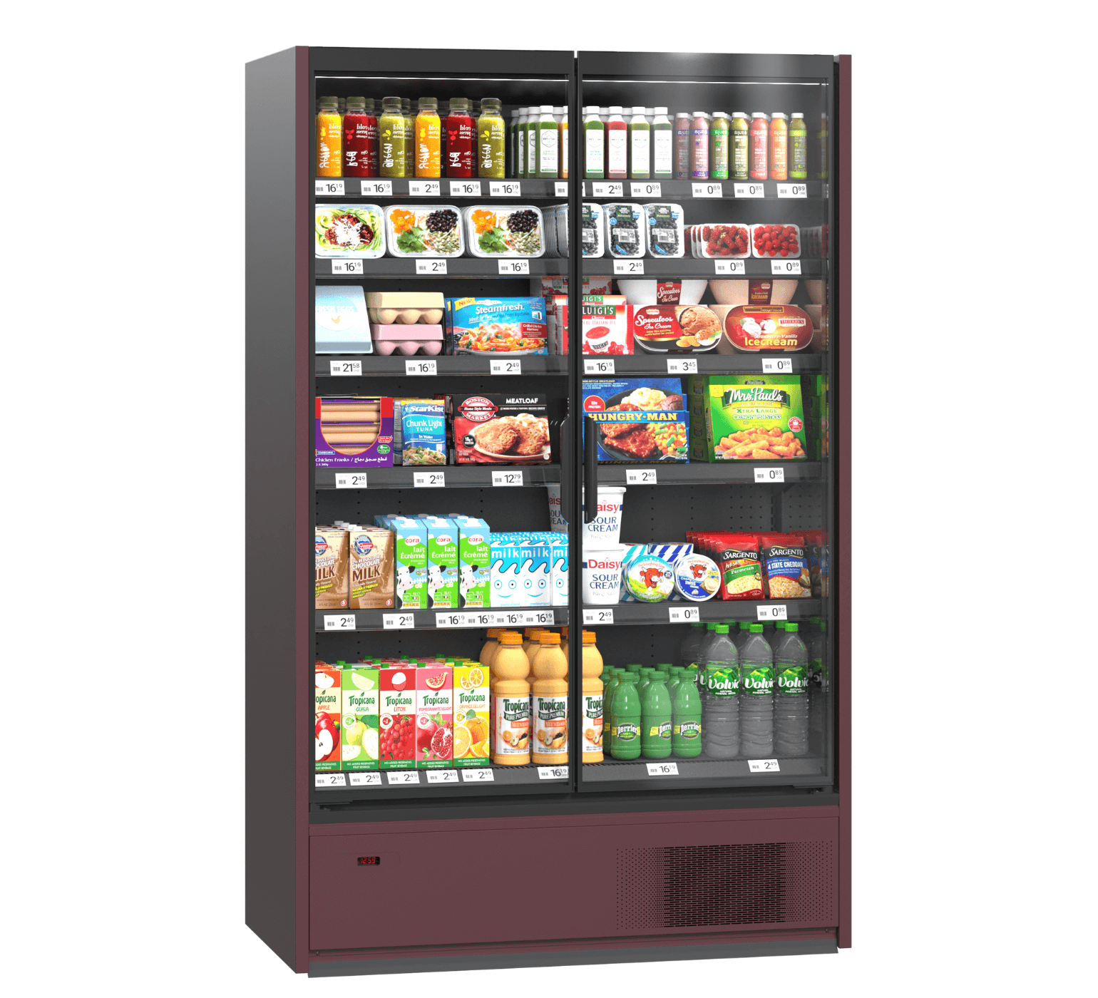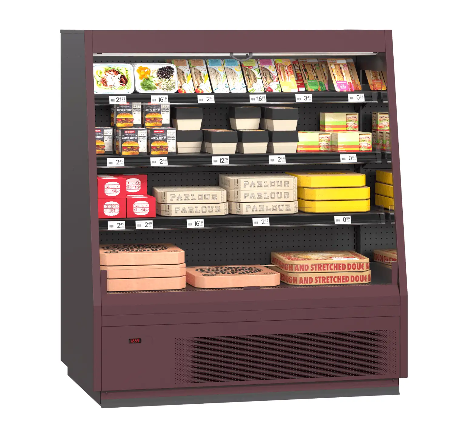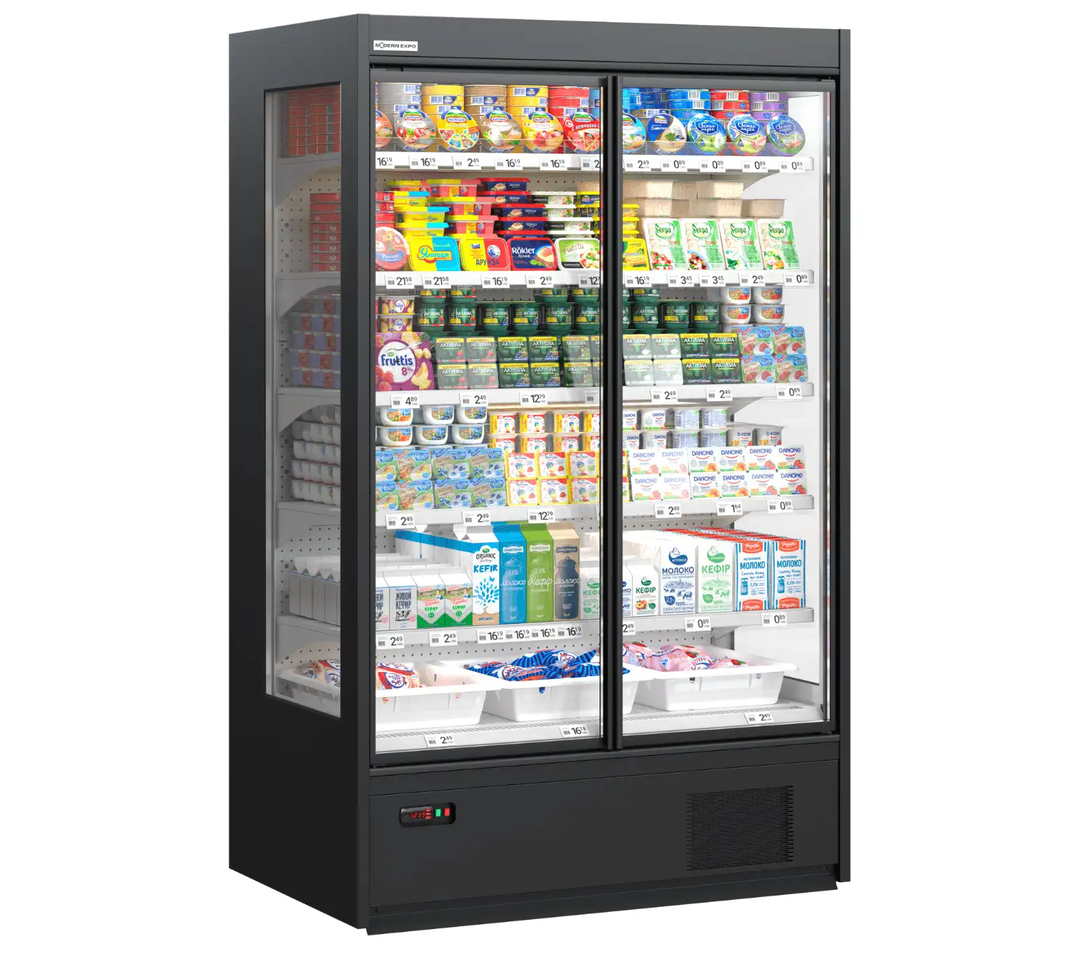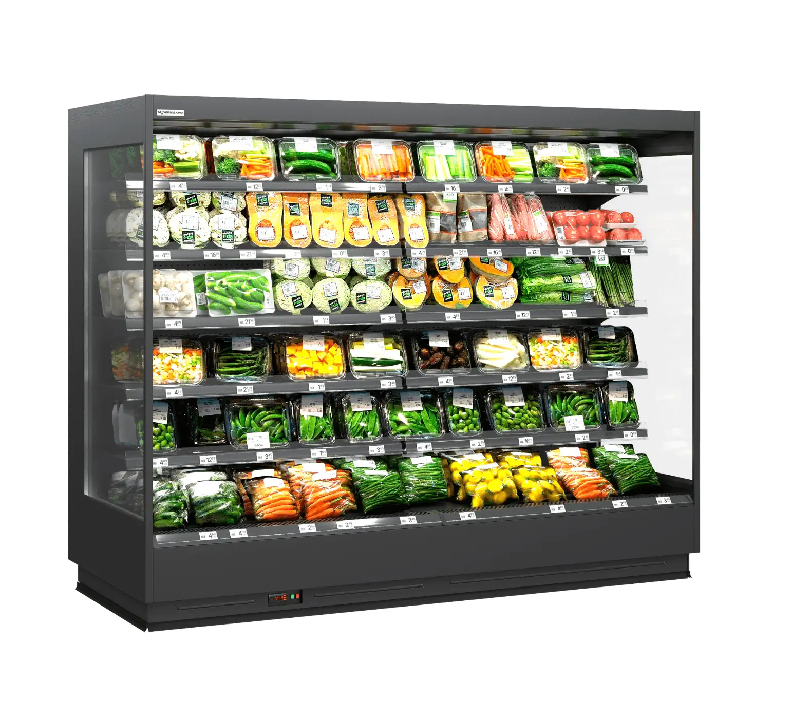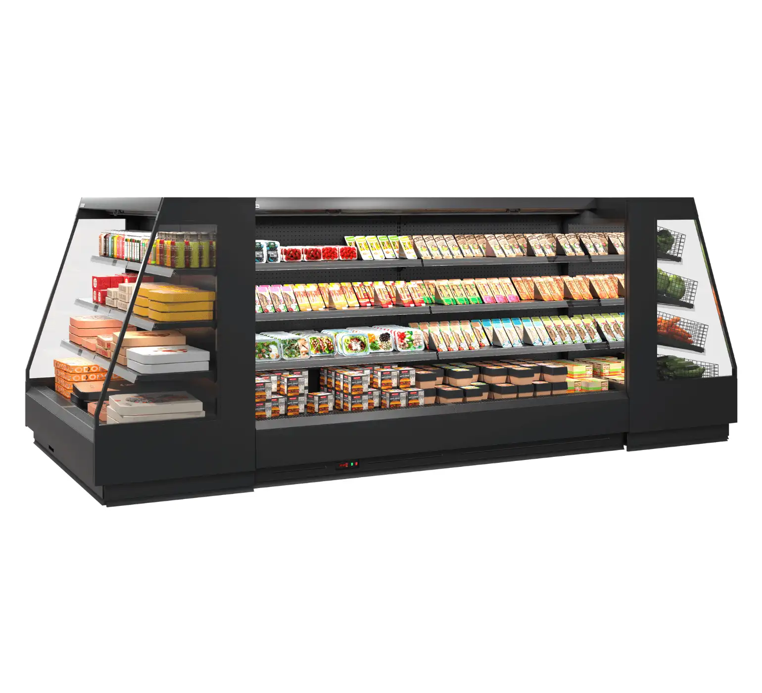 Vitrină frigorifică modernă pentru echipamente comerciale și frigorifice pentru retail. Fiabilă și eficientă energetic, echipată cu ventilatoare EC de înaltă tehnologie și sistem integrat de control. Universală pentru instalare: configurație liniară sau insulă, cu rafturi reglabile pe înălțime pentru alimente uscate și fructe FRUTTERA. Iluminarea LED superioară și pentru rafturi asigură o expunere luminoasă a produselor. Opțiuni suplimentare: cârlige pentru cârnați, iluminare LED verticală, panouri laterale oglinzi sau opace, precum și separatoare pentru o organizare eficientă în spațiile comerciale.