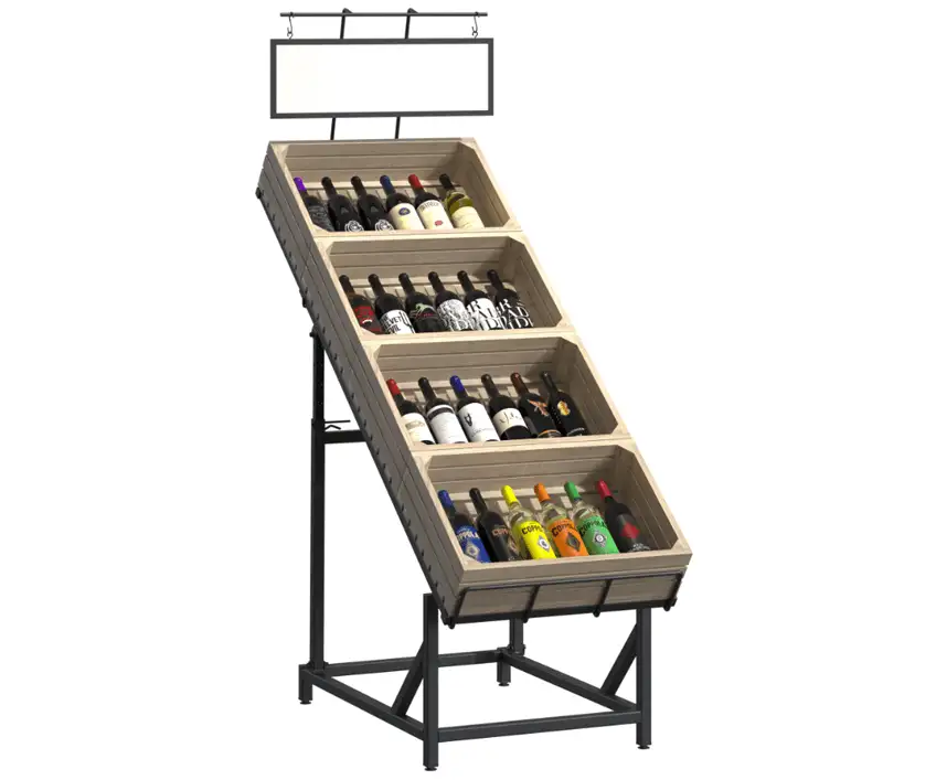 Vitrina cu unghi de înclinare reglabil reprezintă o soluție de mobilier comercial, concepută pentru prezentarea eficientă a sticlelor de vin,oferind acces rapid și o organizare clară în magazine, supermarketuri și vinoteci. Structura vitrinei pentru băuturi alcoolice include un cadru tubular metalic solid și cutii din lemn, iar partea inferioară este echipată cu suporturi stabile, funcționale și estetice, asigurând o experiență vizuală premium și un suport pentru vinuri ideal în orice context comercial.