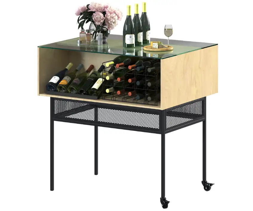 Vitrina mobilă pentru băuturi alcoolice este soluția ideală pentru vinoteci, magazine specializate și zone promoționale din supermarketuri. Construcția include picioare metalice, blat din sticlă călită și compartiment din PAL cu cutii de sârmă. Designul permite o prezentare la 360° și aranjarea sticlelor în poziție verticală, orizontală sau înclinată. Funcționează excelent în depozite ca raft pentru sticle de vin și pentru alte băuturi alcoolice, oferind suporturi elegante și accesibile.