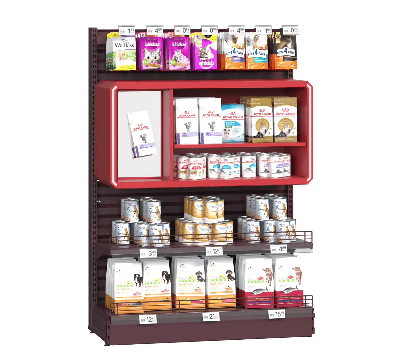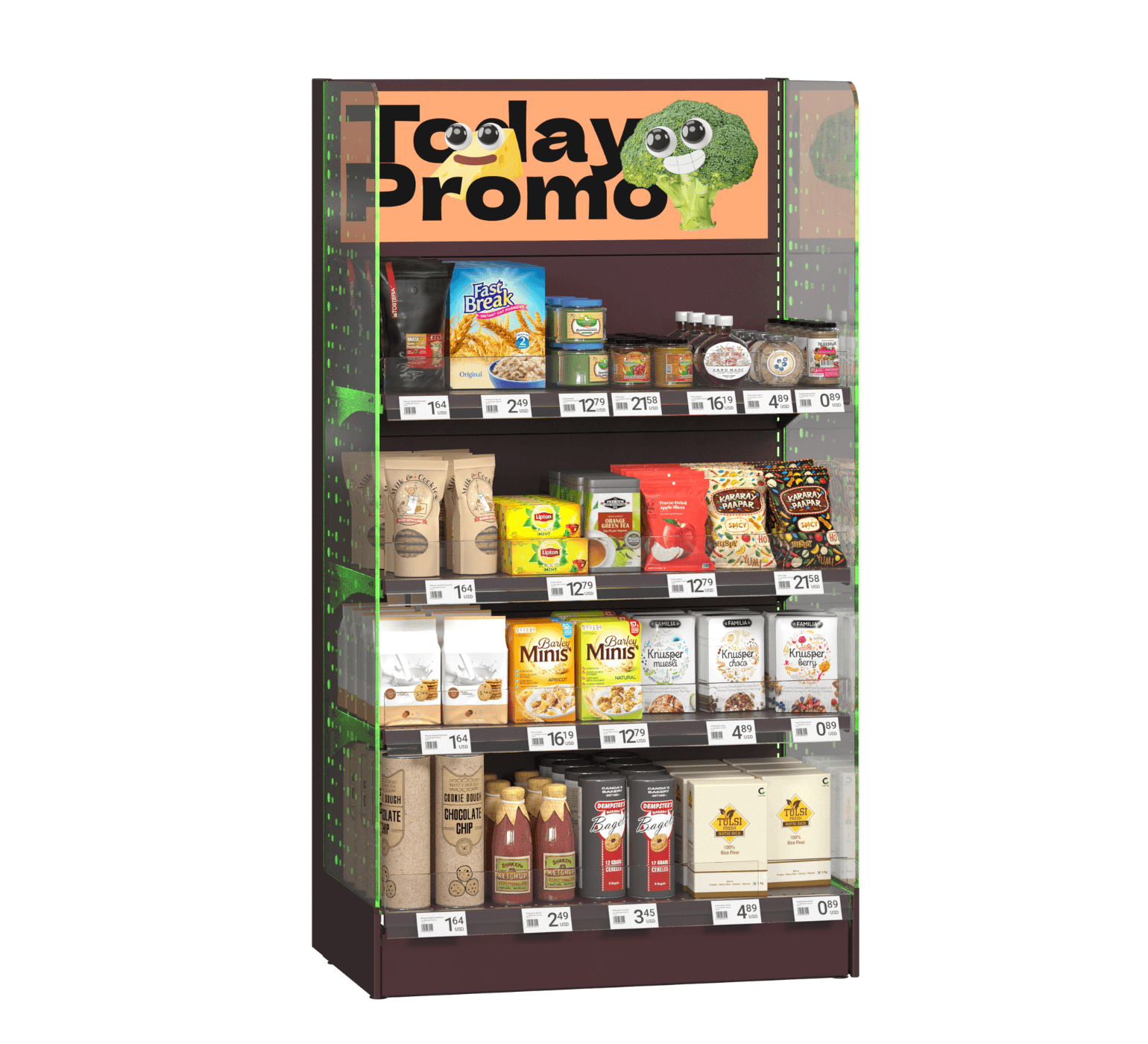 Unitate promoțională modernă, prevăzută cu rafturi metalice reglabile, panouri laterale acrilice cu iluminare LED și cutie luminoasă lightbox pentru branding vizibil. Vitrina a fost concepută pentru a evidenția oferte speciale, promoții sezoniere și lansări de produse, fiind o soluție de mobilier comercial care atrage atenția clienților și stimulează decizia de cumpărare direct la raft. Designul modular și robust permite adaptarea la diferite tipuri de produse, de la alimente și băuturi la articole de uz zilnic, fiind ideală pentru supermarketuri și magazine moderne.