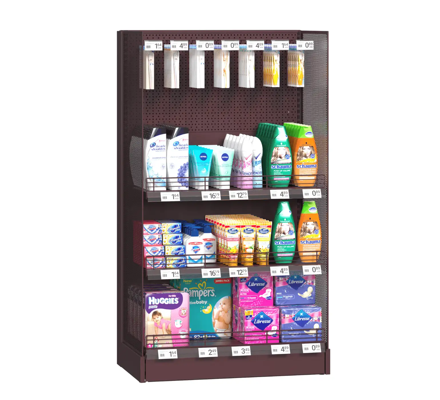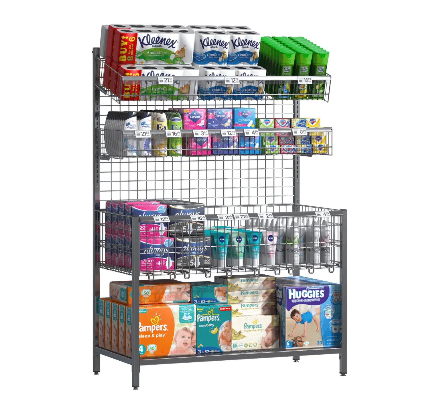 Acest raft promoțional vertical este parte din mobilierul comercial destinat zonelor de promoții și este proiectat pentru a evidenția produse de îngrijire personală sau alte articole de consum rapid. Având o structură metalică robustă, rafturi reglabile și panouri perforate, oferă flexibilitate maximă în organizarea și prezentarea mărfii. Panourile laterale din plasă cu tăiere și întindere, barierele din sârmă și cârligele ajustabile pe înălțime și dimensiune permit adaptarea la diverse tipuri de produse, de la cosmetice și detergenți până la articole de igienă și accesorii. Ideal pentru supermarketuri, buticuri sau spații comerciale moderne, acest tip de raft este o soluție versatilă pentru standuri promoționale, campanii sezoniere și oferte speciale. Designul său funcțional nu doar optimizează expunerea produselor, ci și atrage atenția clienților, contribuind la creșterea vânzărilor și la o experiență de cumpărare mai plăcută.
